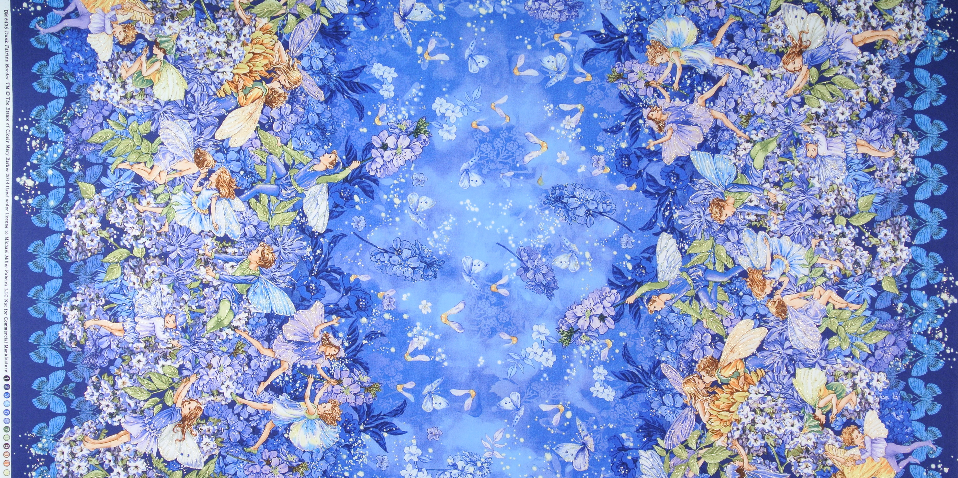 Dusk Fairies - Patchworkbordürenstoff mit Elfen in der Abendämmerung. Wunderschön für Patchwork und Dekorationen. Die Elfen sind zart mit Gold bestäubt. Die Bordüren verlaufen Parallel zur Webkante (s. Abb.).