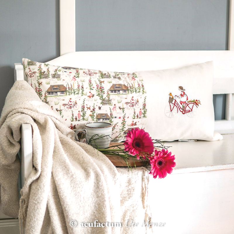 Einzigartiger Baumwollstoff "Sommerdorf" von acufactum mit zauberhaften Motiven aus einem kleinen Dorf mit spielenden Kindern und idyllischen Häusern aus der Feder der Designerin Daniela Drescher.