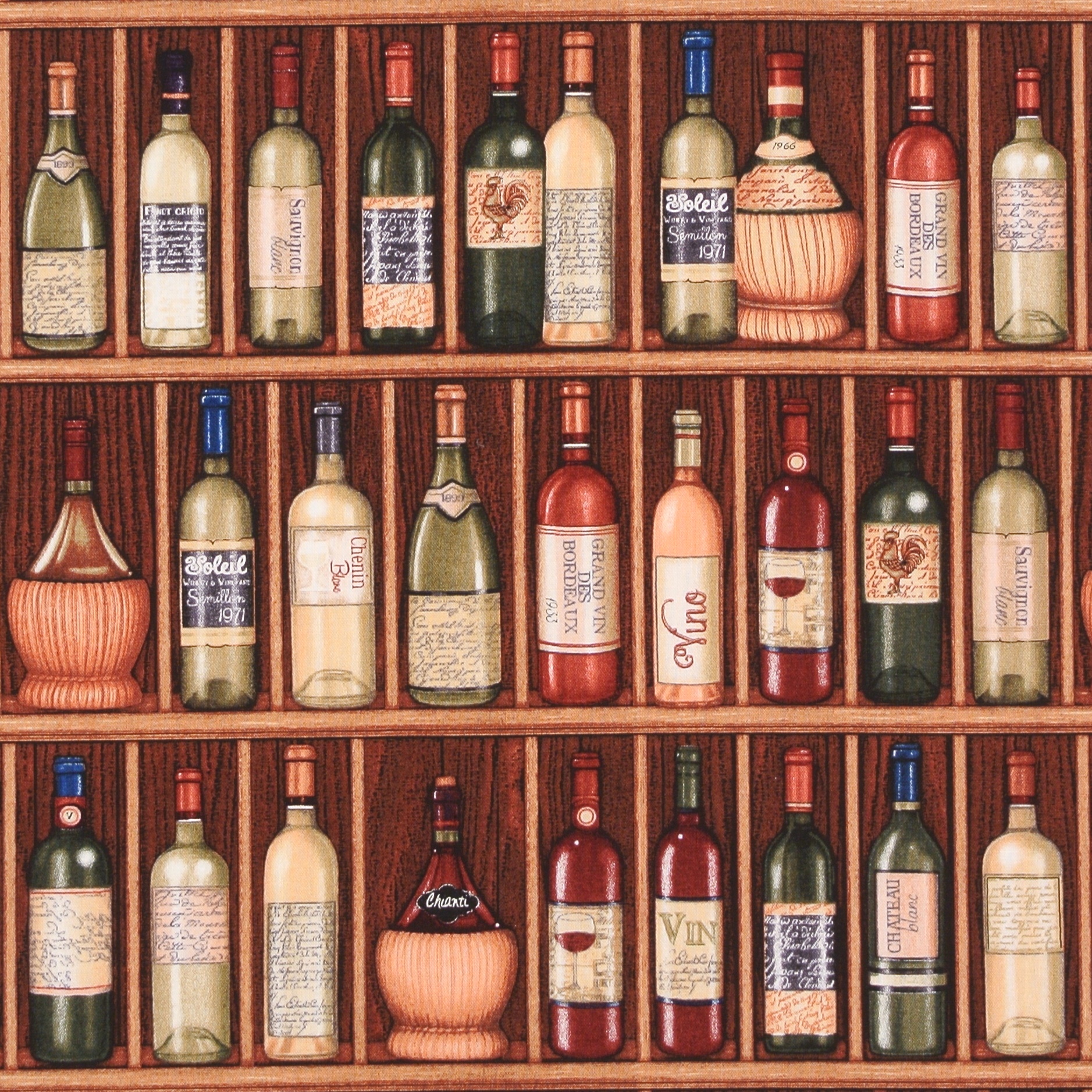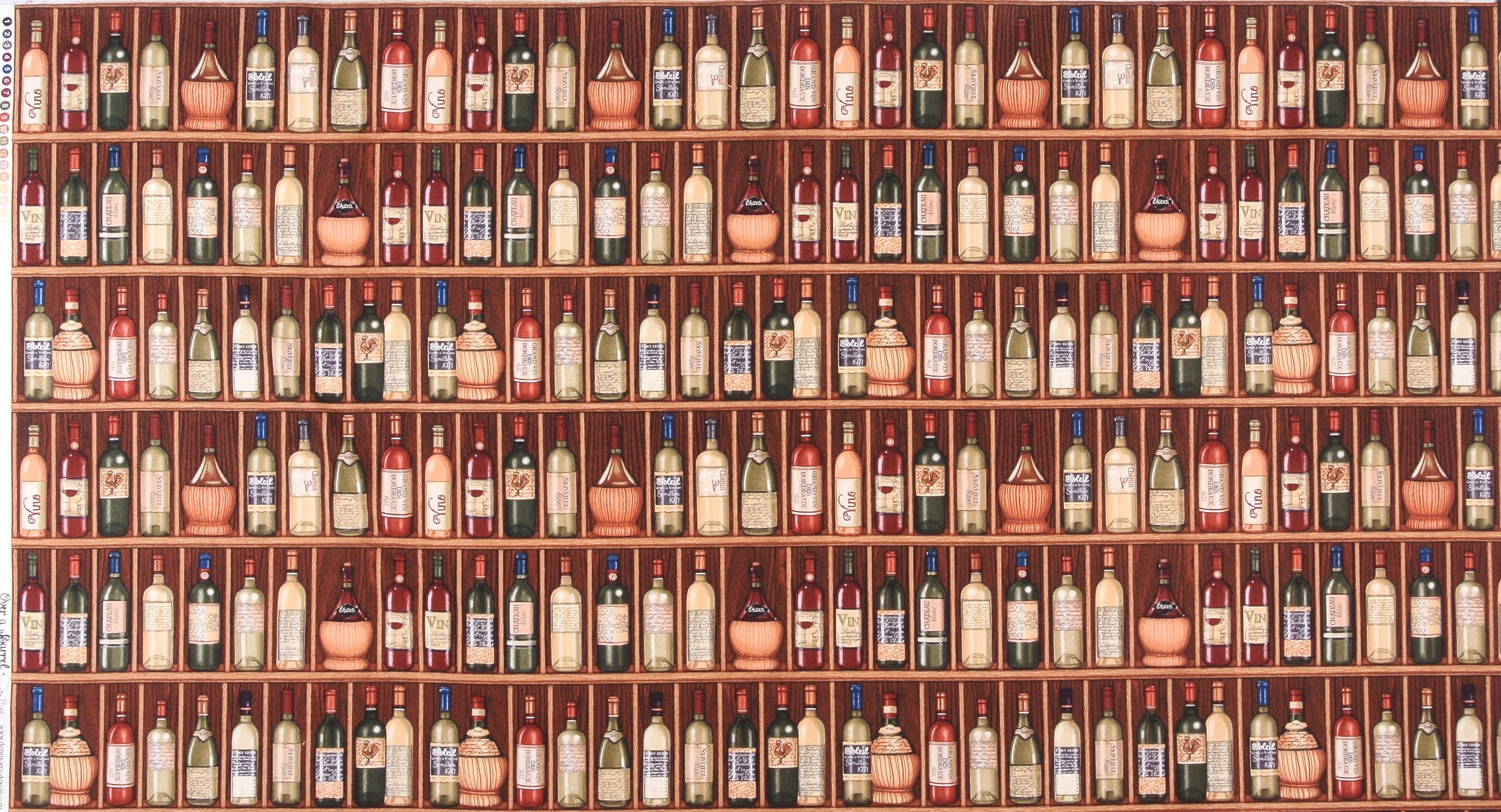 Patchworkstoff mit dekorativen Weinflaschen im Weinregal aus der Serie "Over a Barrel" von Dan Morris. Die Regalreihen verlaufen quer und parallel zu den Schnittkanten. (s. Abb. 2) Einzelstück, der Stoff ist nur noch in dieser Abmessung lieferbar.
