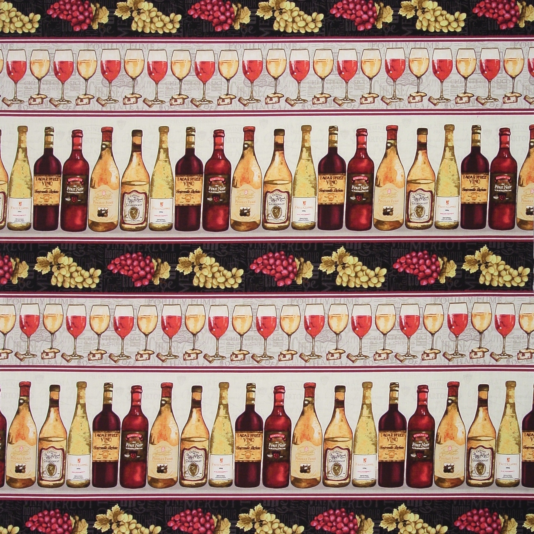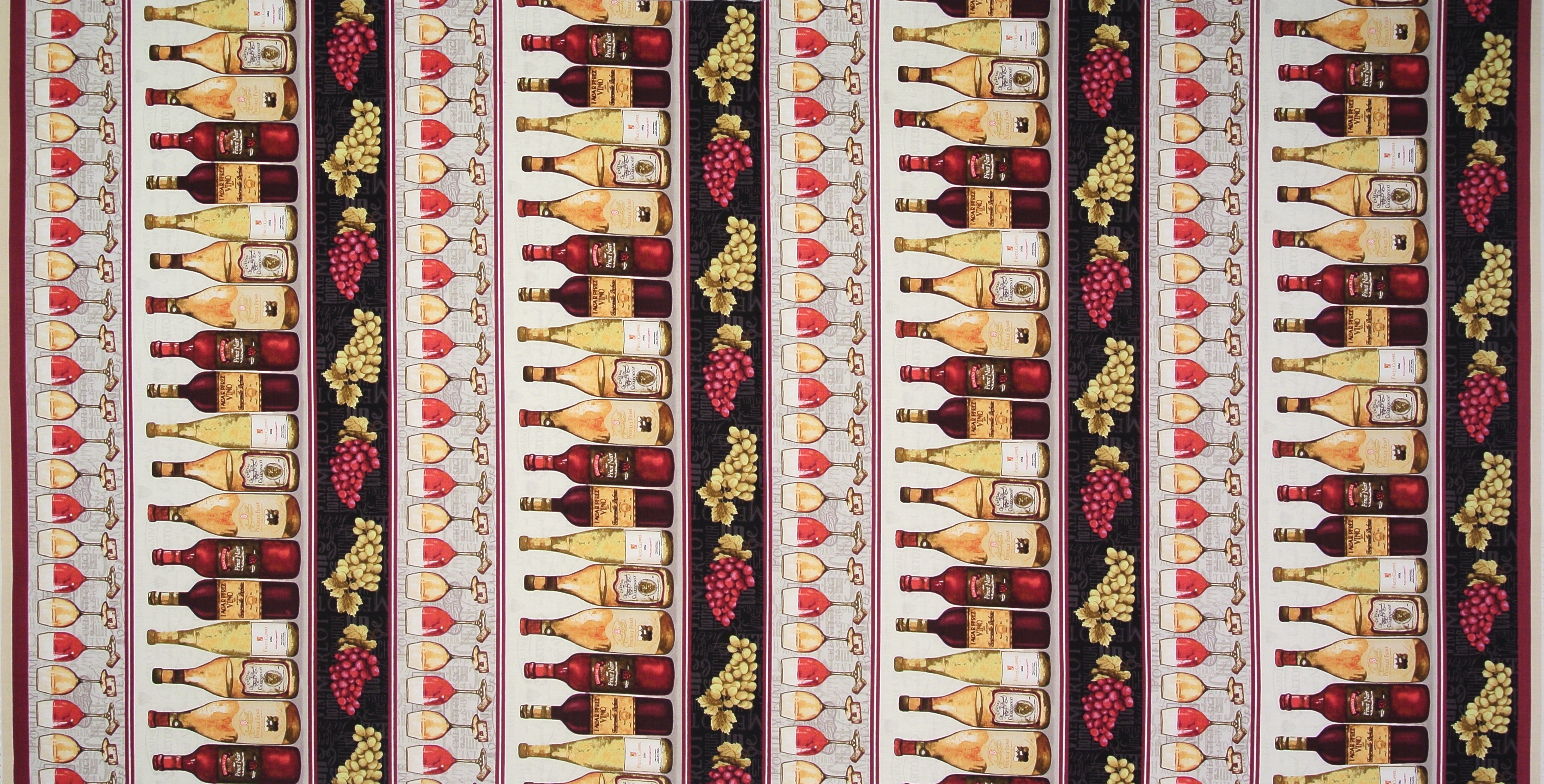 Patchworkstoff Bordürenstoff mit dekorativen Weinflaschen, Gläsern und Weintrauben in Bordüren aus der Serie "Wine Night" von Henry Glass. Die Bordüren verlaufen längs und parallel zu den Webkanten. (s. Abb. 2)