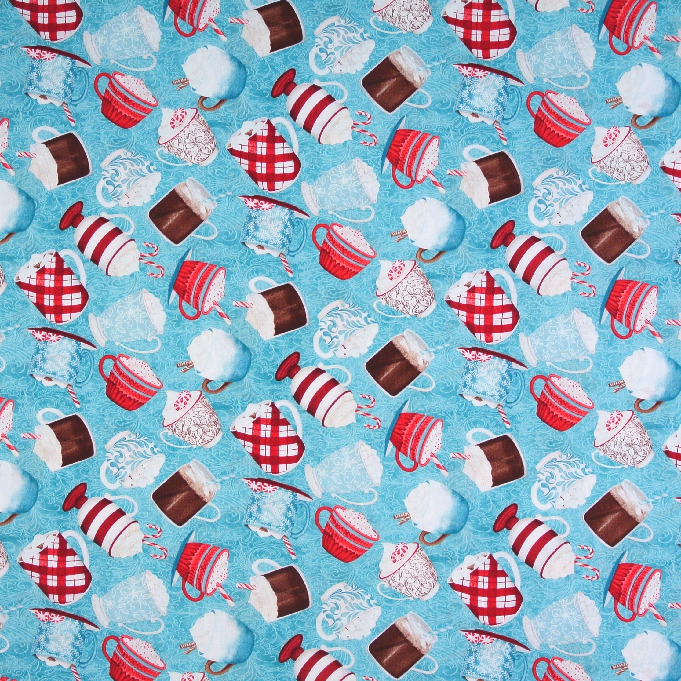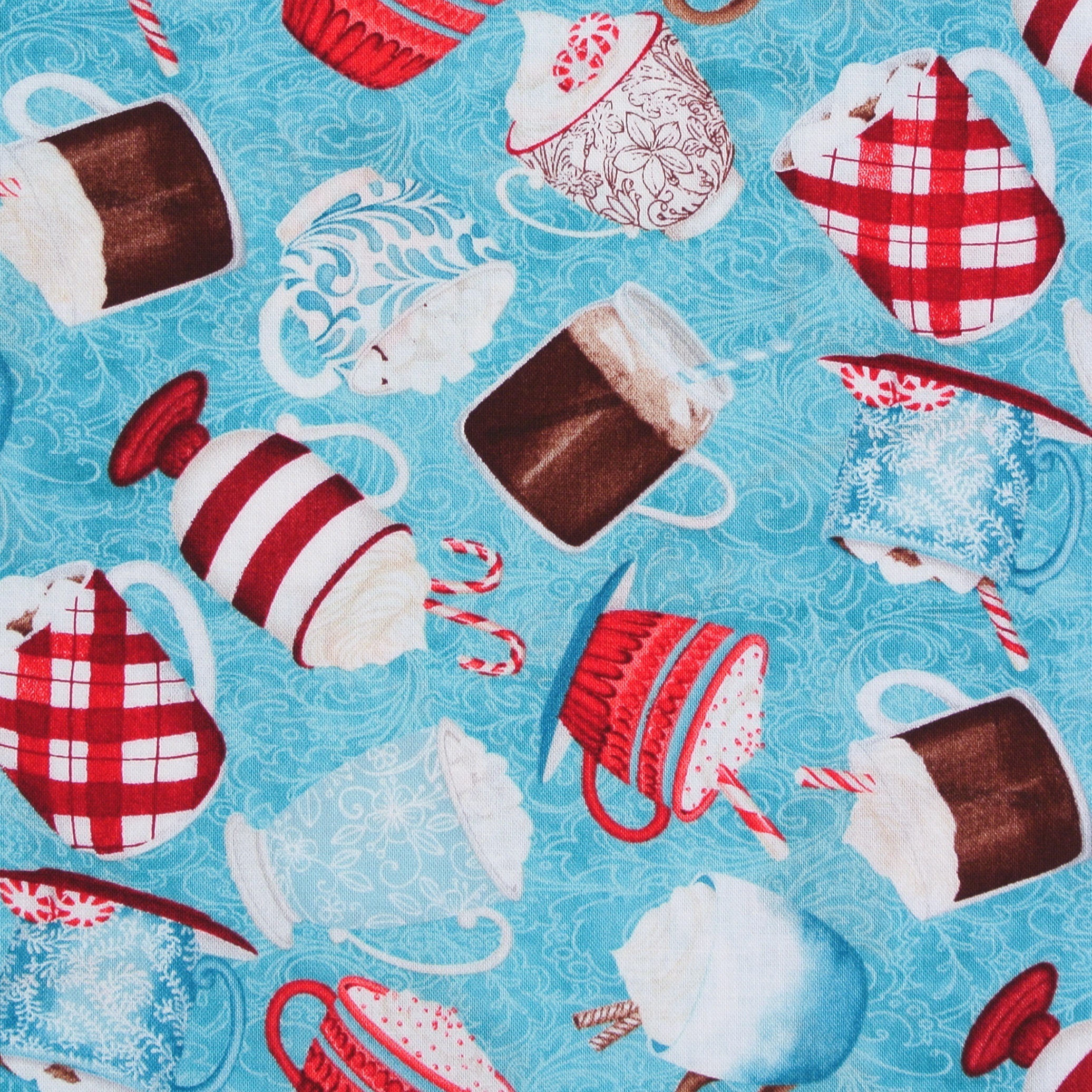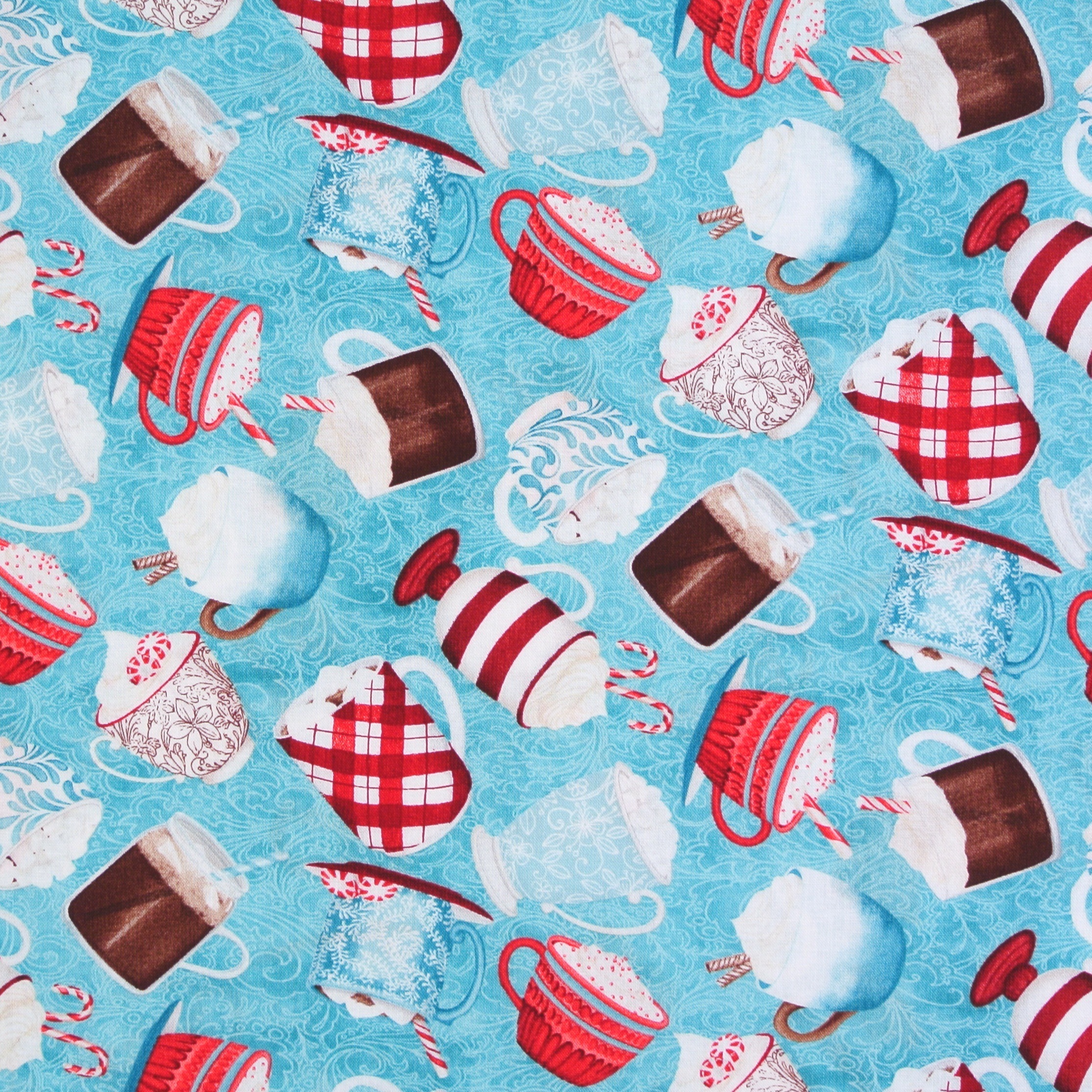 Patchworkstoff mit Kakaotassen und Marshmallows auf Türkis aus der Serie "Cuppa Cacoa" von Wilmington Prints. Wunderschön für Patchwork und Dekoration für die Küche.