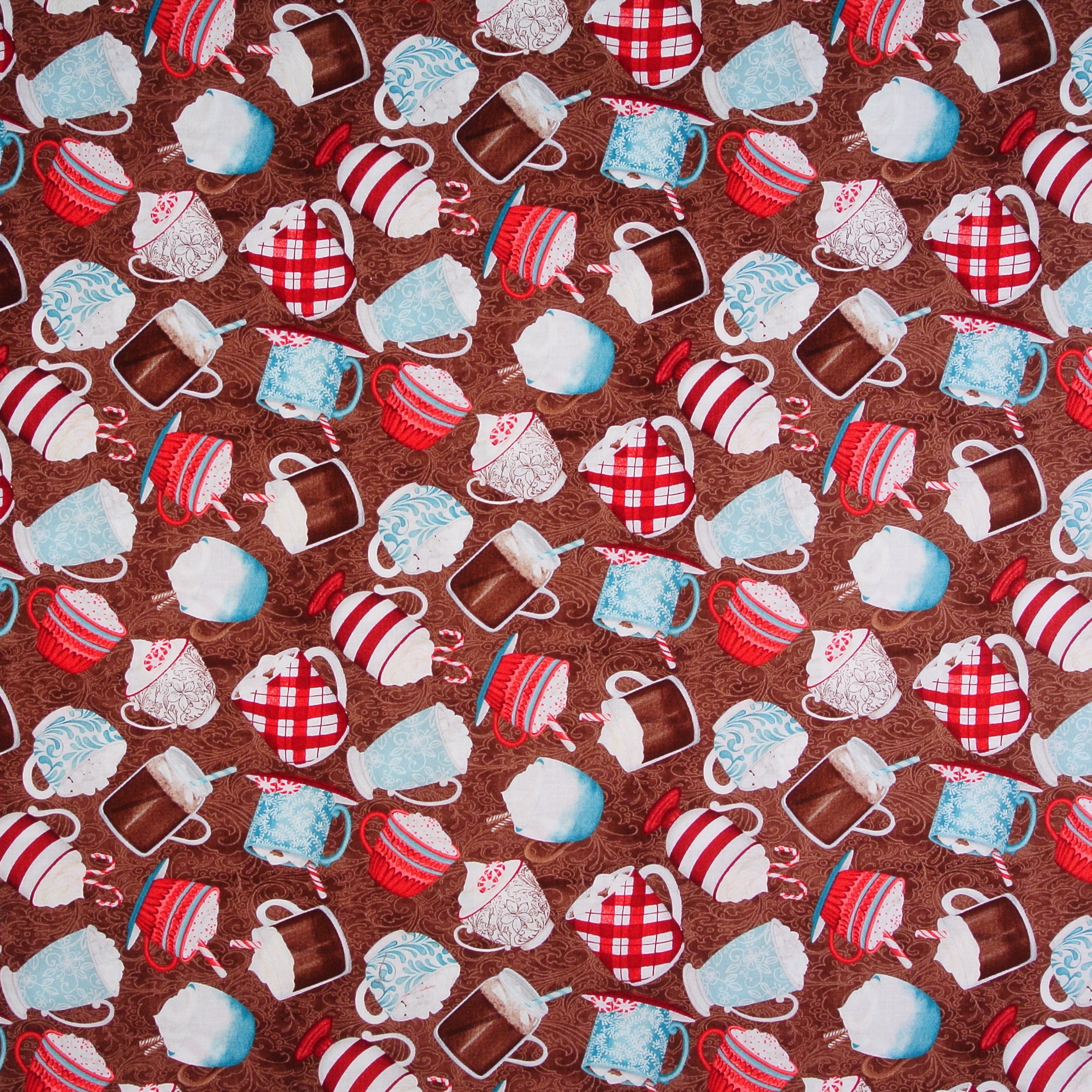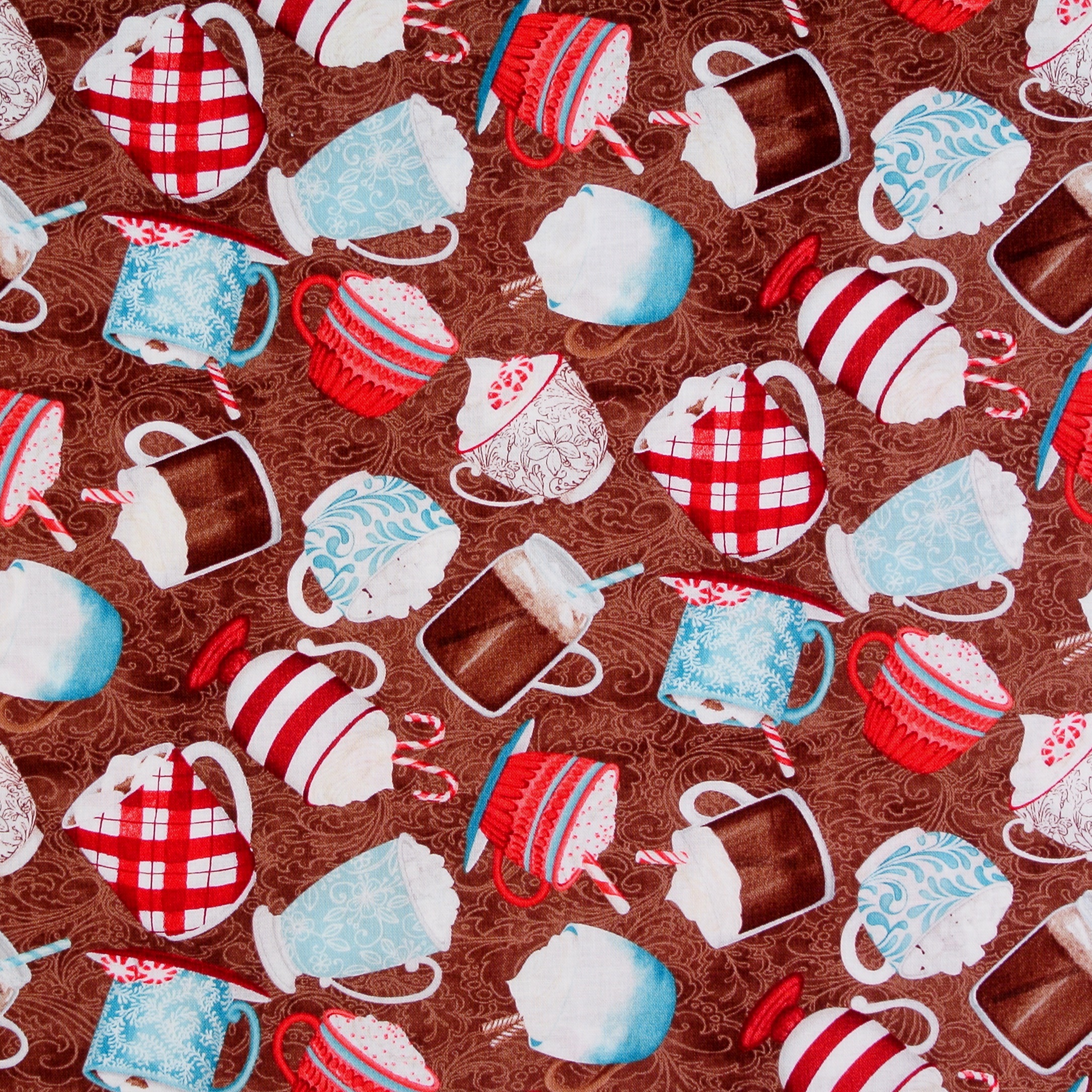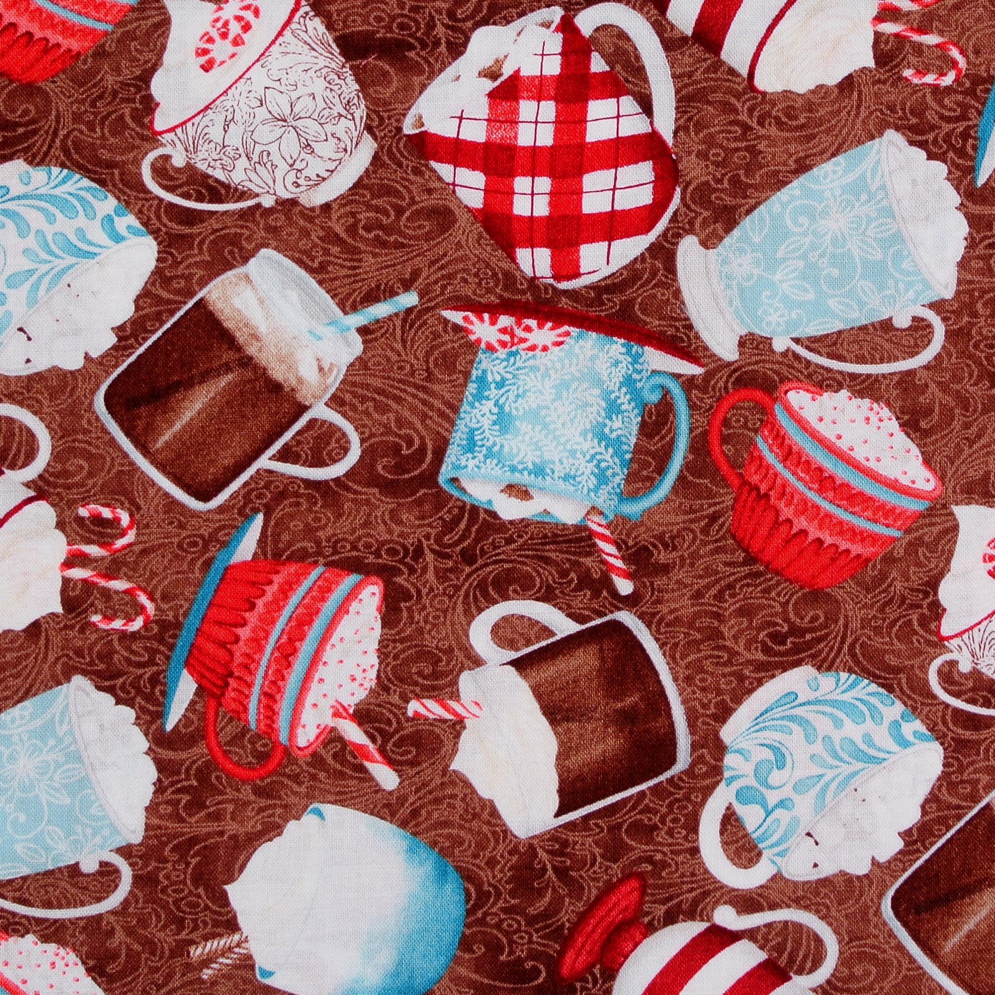 Patchworkstoff mit Kakaotassen und Marshmallows auf Braun aus der Serie "Cuppa Cacoa" von Wilmington Prints. Wunderschön für Patchwork und Dekoration für die Küche.