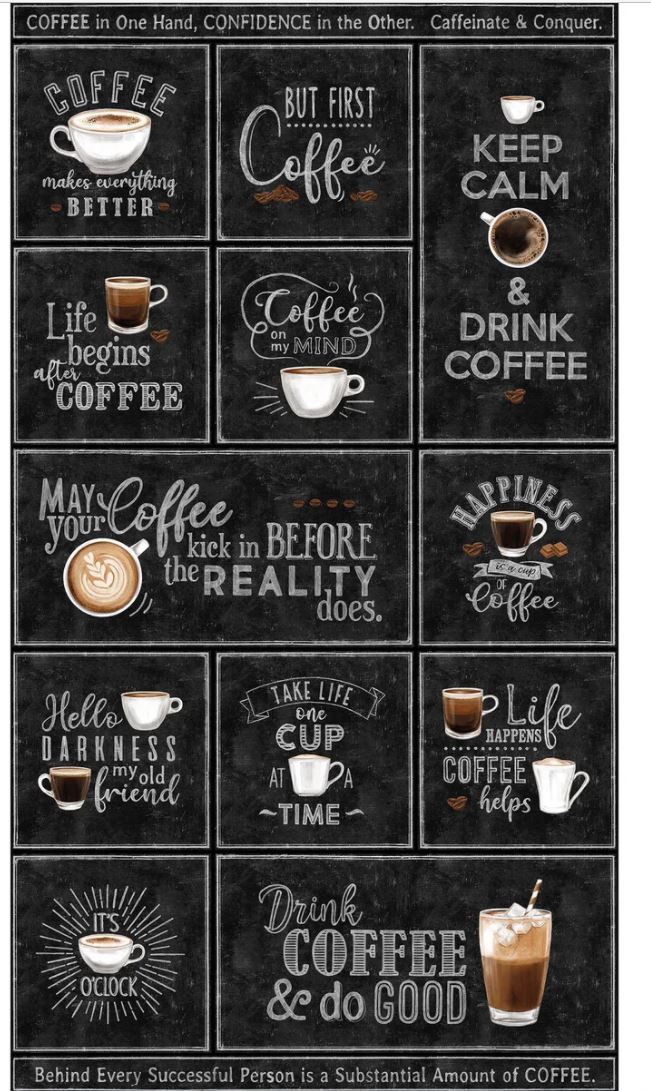 Großes Patchworkstoff Panel mit Kaffeetassen und Sprüchen rund um den Kaffee auf Schwarz aus der Serie "Cafe Culture" von Northcott.