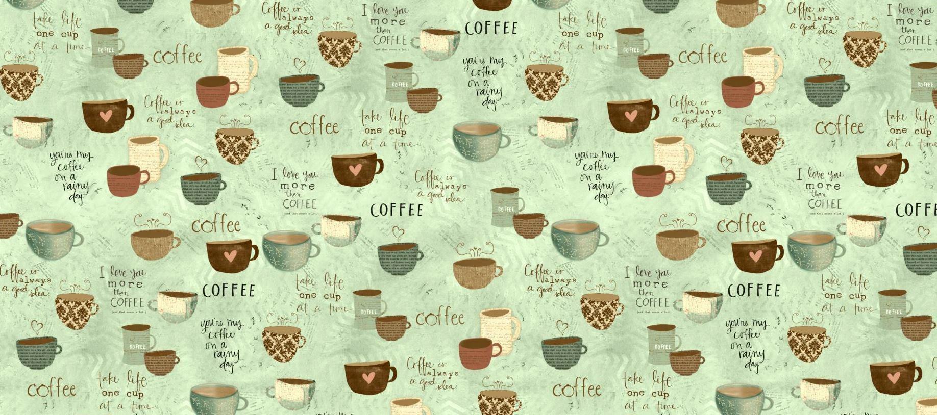 Patchworkstoff Kaffee "But First Coffee" Tassen Schrift grün