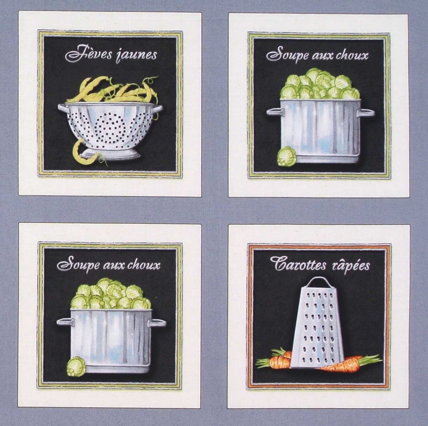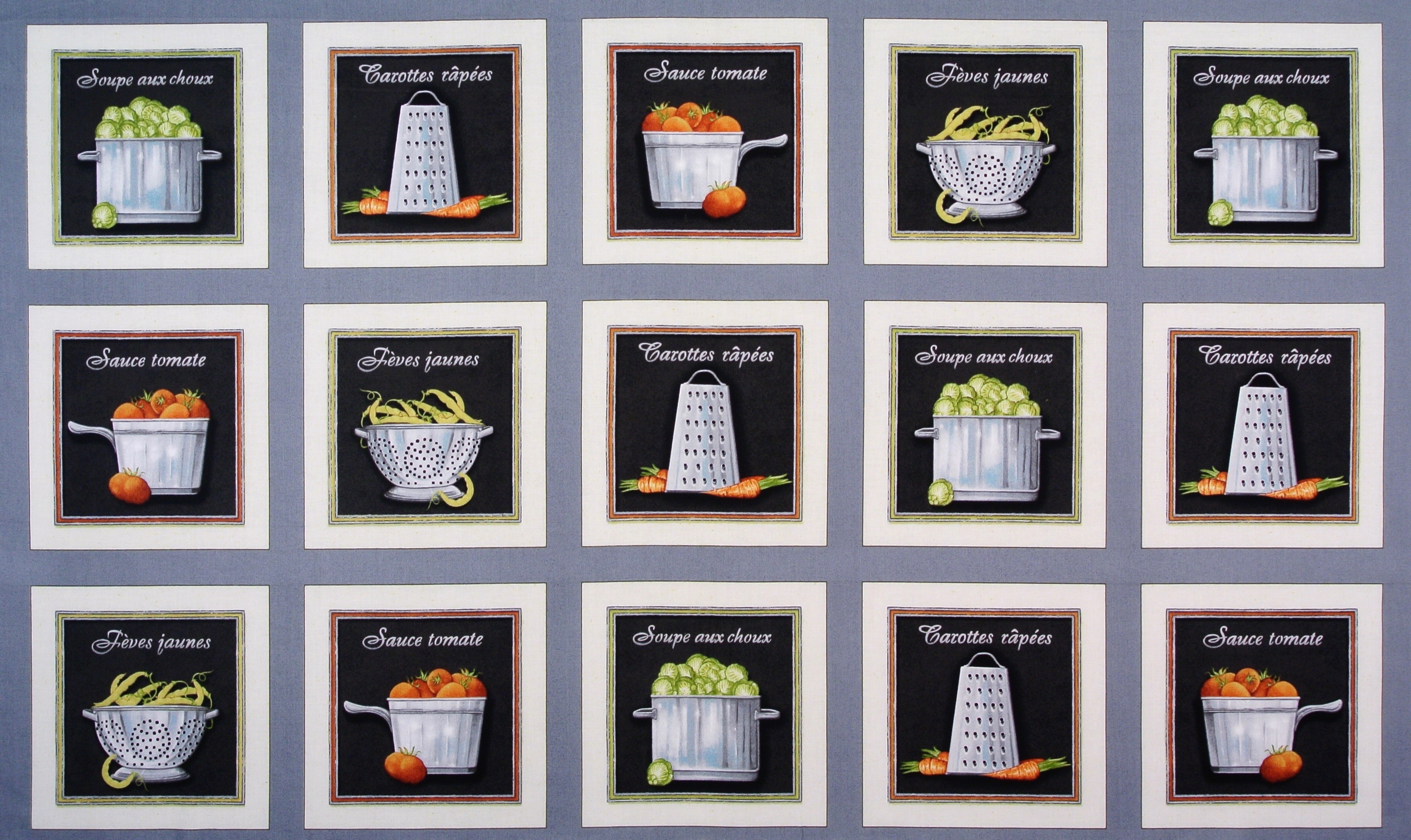 Grosses Patchworkpanel mit dekorativem Kochgeschirr und Gemüse aus der Serie "Cuisine".