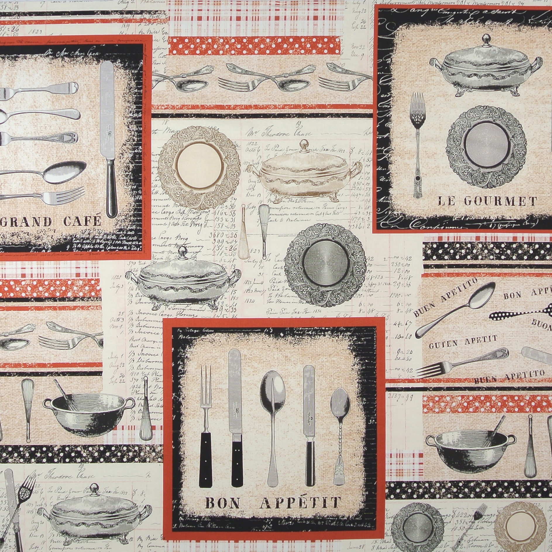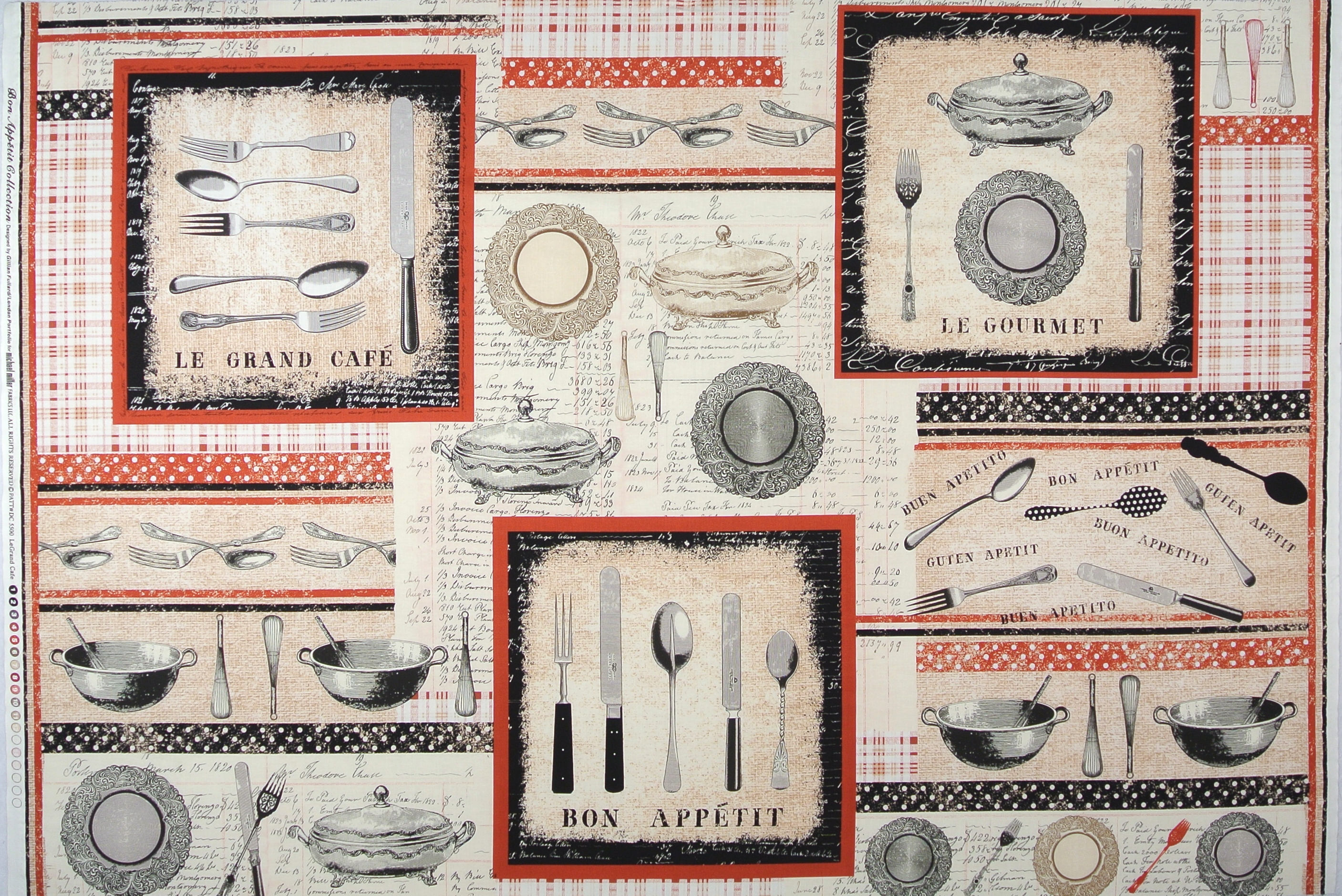 Großes Patchworkstoff Panel mit altem Besteck, Geschirr, Küchengräten und nostalgischer Schrift aus der Serie "Bon Appetit".