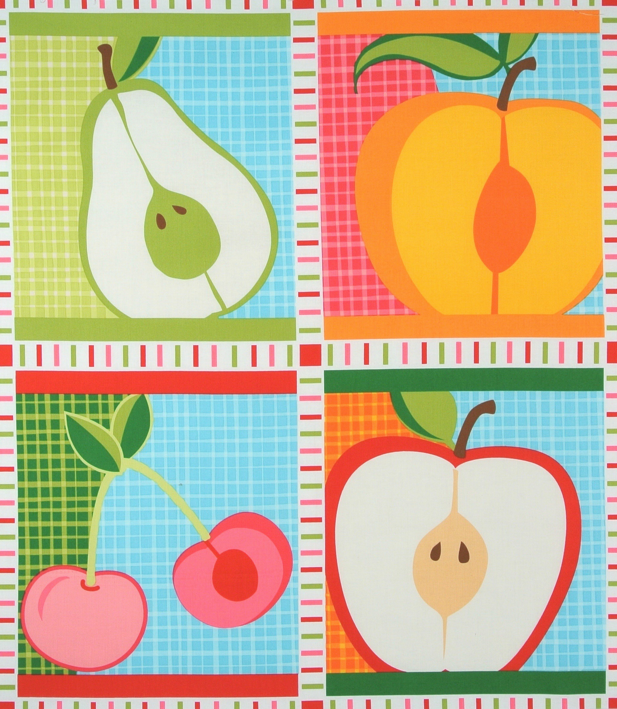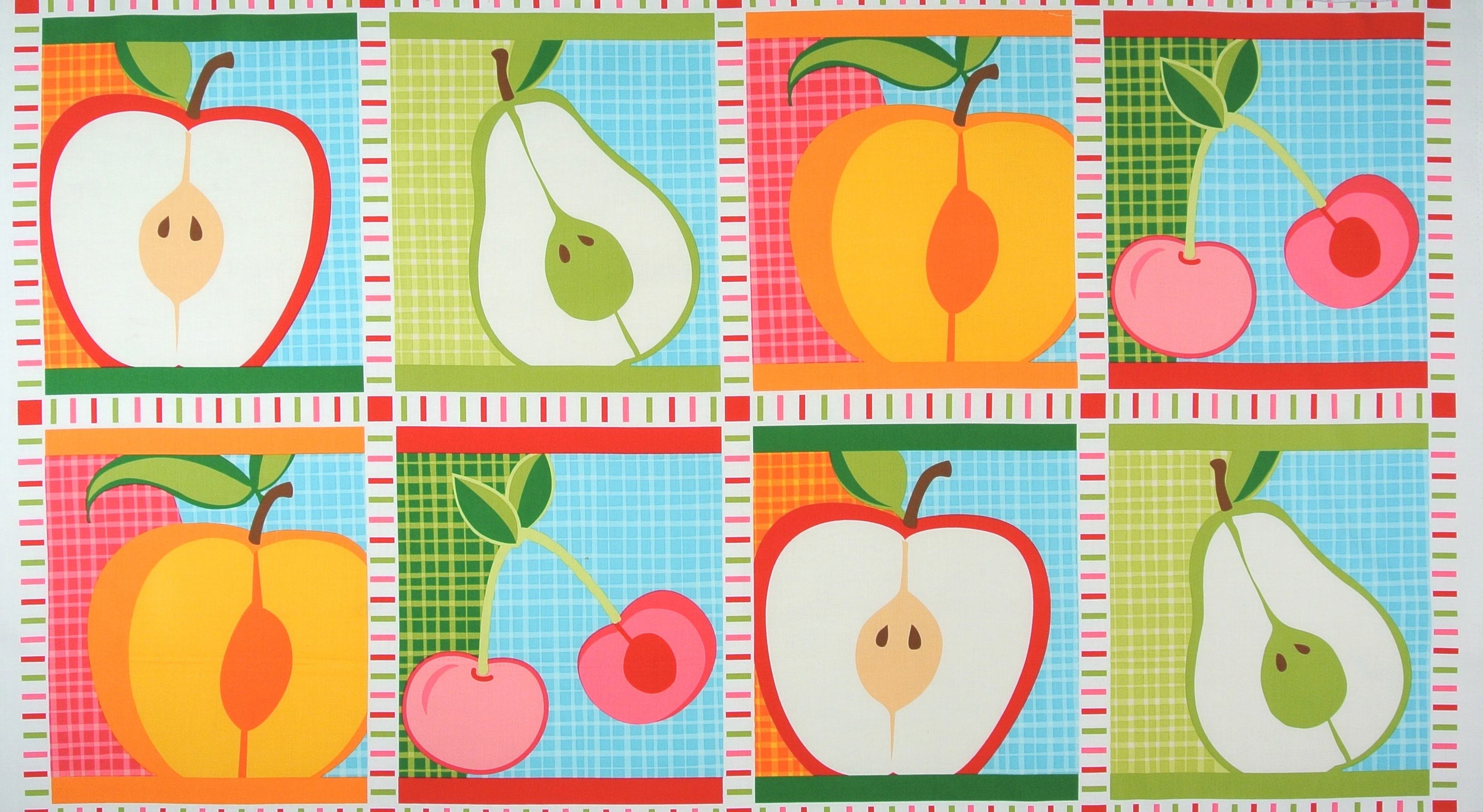 SALE Patchworkstoff Panel mit sommerlichen Obstsorten wie Kirschen, Äpfel, Birnen und Aprikosen aus der Serie "Metro Market" von Robert Kaufman. Ein schöner Stoff für Taschen, Täschchen, Kissen, Accessoires, Patchwork und Dekorationen für die Küche. Er ist problemlos bis 60 Grad waschar.