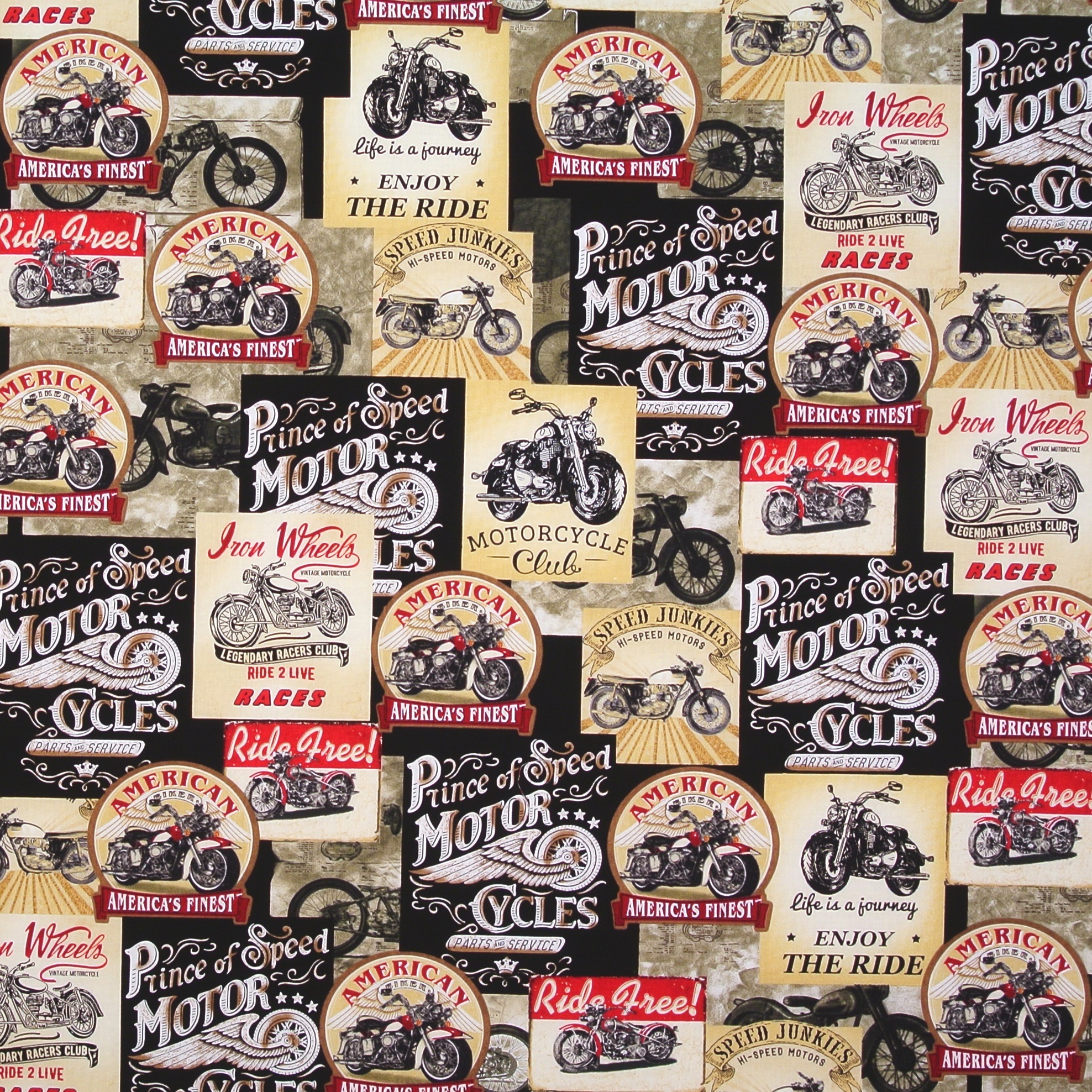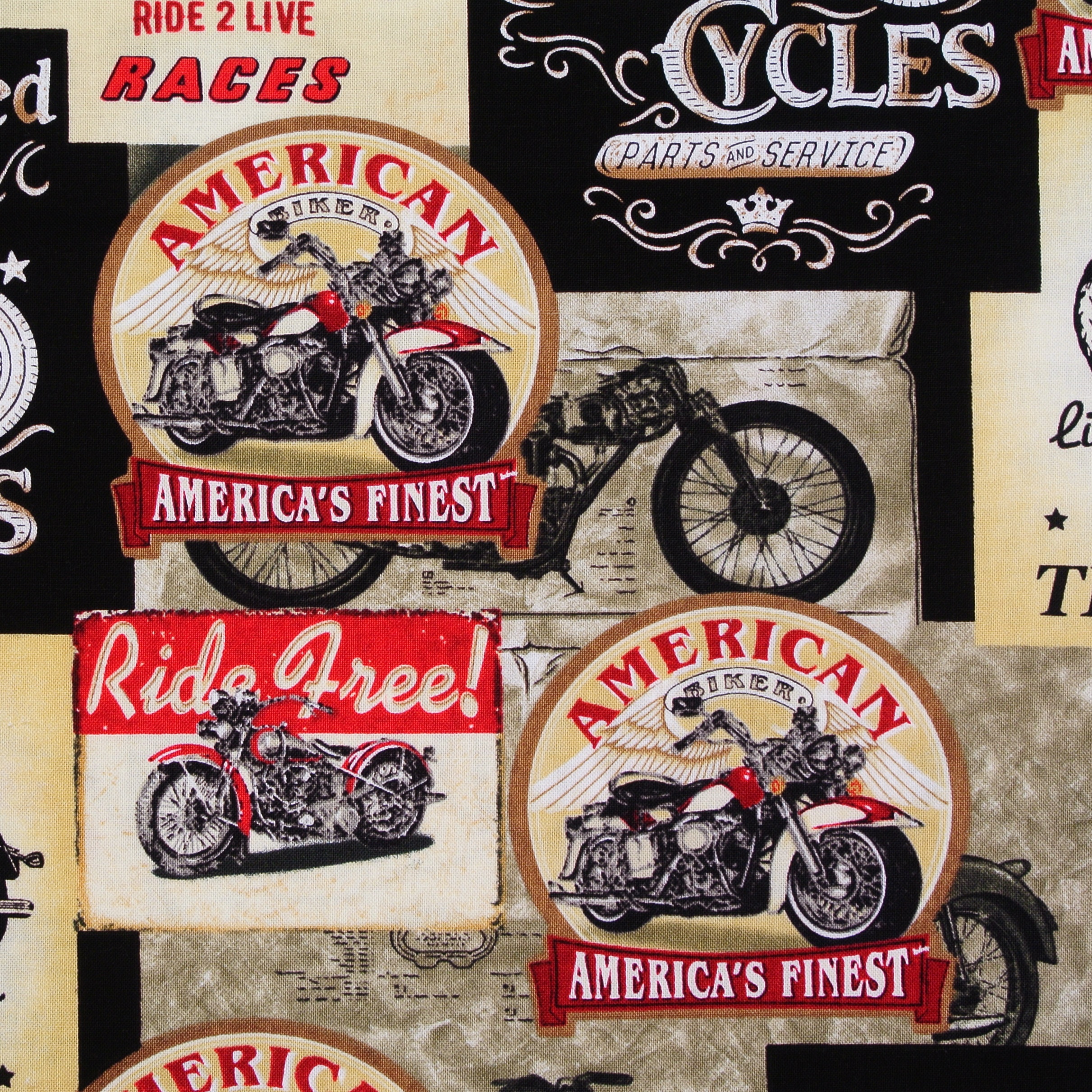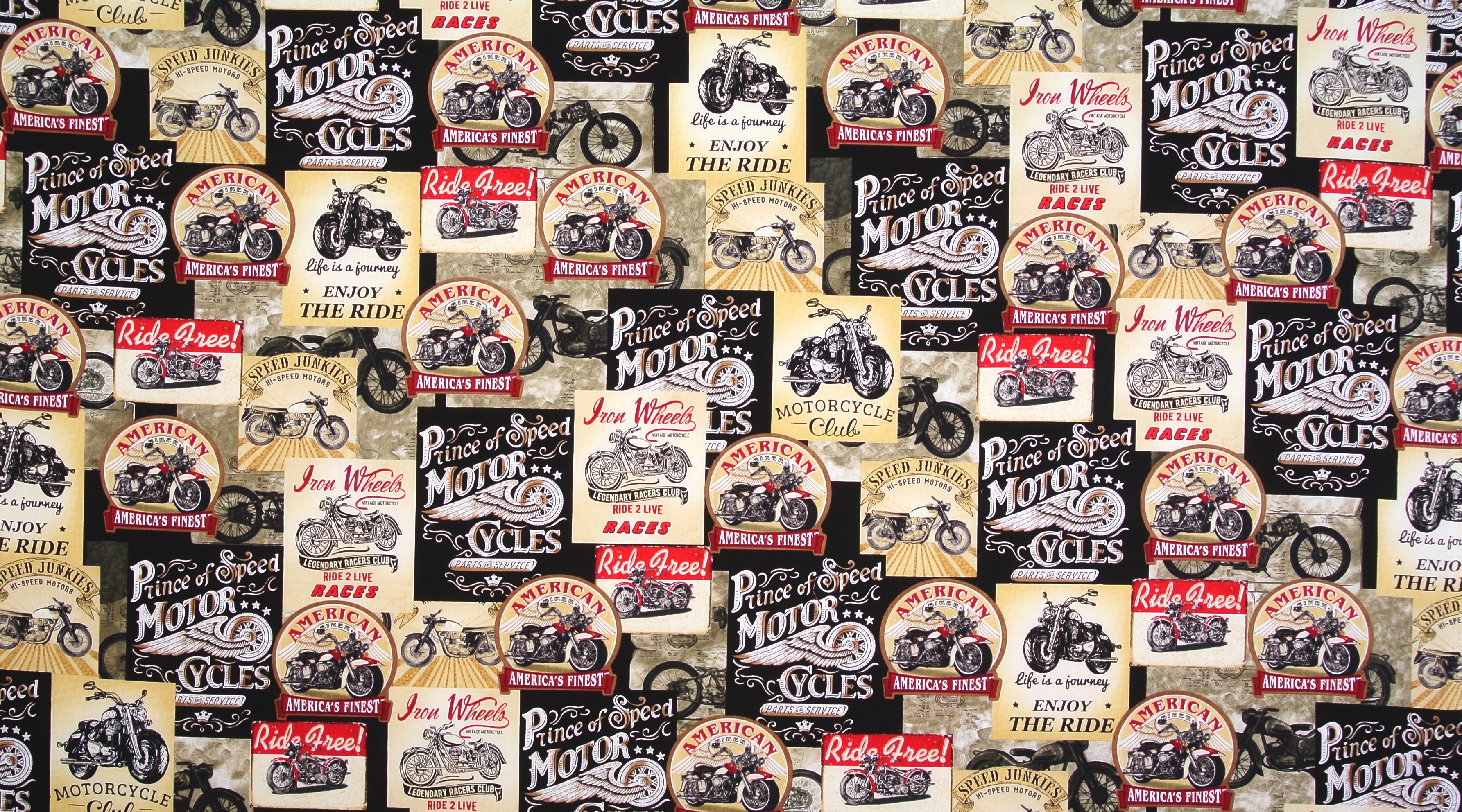 Nähen Sie aus diesem ausgefallenen Patchworkstoff Accessoires für Motorradfahrer und Biker, Taschen, Beutel, Kissen und Dekorationen..