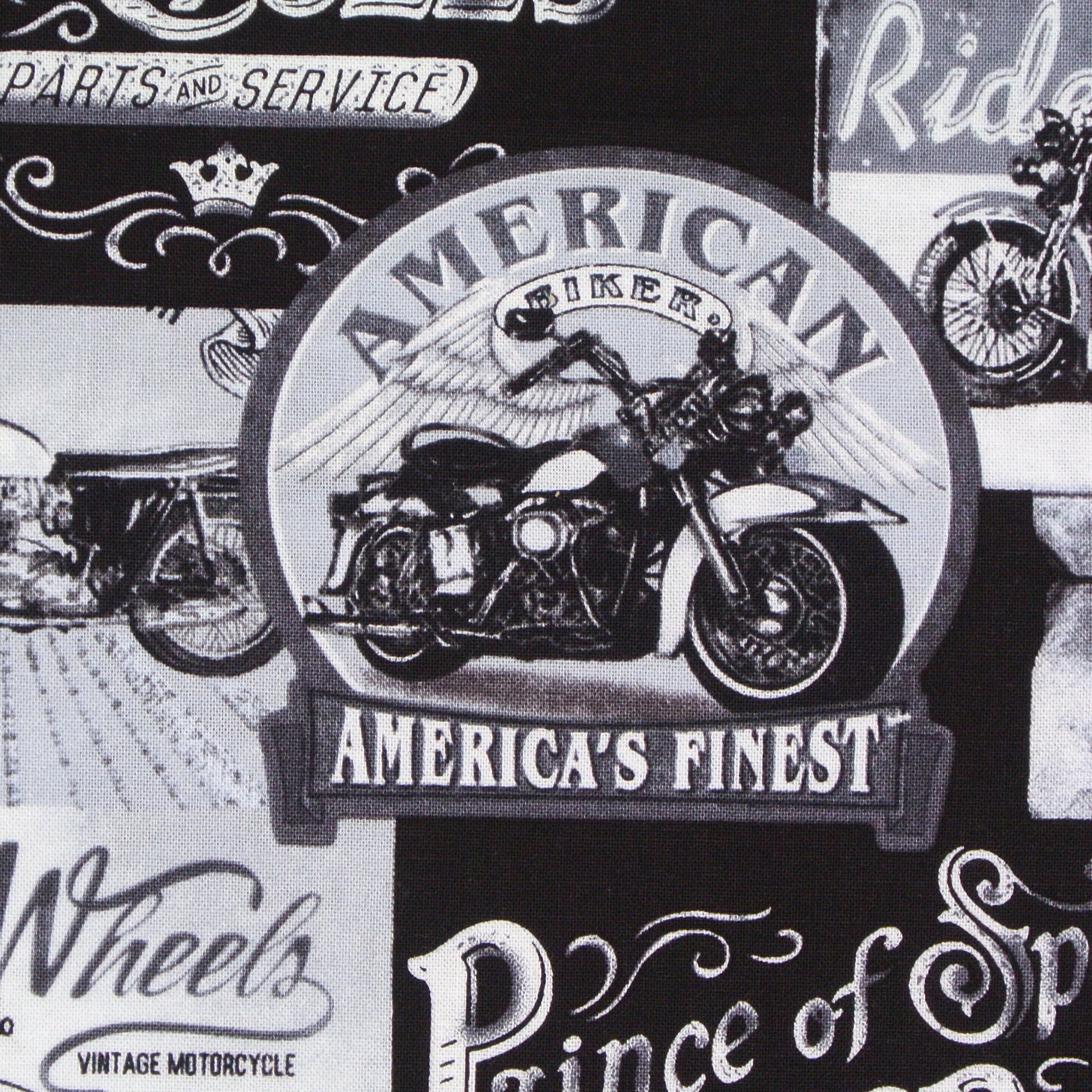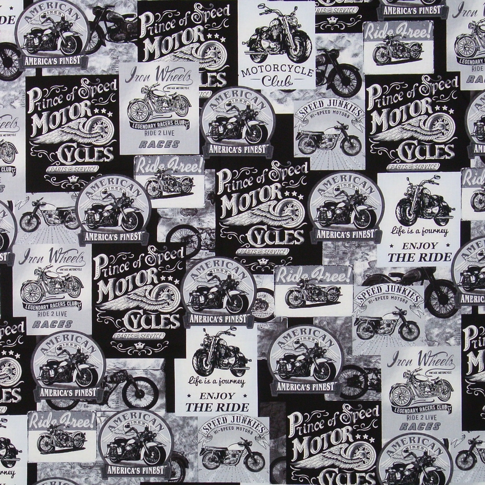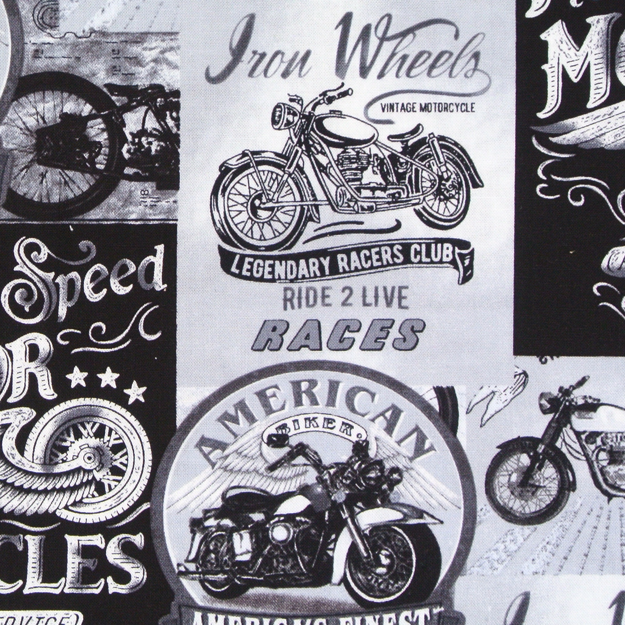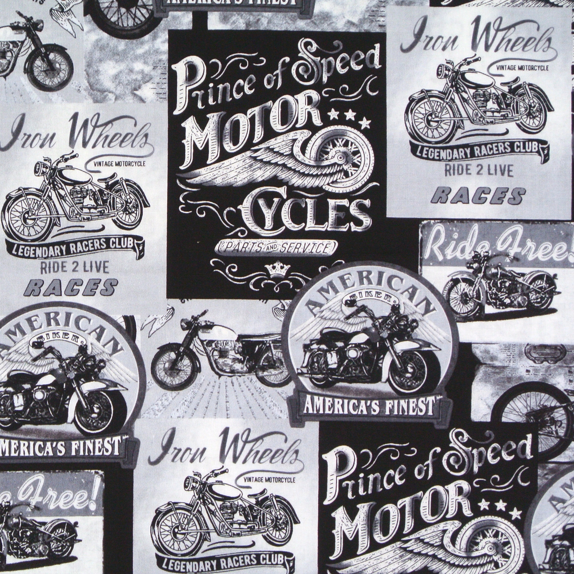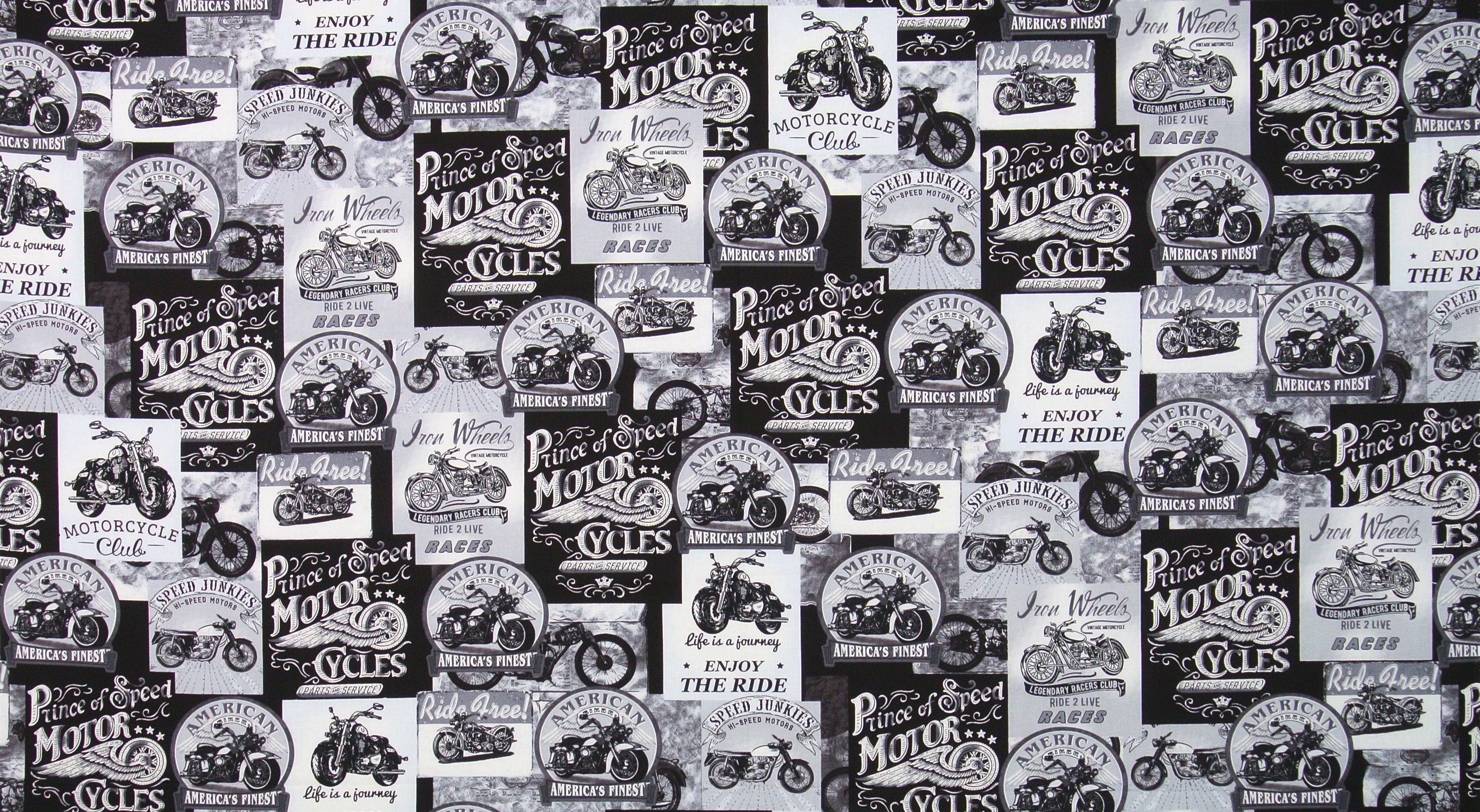 Nähen Sie aus diesem ausgefallenen Patchworkstoff Accessoires für Motorradfahrer und Biker, Taschen, Beutel, Kissen und Dekorationen..