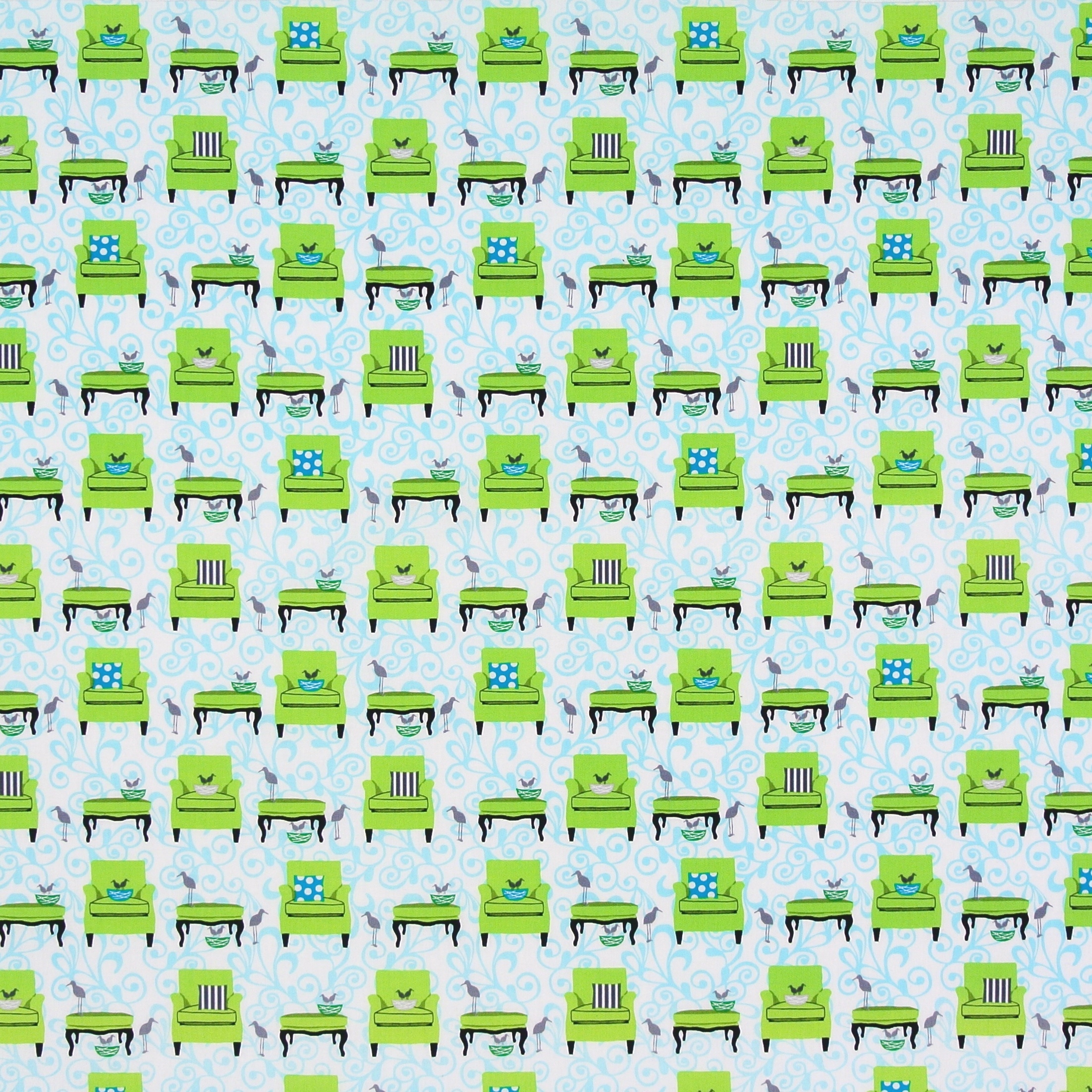 SALE Patchworkstoff mit Sesseln und Sofas in Grün aus der Serie "Perfectly Perched" von Robert Kaufman.