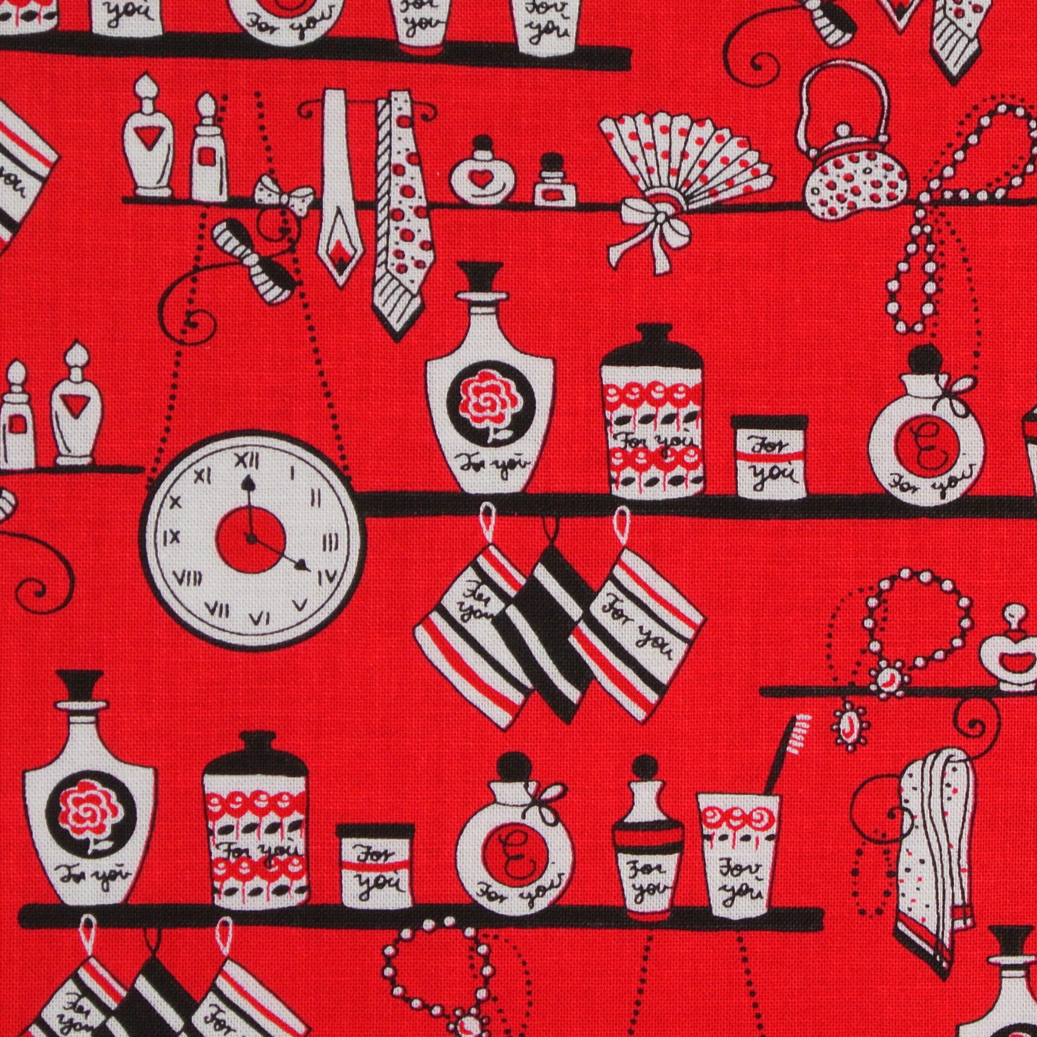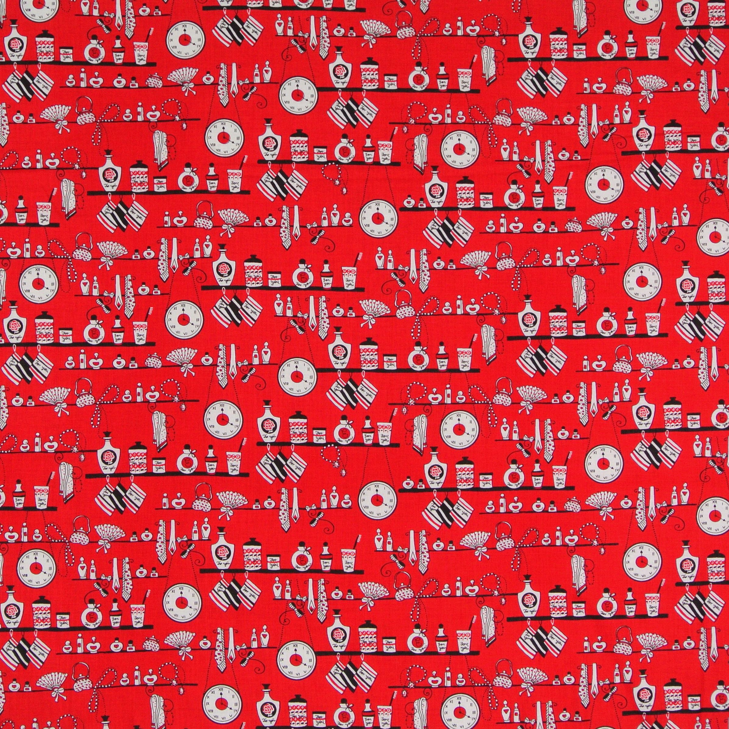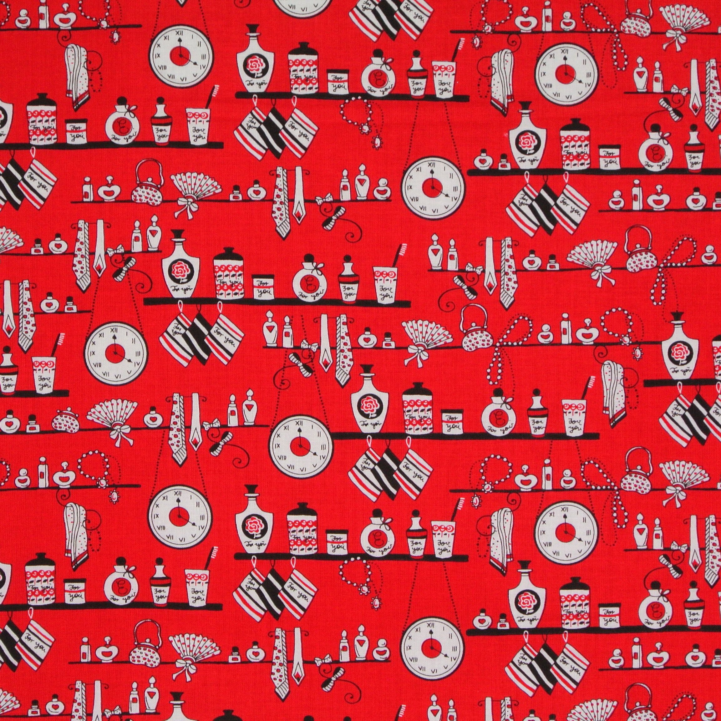 Patchworkstoff mit Uhren uns Kosmetikartiklen auf Rot aus der Serie "Joie de Vivre" in Rot-Weiß von Michael Miller. Ein ausgefallener Stoff für Taschen Täschchen, Reisetagebücher, Kleidung, Patchwork und Dekorationen.