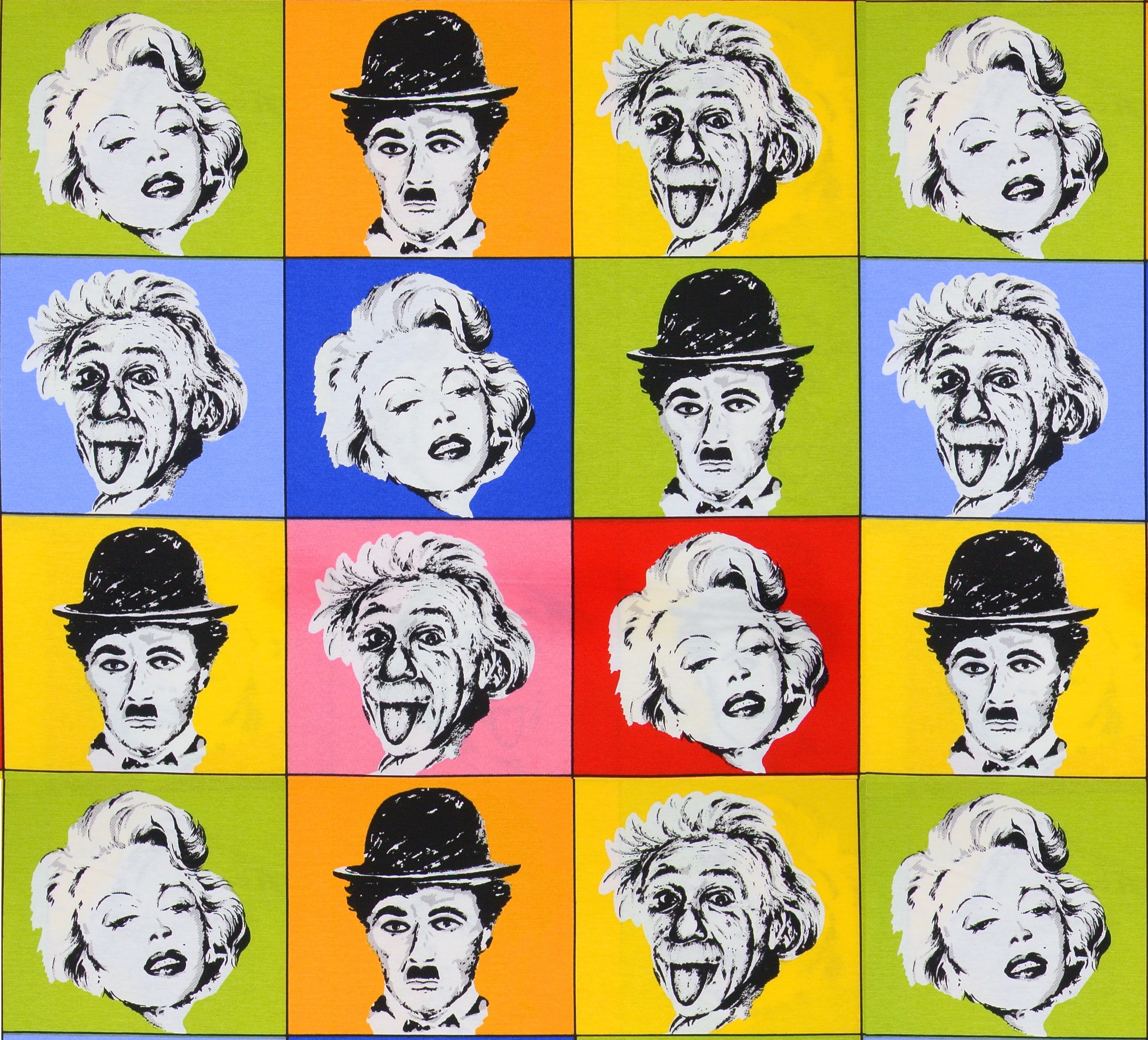 Dekostoff mit farbigen Bildern von den Prominenten Marilyn Monroe, Charlie Chaplin und Albert Einstein.