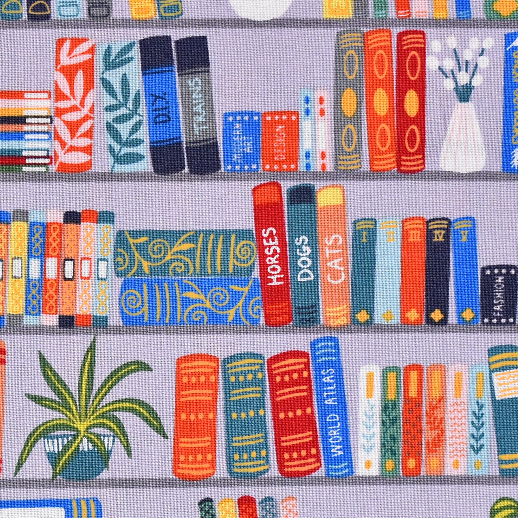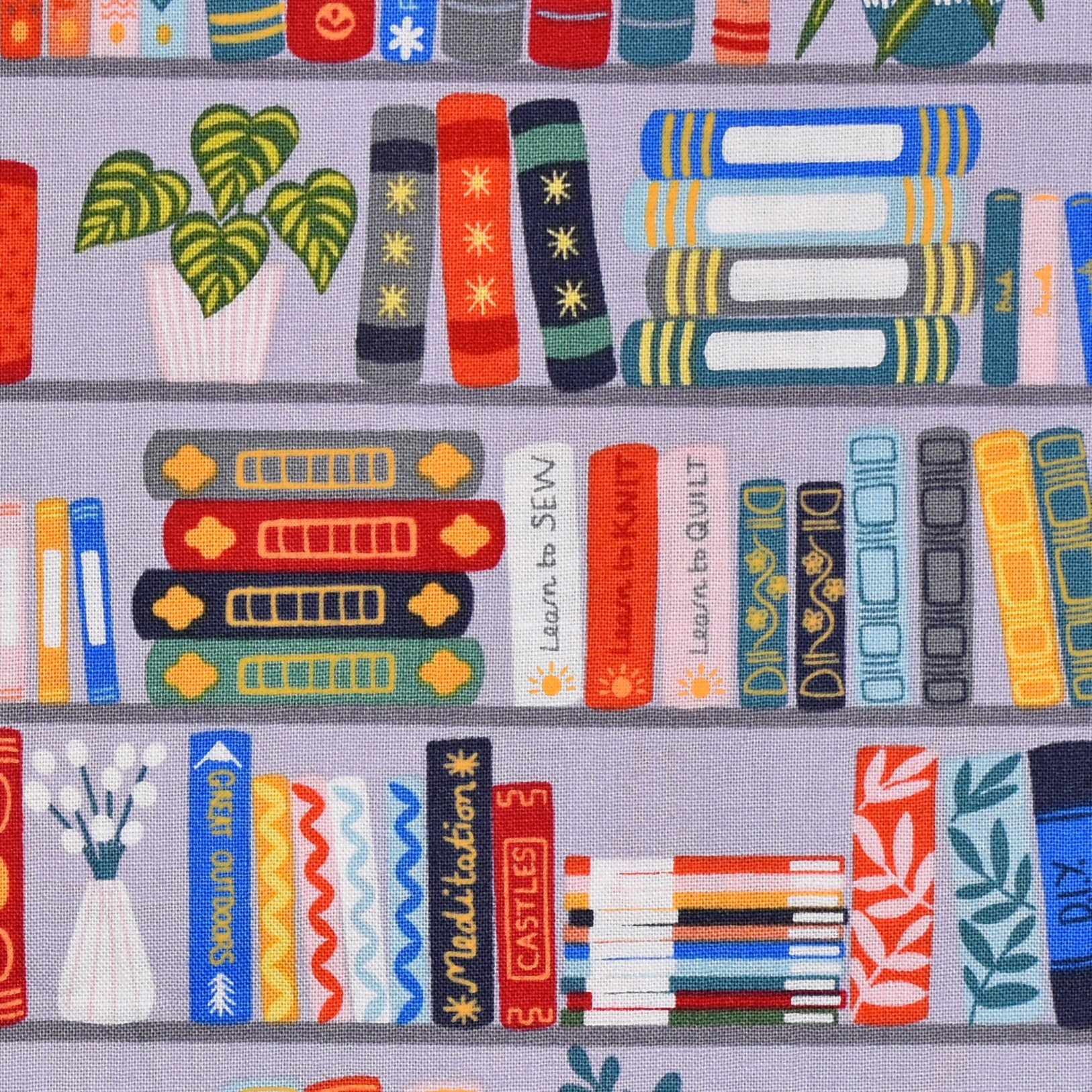 Patchworkstoff mit vielen Büchern und Pflanzen in Regalen auf Hellgrau aus der Serie "Bookworm" von Lewis & Irene.