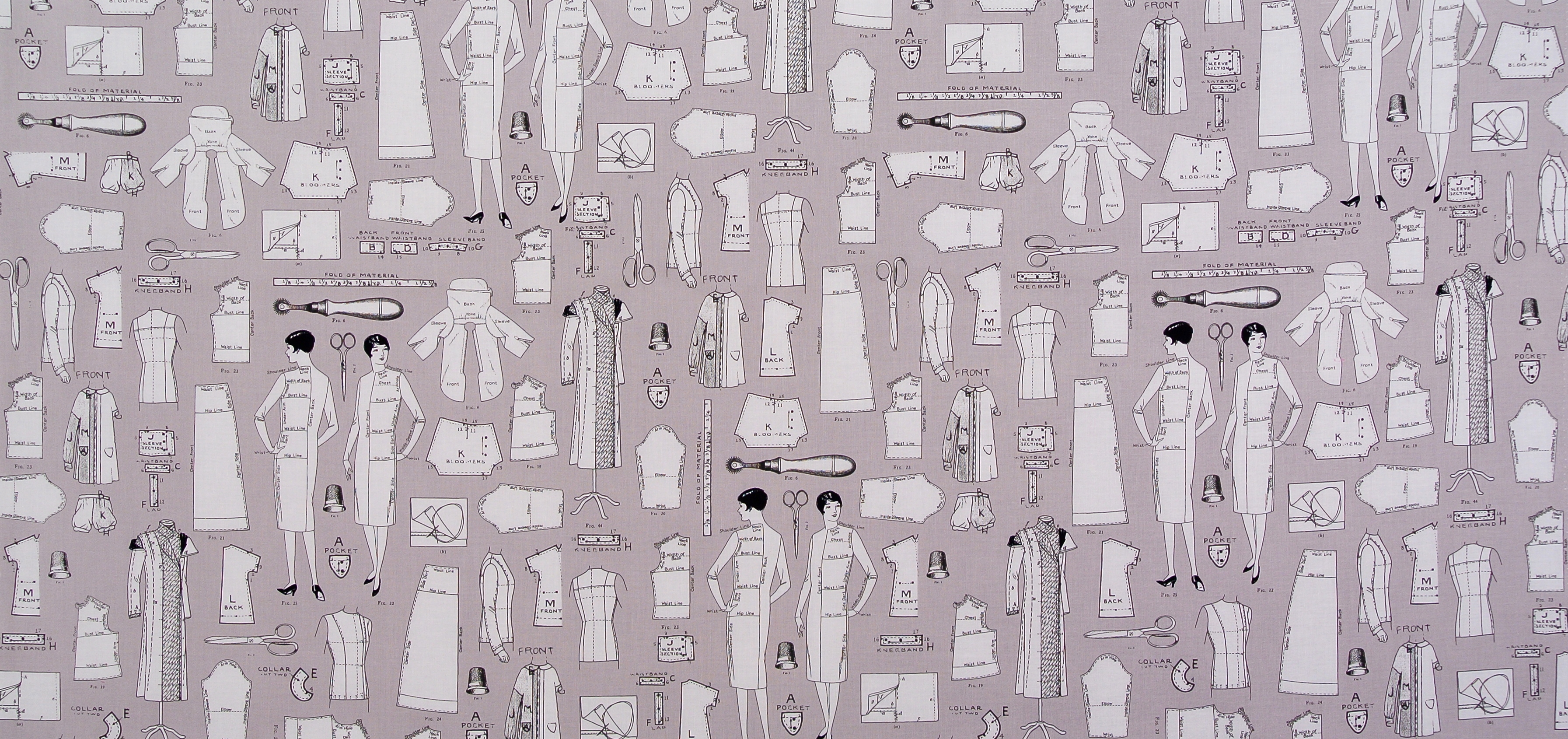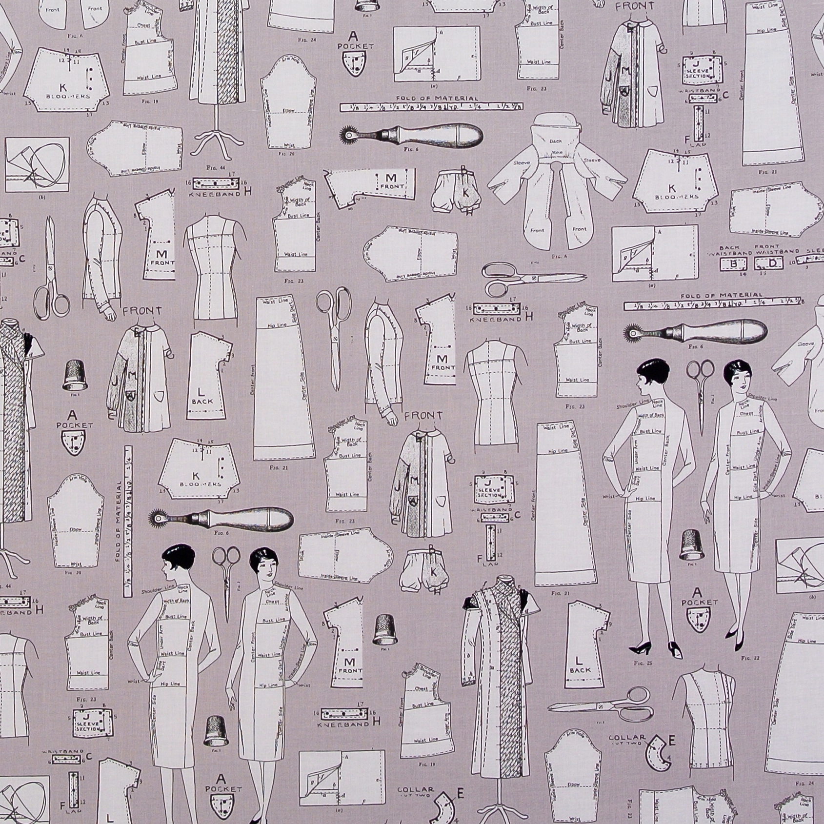 Patchworkstoff im Vintage-Stil mit nostalgischen Schnittmustern und Nähanleitungen auf Grau aus der Serie "Dressmaking Collection".