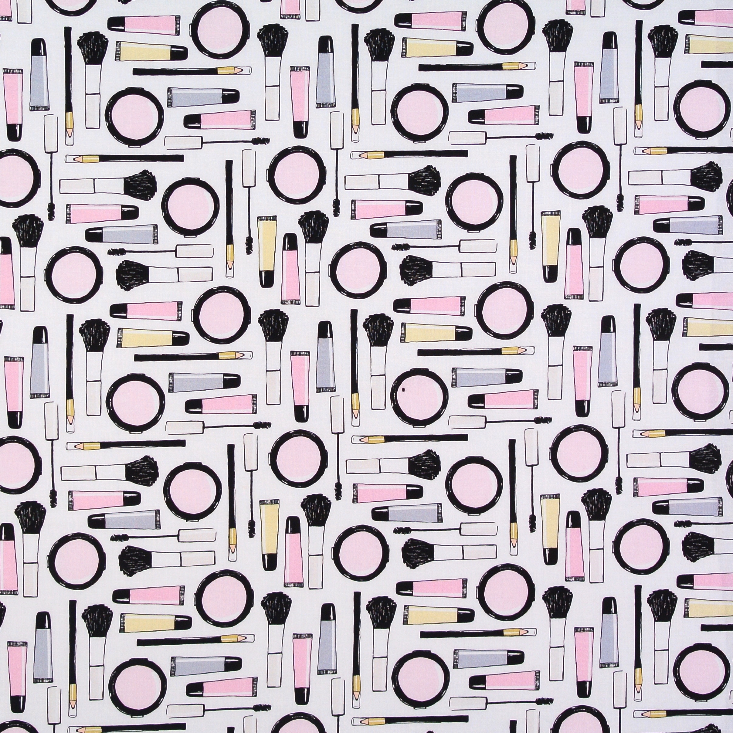 SALE Was Frauen lieben: Patchworkstoff mit vielen Makeup Utensilien auf Weiß aus der Serie Glamorama".