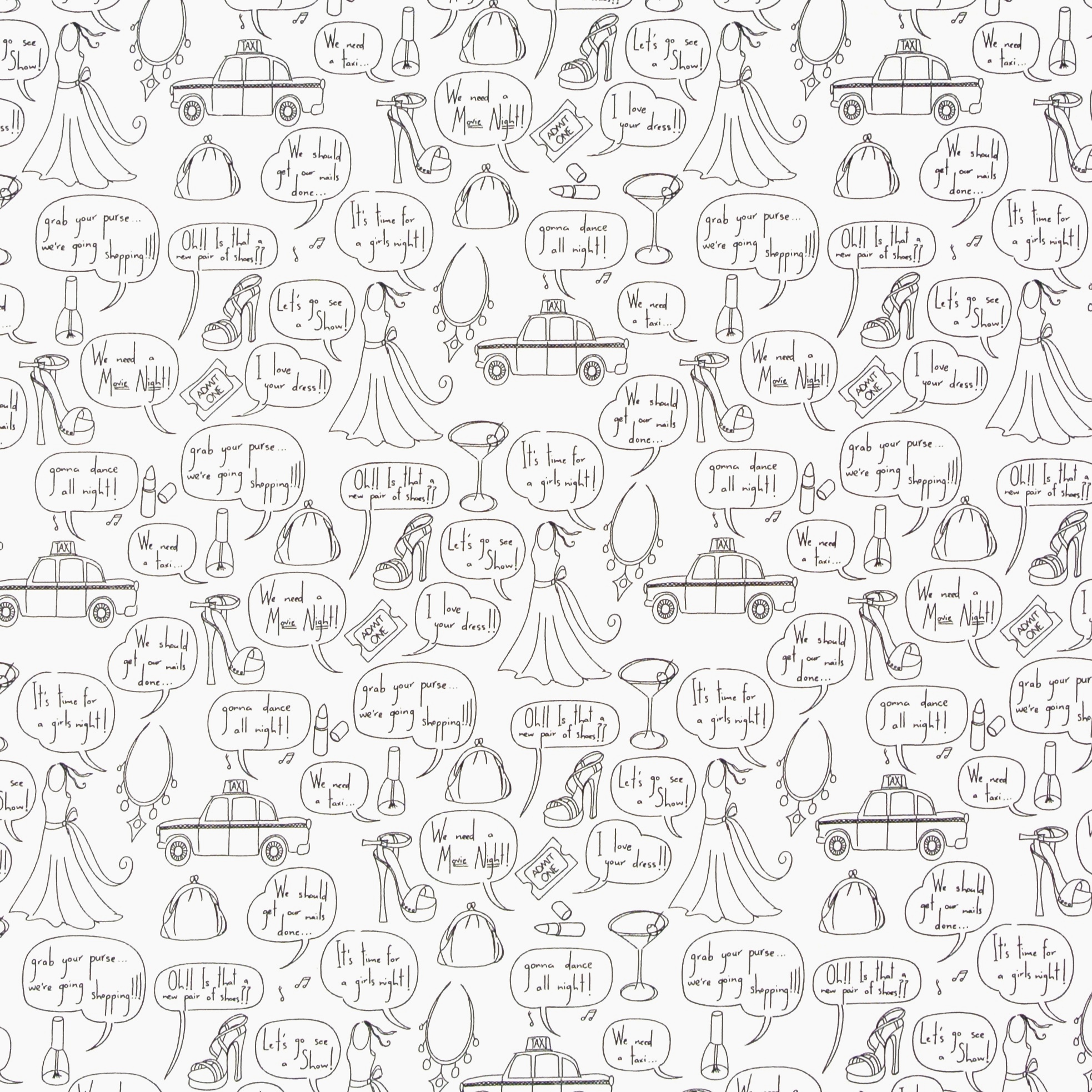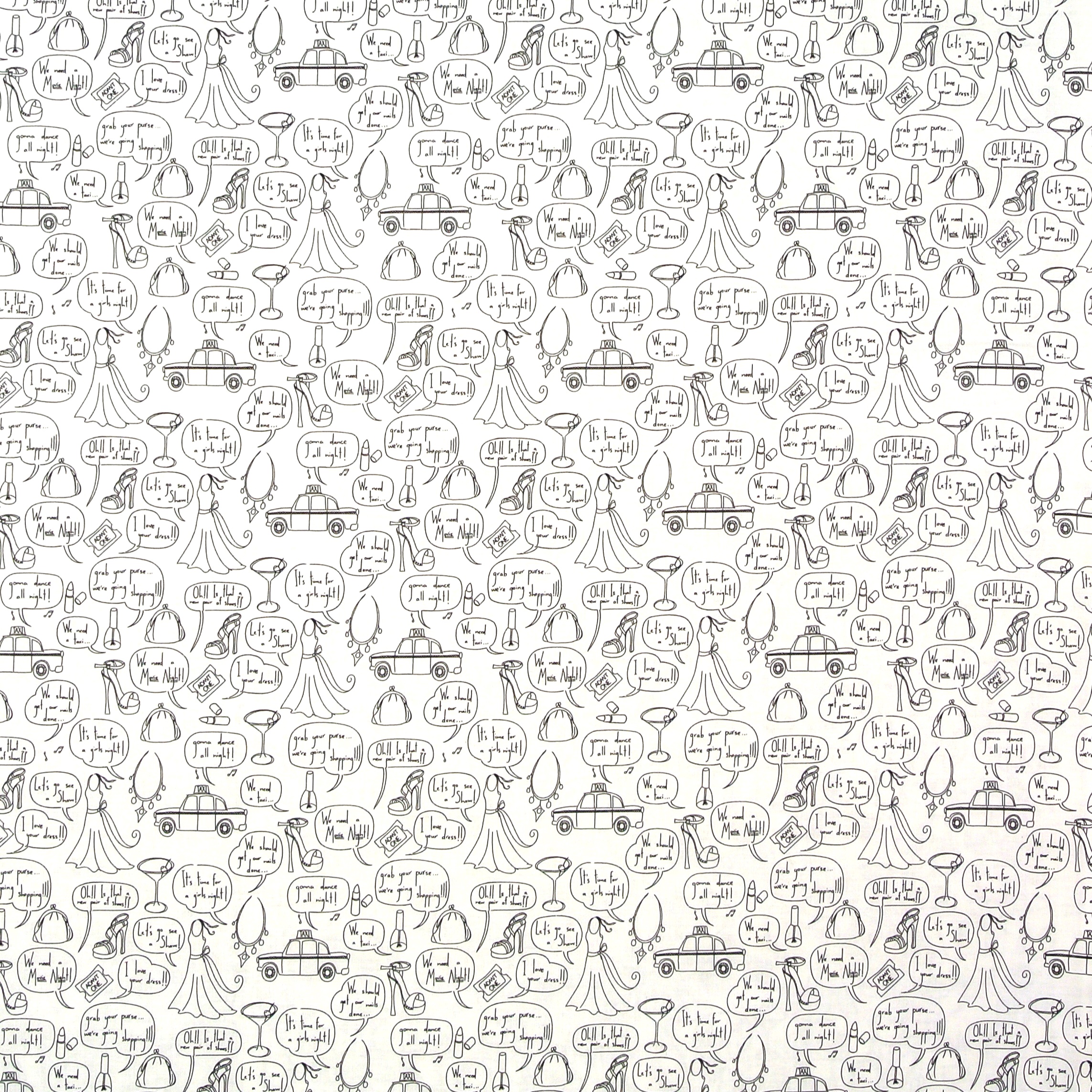 Patchworkstoff mit vielen Schuhen, Mode und Kosmetik in schlichtem Schwarz-Weiß aus der Serie "Girls Night Out" - ein ausgefallener Stoff für Patchwork, Kosmetiktaschen, Projekttaschen und Dekorationen.