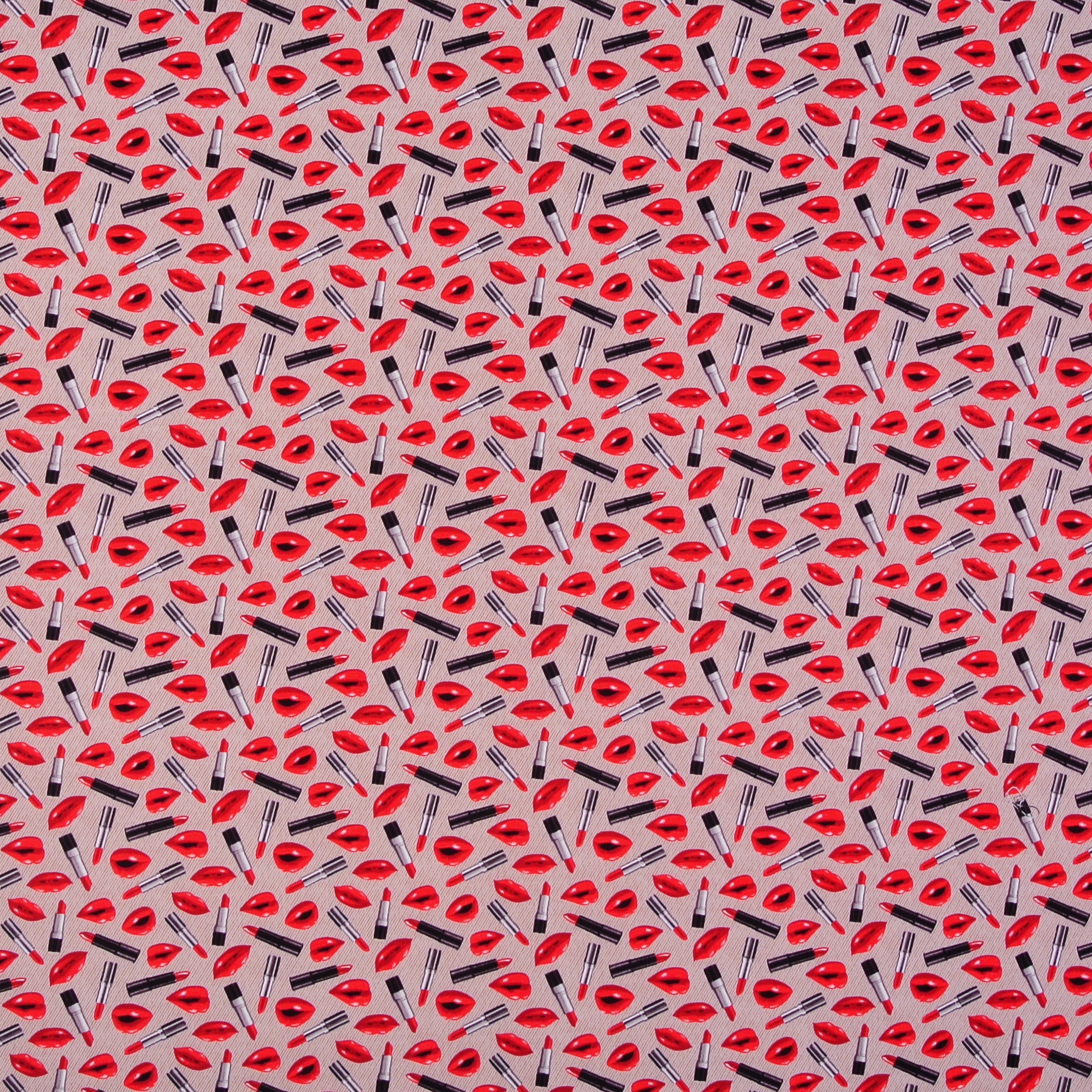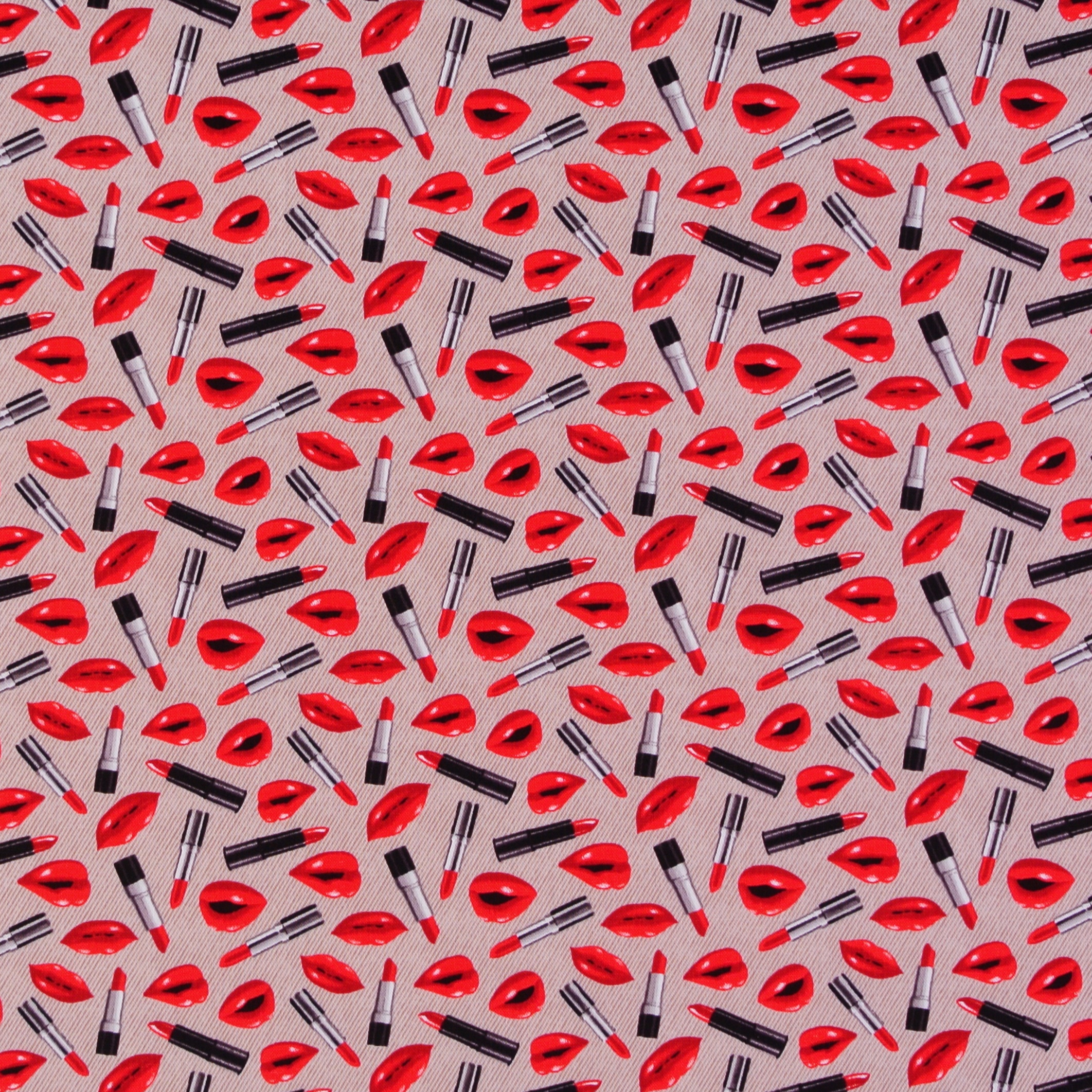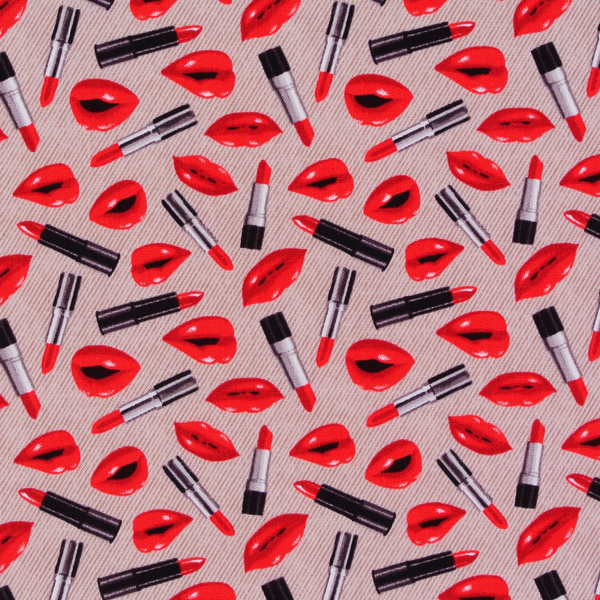 Patchworkstoff mit vielen Lippenstiften und Lippenabdrücken auf Hellbeige aus der Serie "Paris".