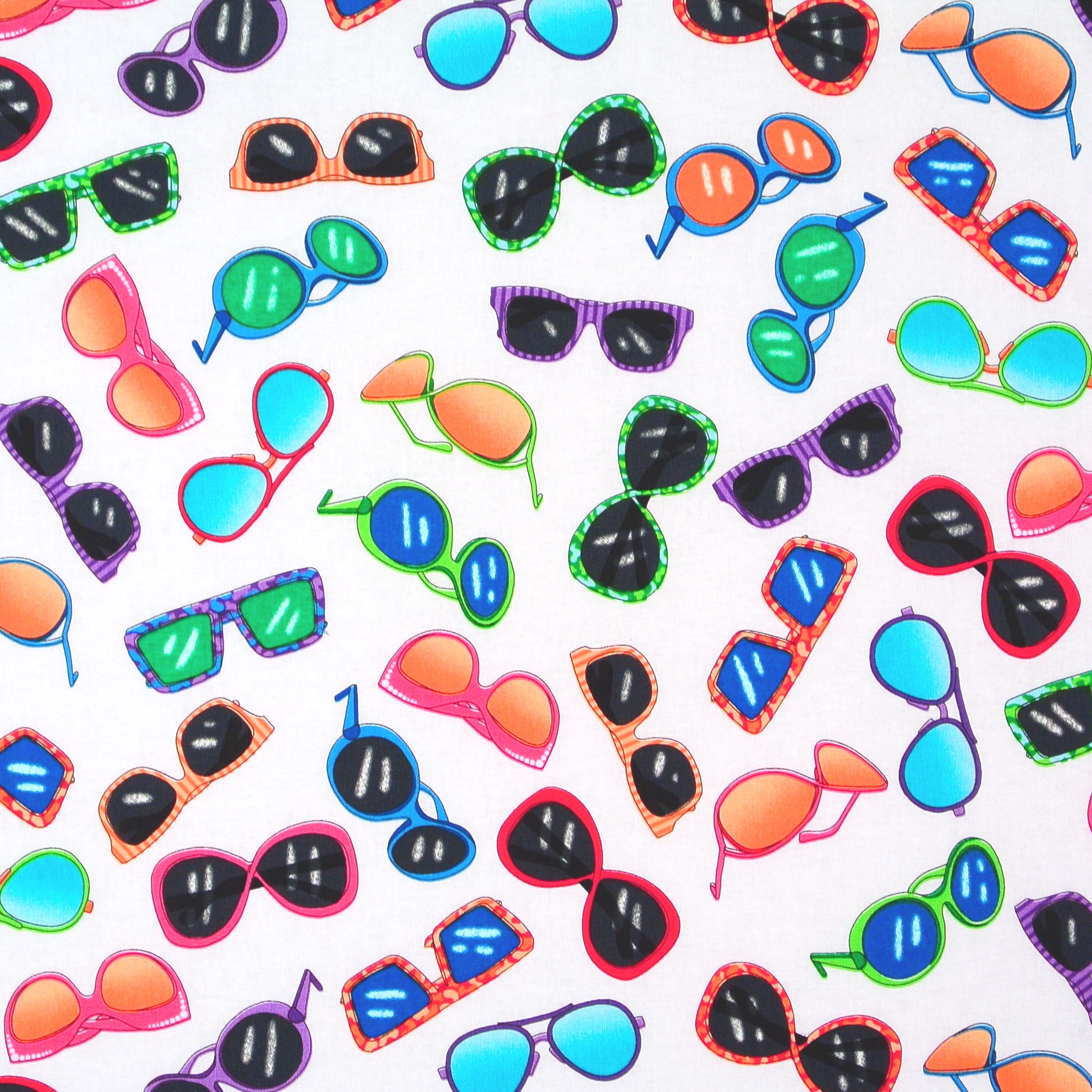 Patchworkstoff mit vielen verschiedenen bunten Sonnenbrillen auf Weiss aus der Serie "Girls Weekend".