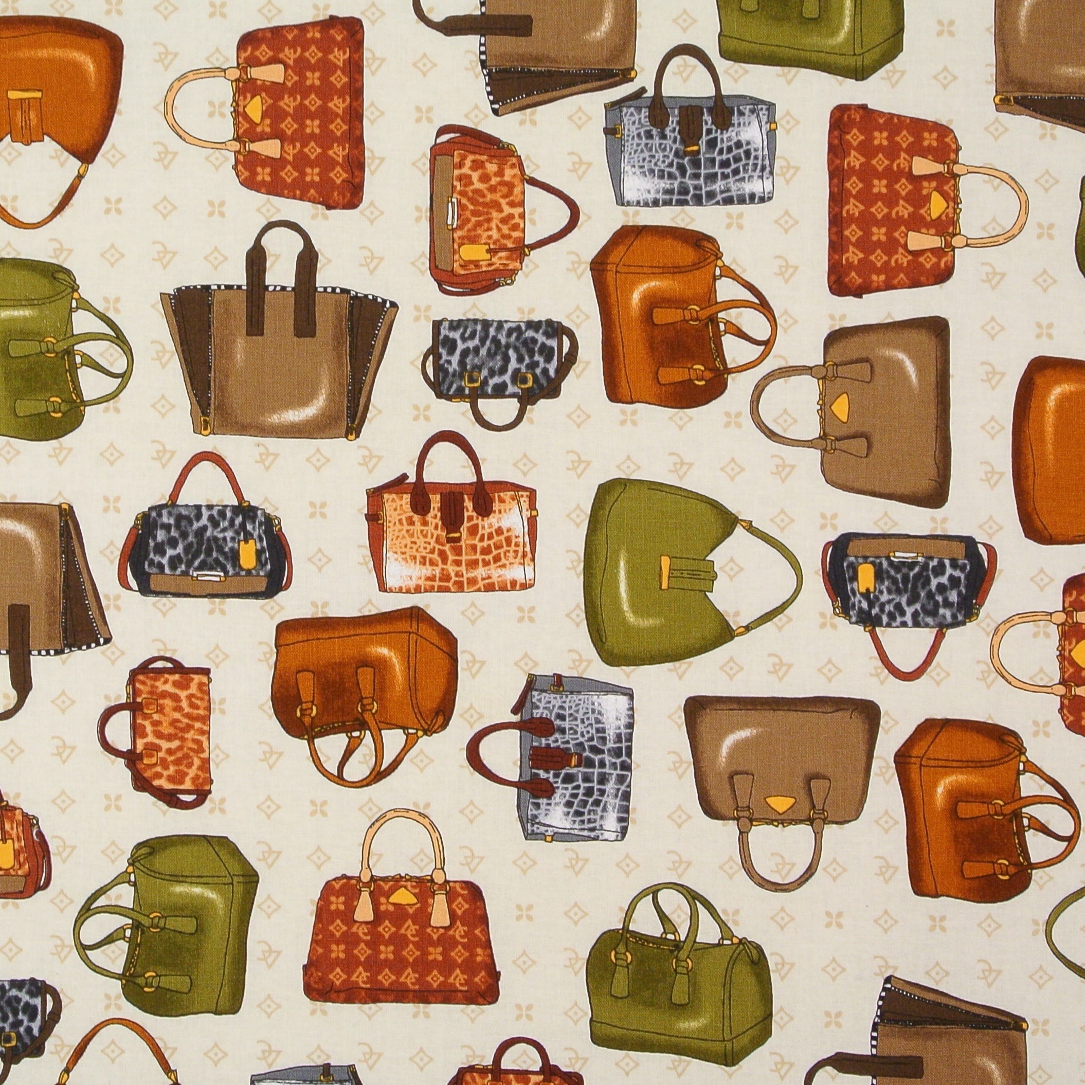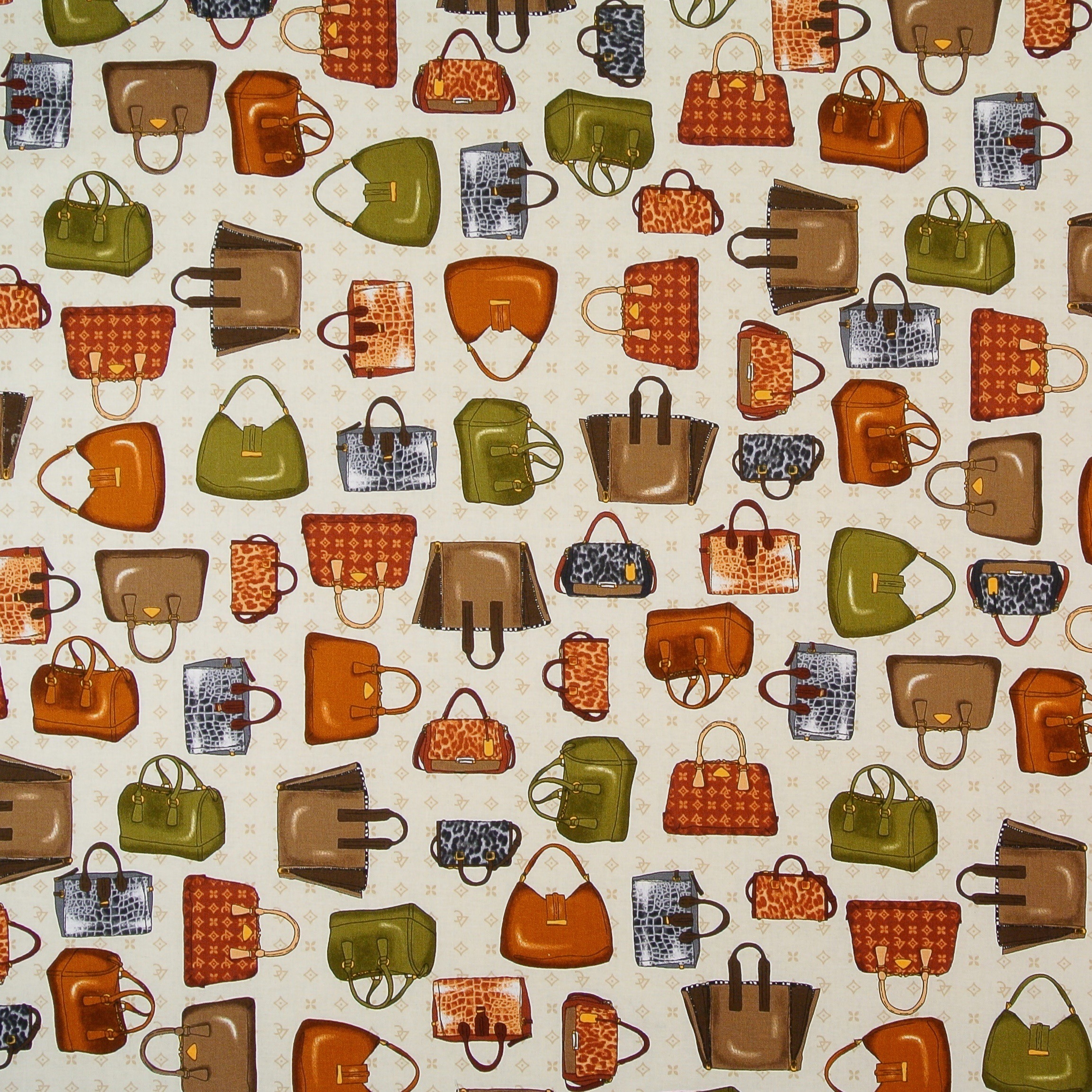 Schönes Wochenende ... Patchworkstoff mit vielen verschiedenen Handtaschen auf Hellbeige aus... mehr
