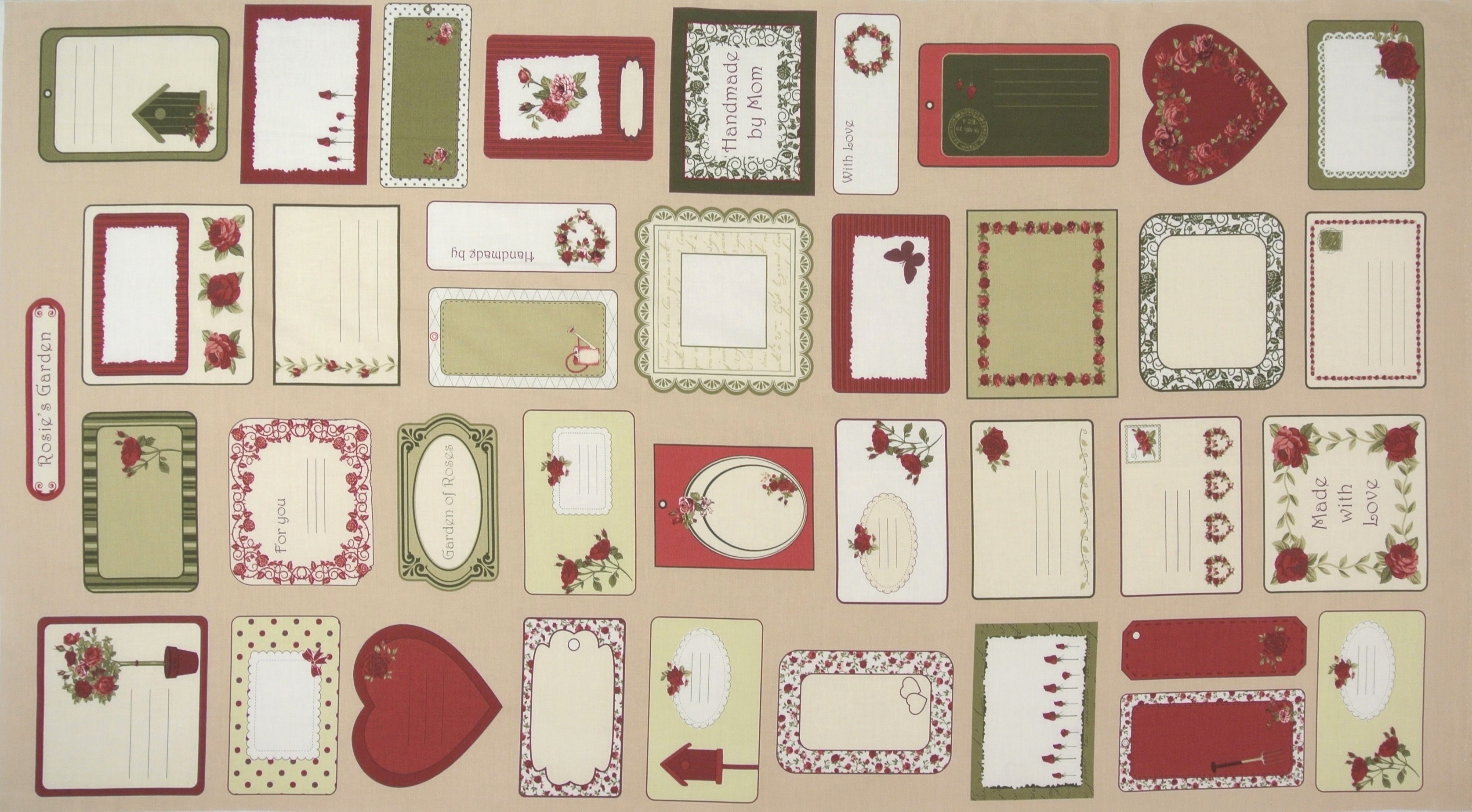SALE Patchworkstoff mit romantischen Labels mit Gartenmotiven aus der Serie "Rosies Garden" - wunderschön für das Personalisieren von handgemachten Dingen, für textile Karten und Geschenkankänger..