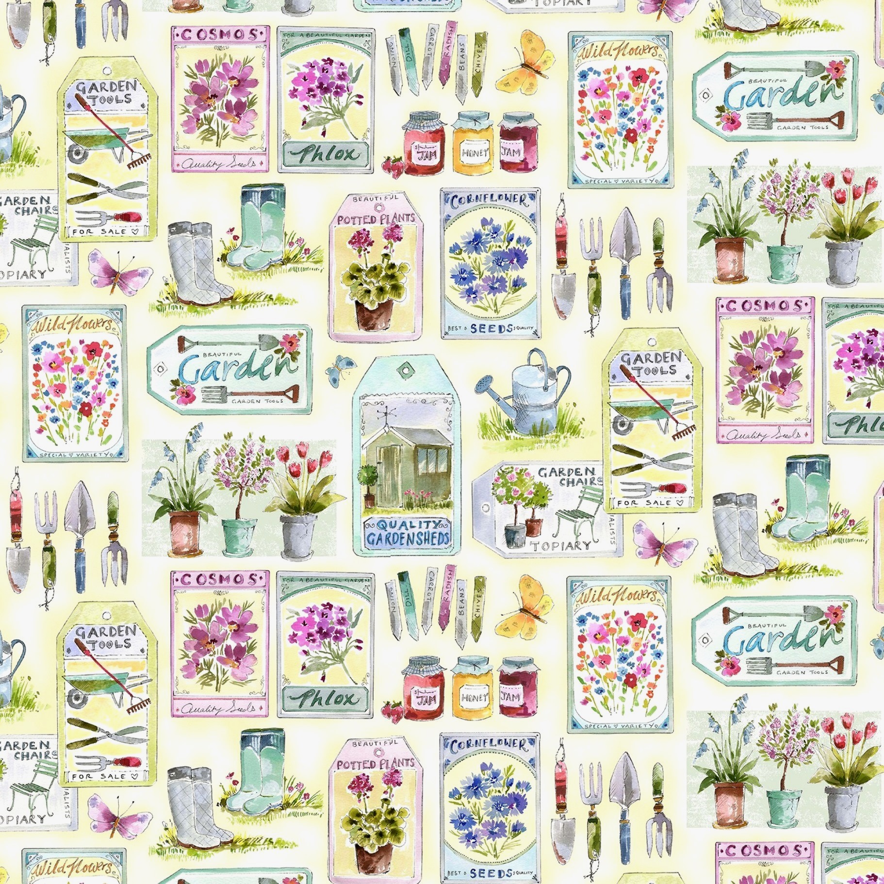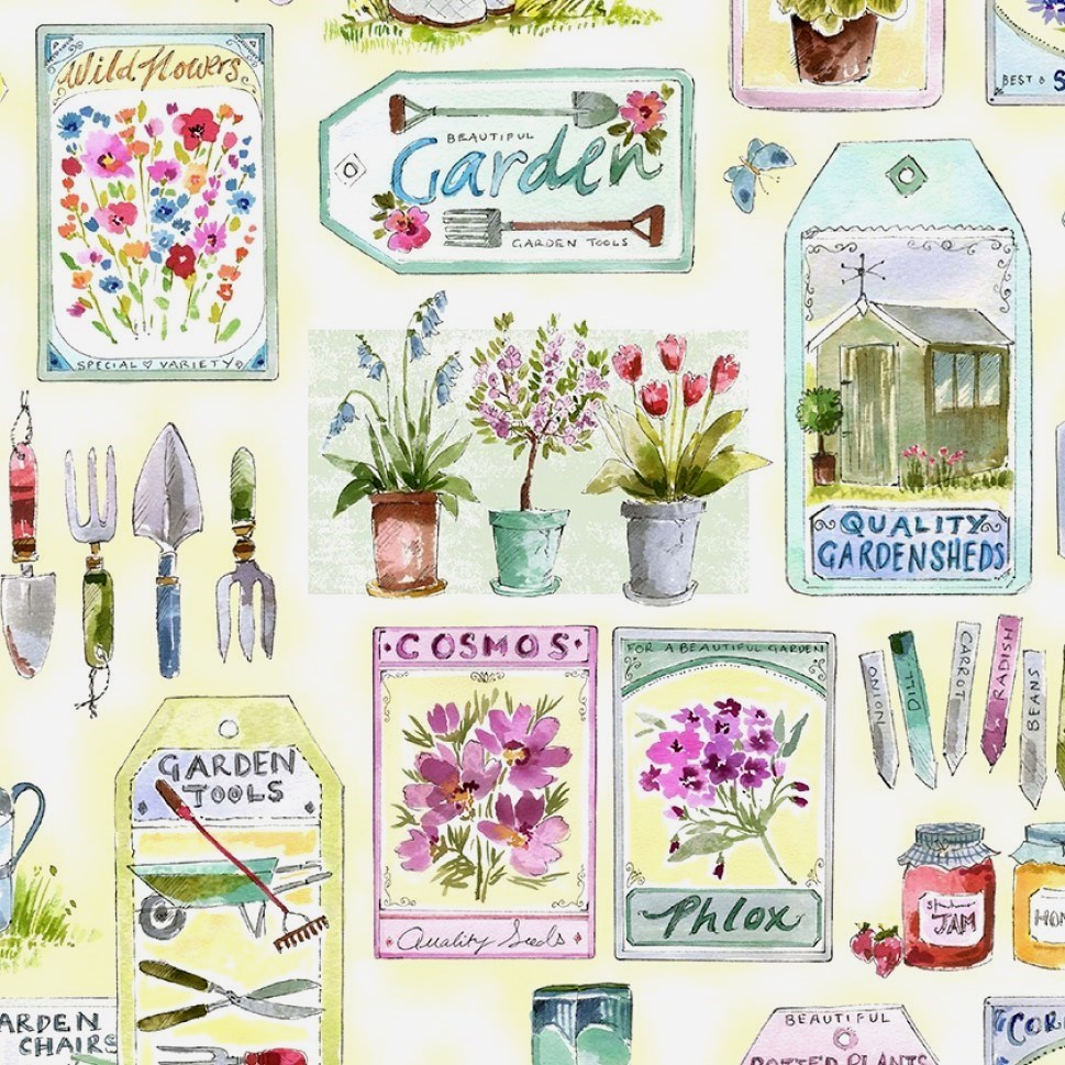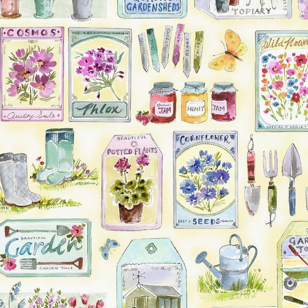 Ein sommerlicher, zart gezeichneter Stoff von Michael Miller für alle, die den Garten und das Gärtnern lieben.