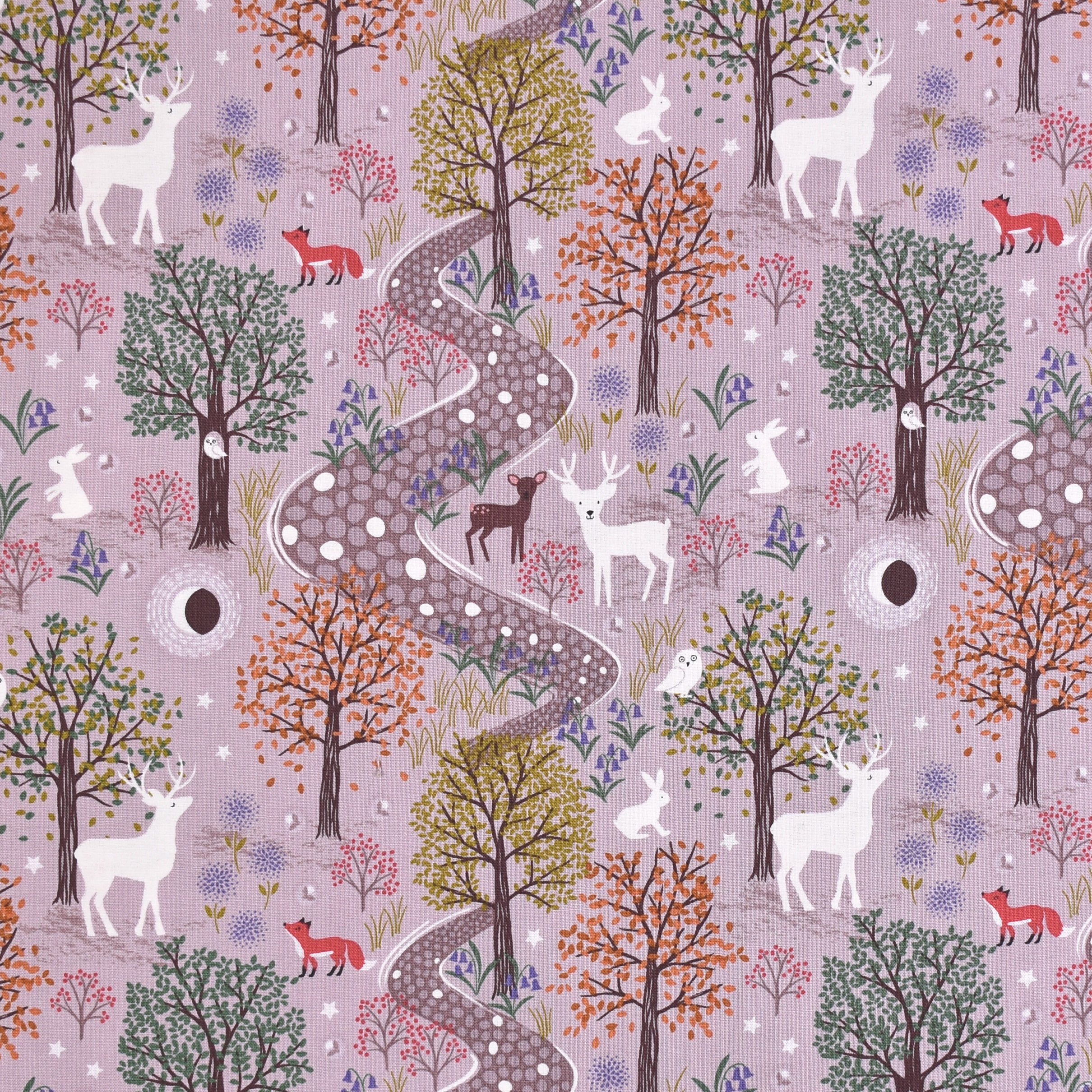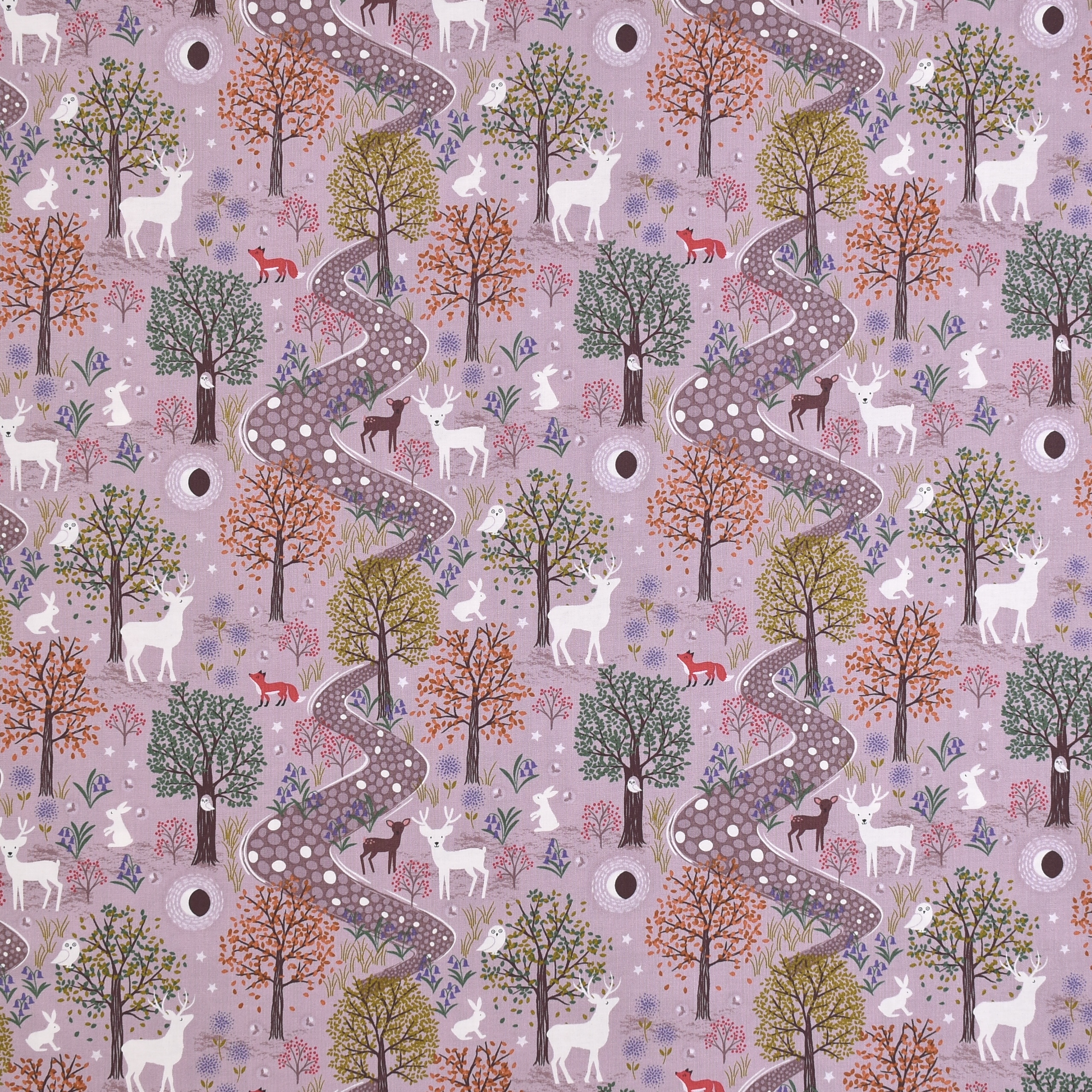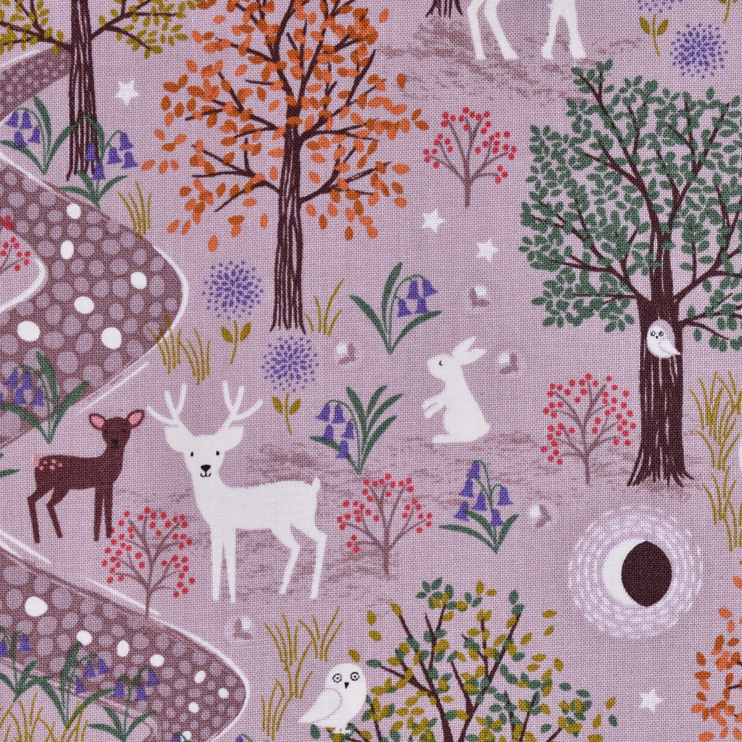 Patchworkstoff mit Bäumen, Tieren und Wegen auf Altrosa aus der Serie "Nighttime in Bluebell Wood" von Lewis & Irene.
