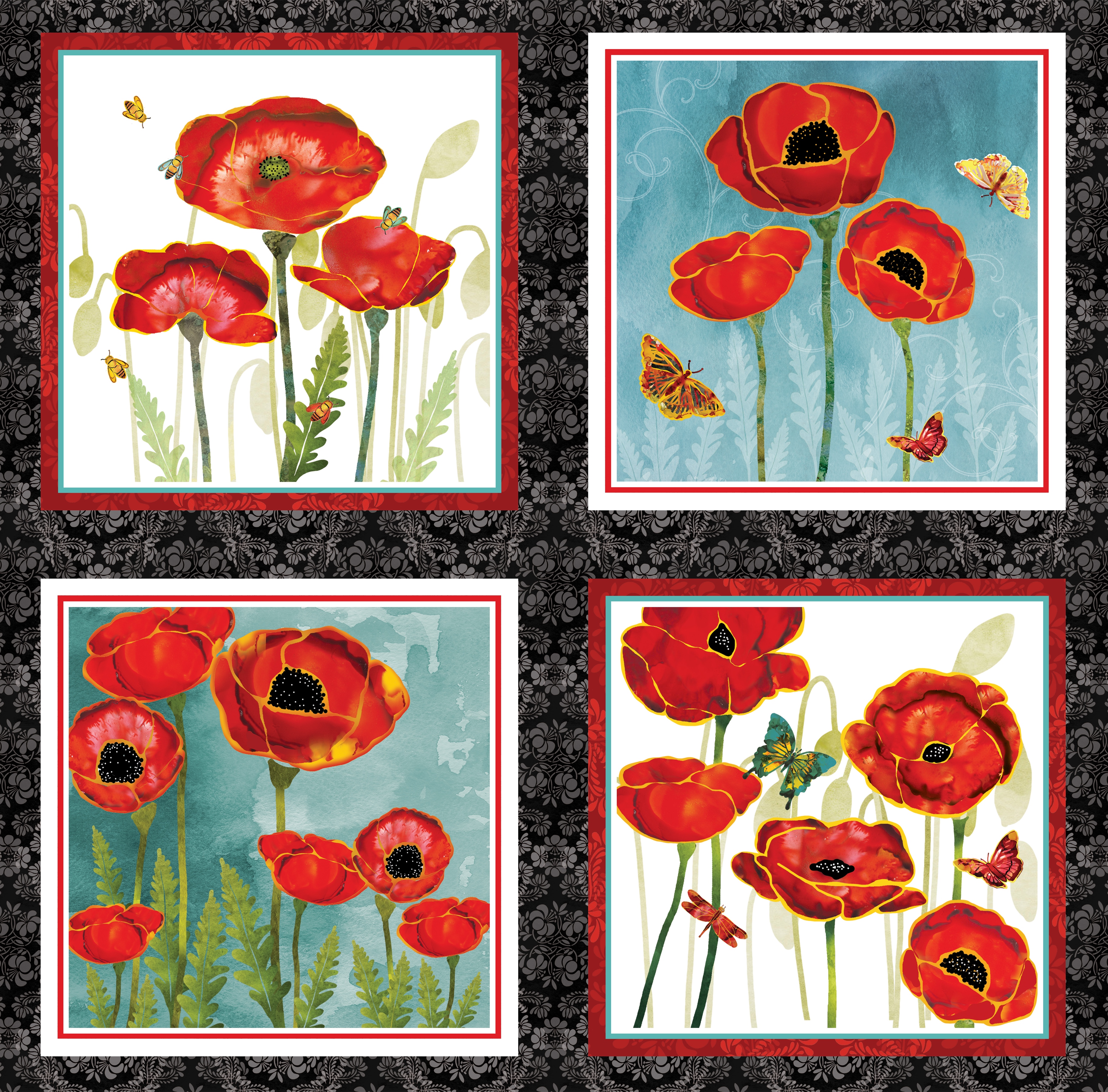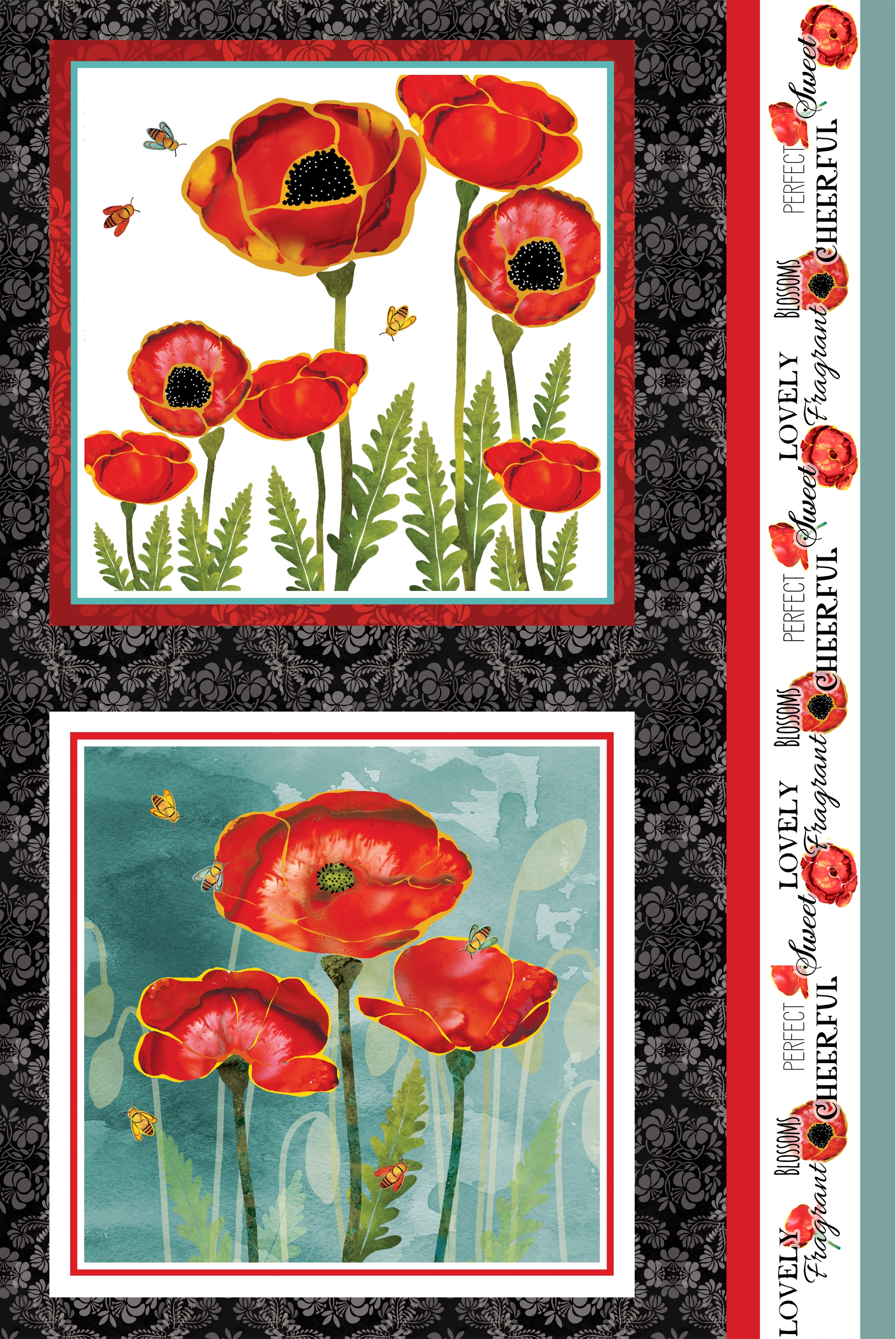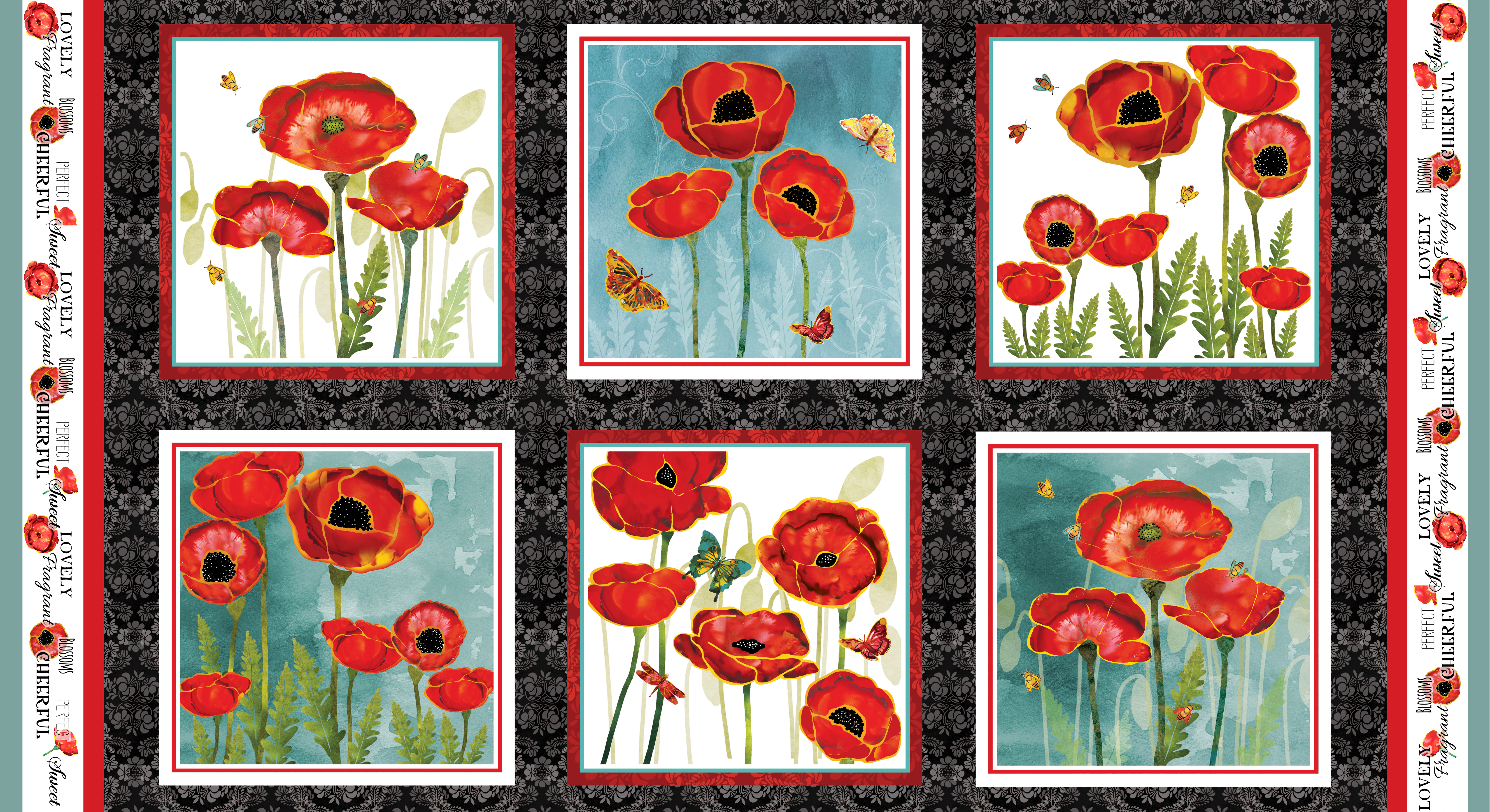 Großes florales Patchworkstoff Panel bedruckt mit üppigen Mohnblumen, Schmetterlingen und kleinen Bienen aus der Serie "Poppy Days".