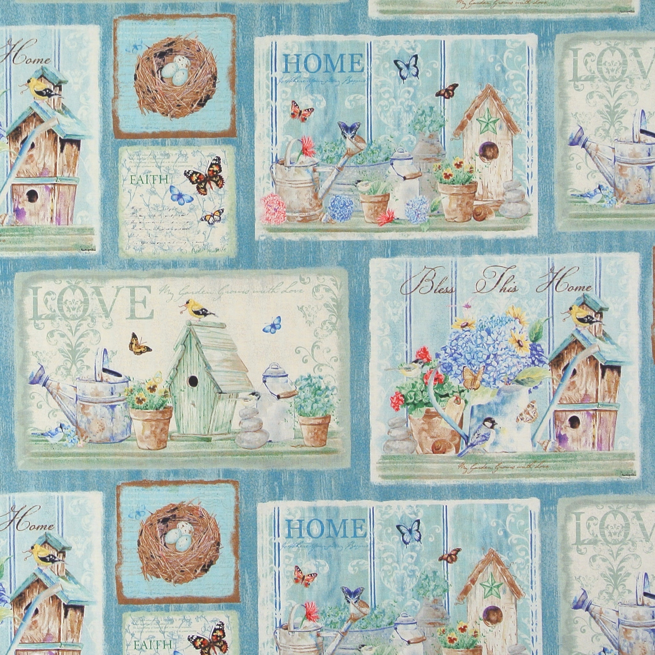 Romantischer Patchworkstoff mit kleinen Gartenmotiven und Schriftzügen passend zu den Stoffen aus der Serie "Dream Garden".