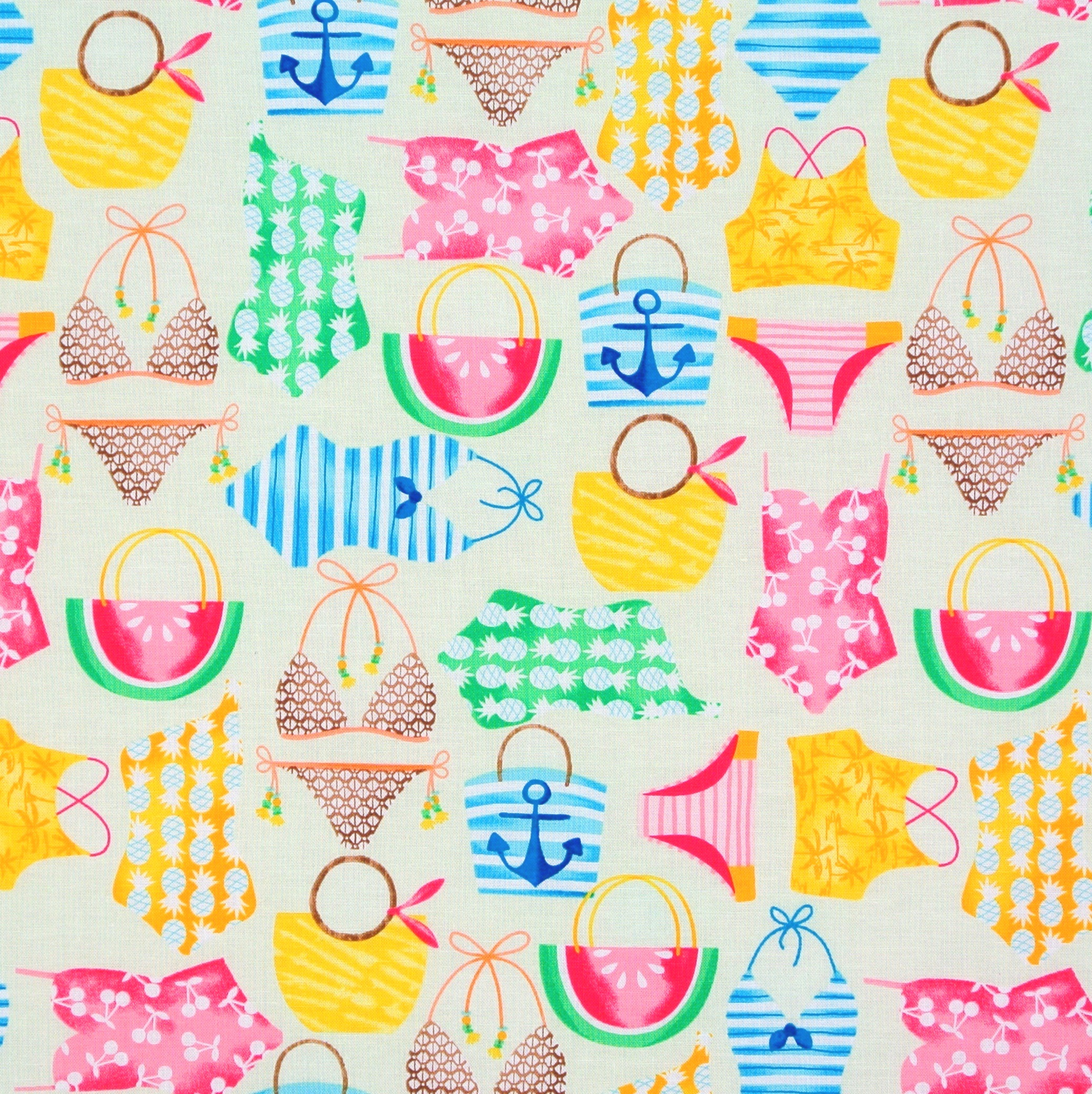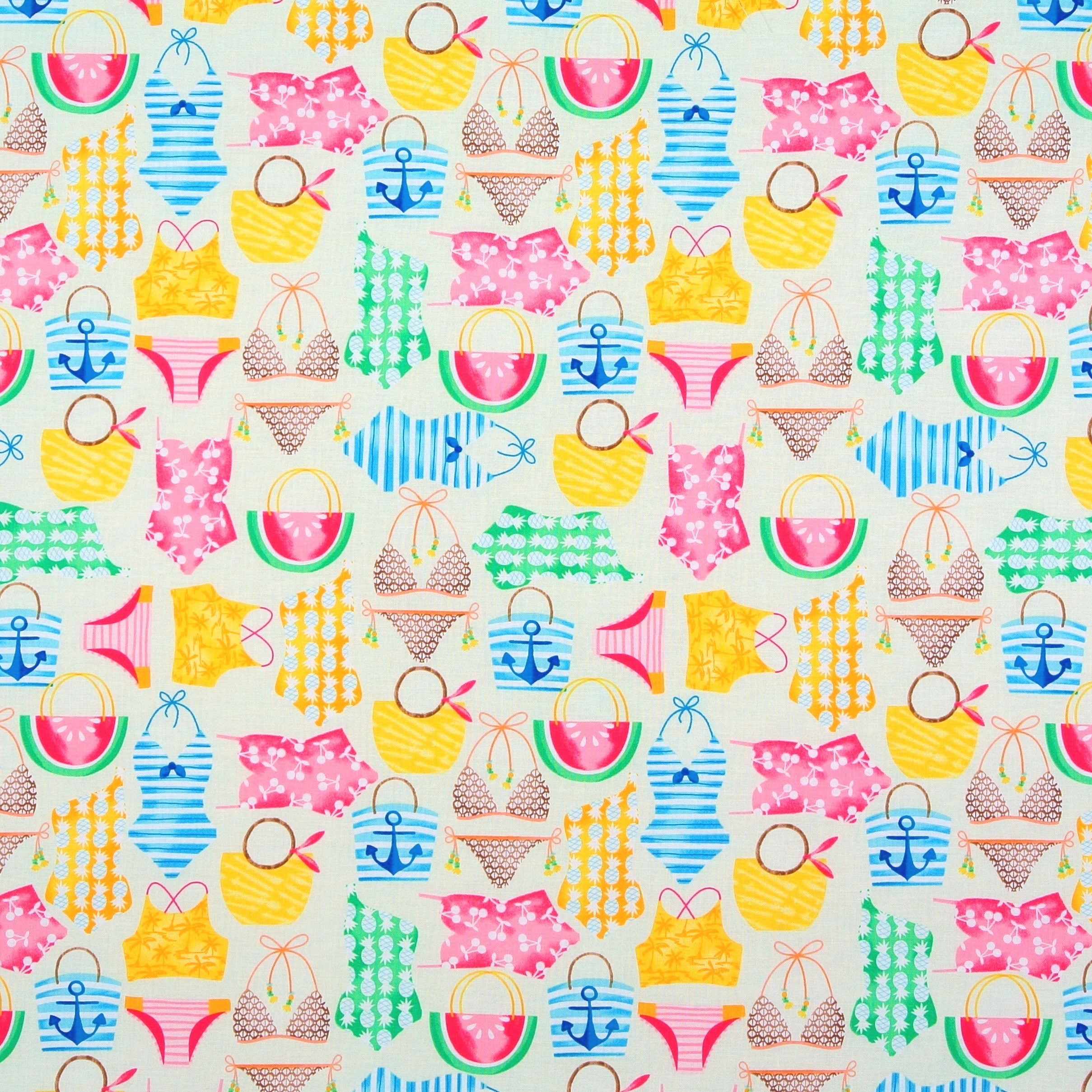 Sommerlicher Patchworkstoff mit vielen bunten Badeanzügen auf Hellbeige aus der Serie "Just Beachy".