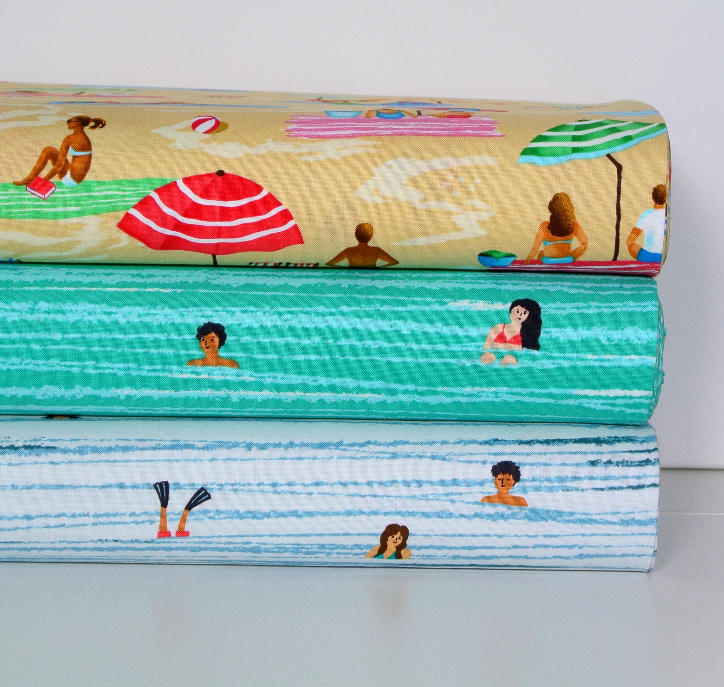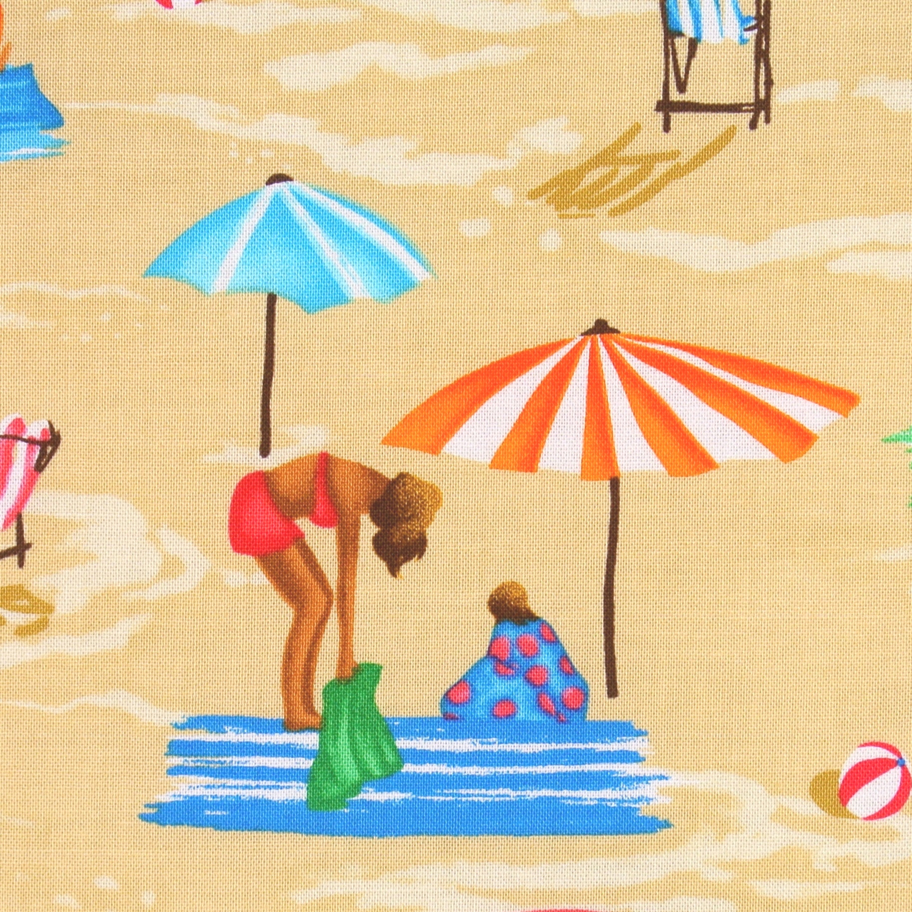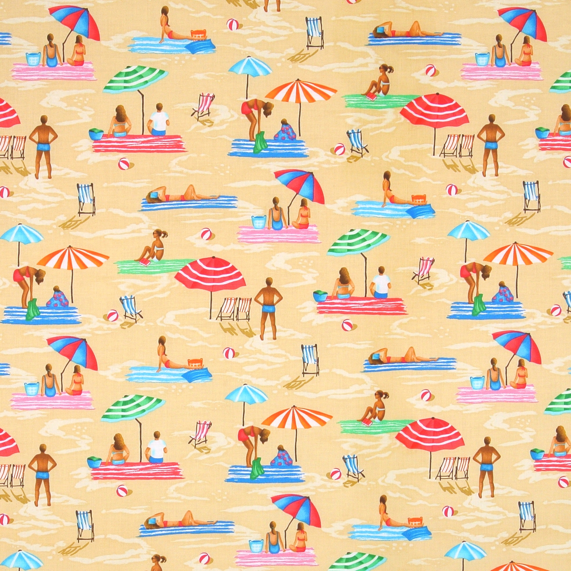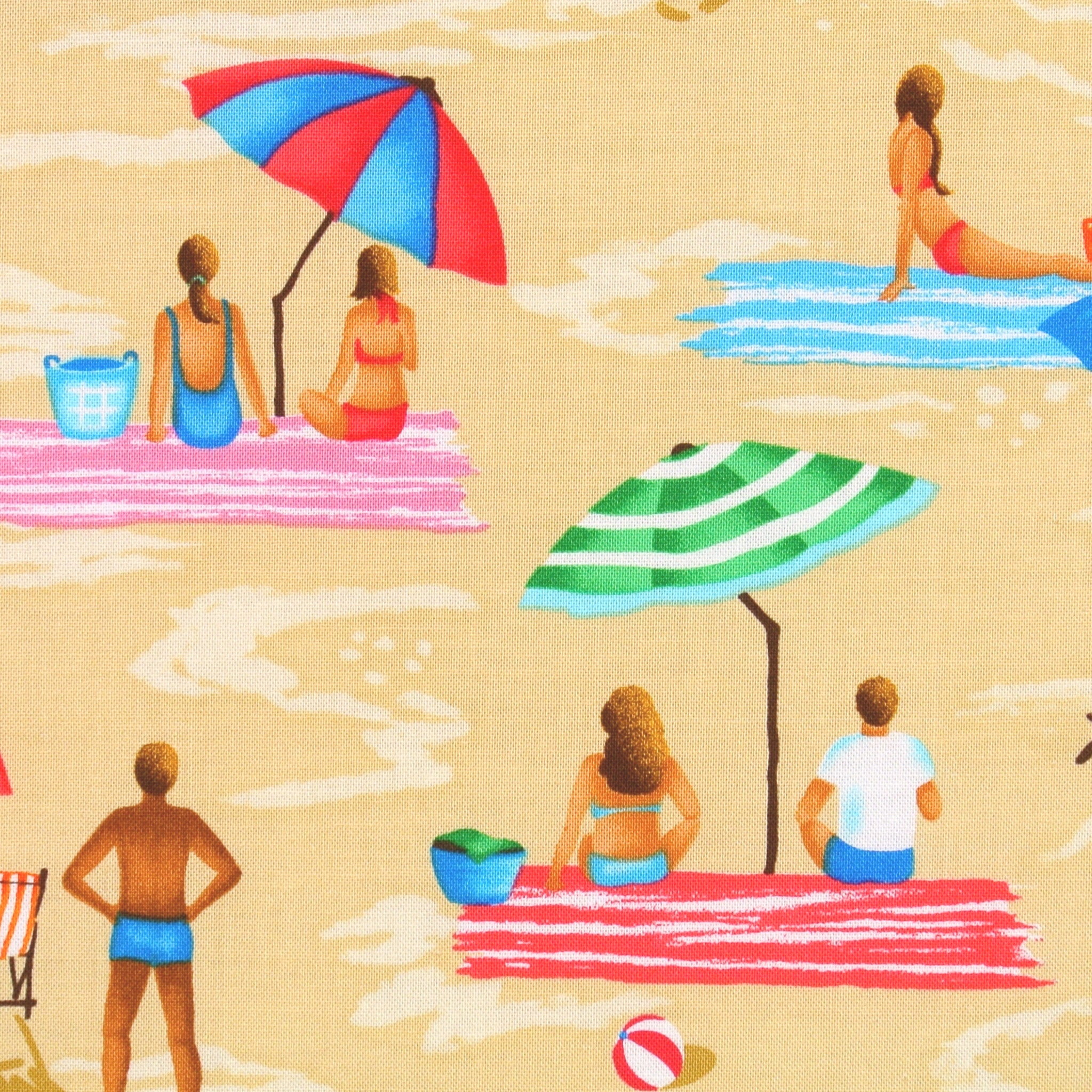 Sommerlicher Patchworkstoff mit fröhlichen, entspannten Sonnenanbetern unter bunten Sonnenschirmen am Strand aus der Serie "Sun and Fun" von Michael Miller.