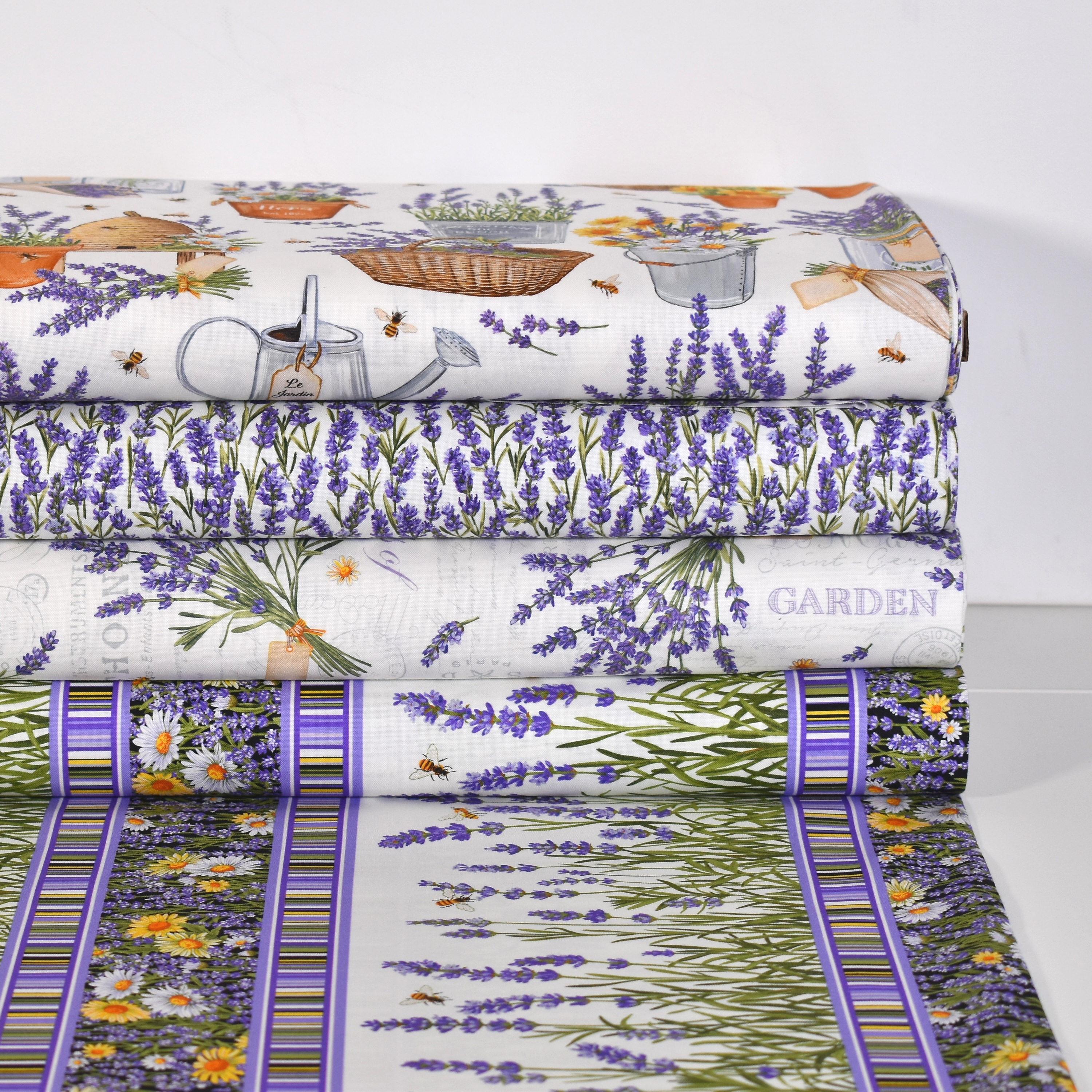 Der Duft der Provence: Patchworkstoff mit Lavendel, Sommerblumen und Bienen aus der Serie "Lavender Market" von Northcott".