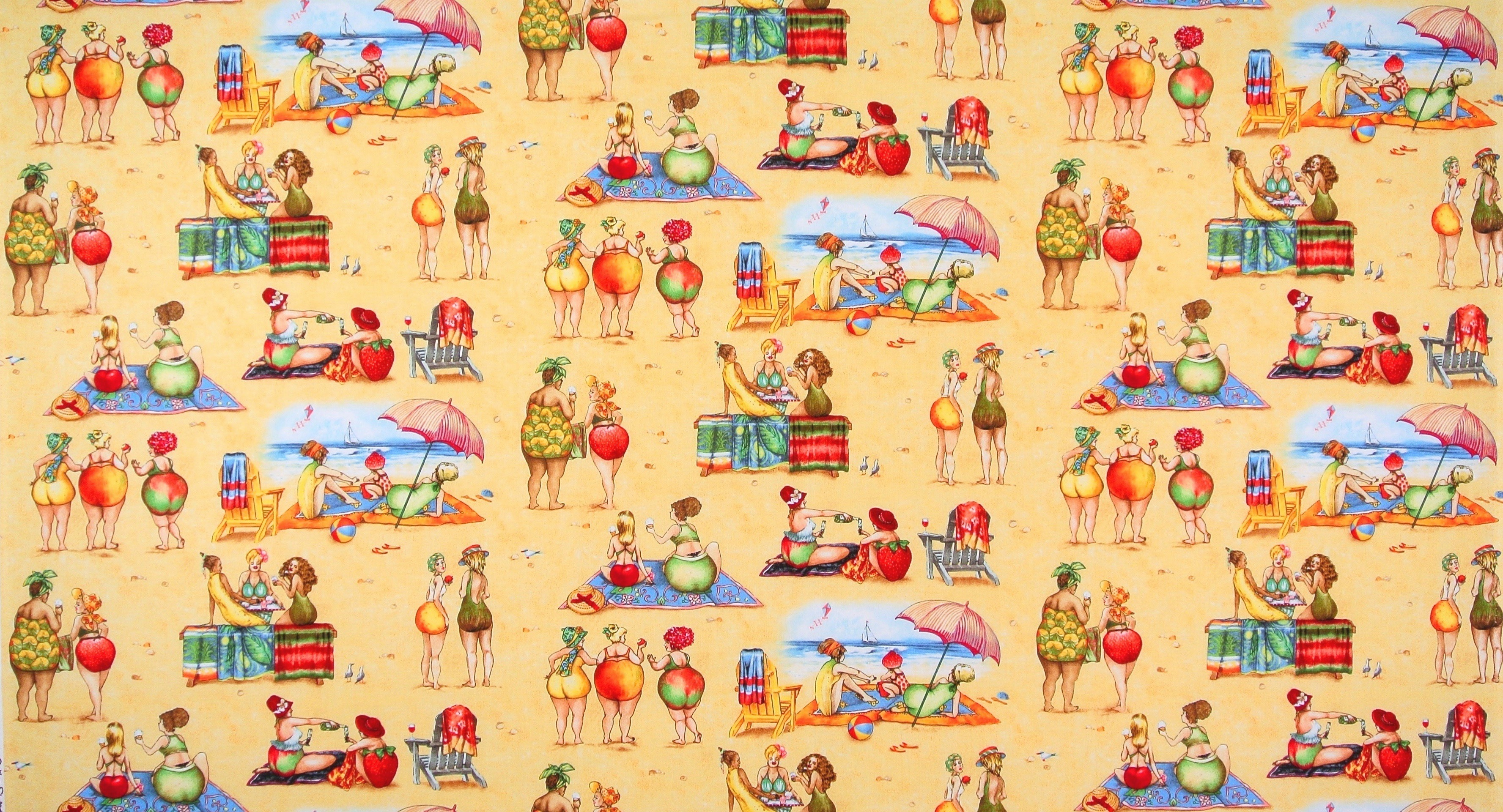 Patchworkstoff mit herrlich witzigen, selbstbewussten Frauen am Strand aus der Serie "Fruit Ladies" von Mary Stewart.