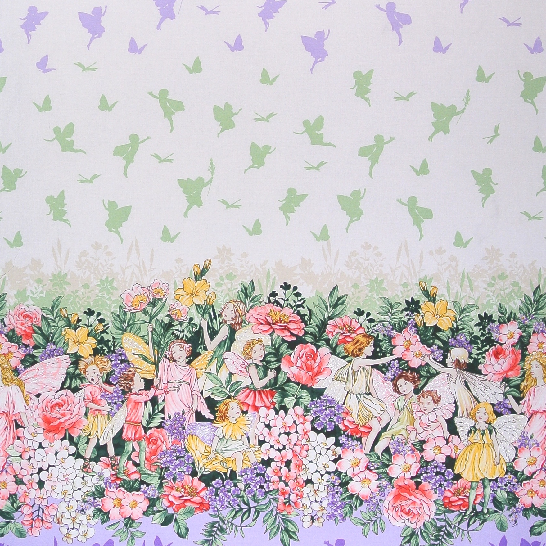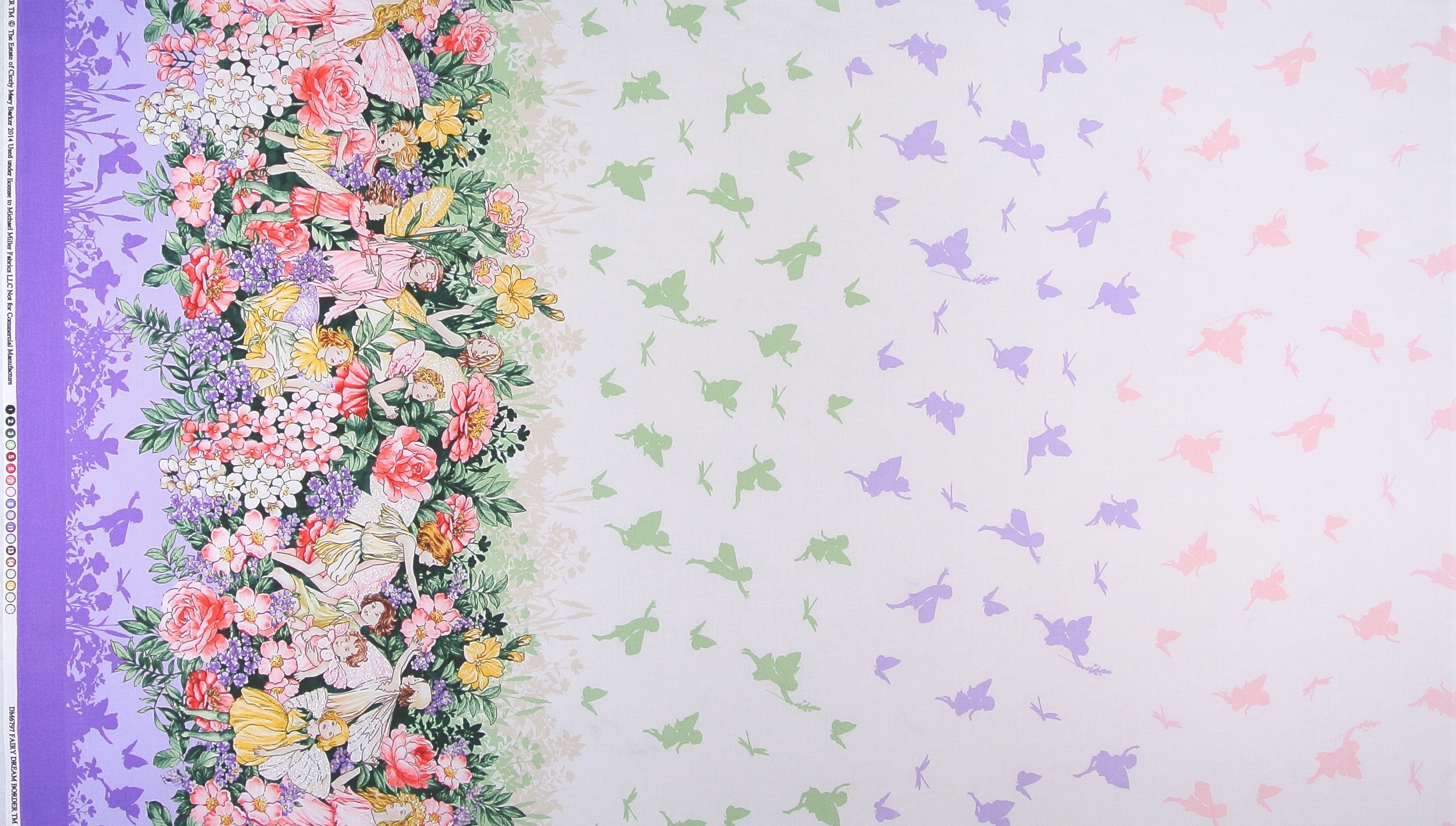 Dreamland Fairies -  Patchworkbordürenstoff mit üppigen Blumen und Elfen.Wunderschön für Patchwork und Dekorationen. Die Bordüren verlaufen längs und parallel zu den Webkanten.