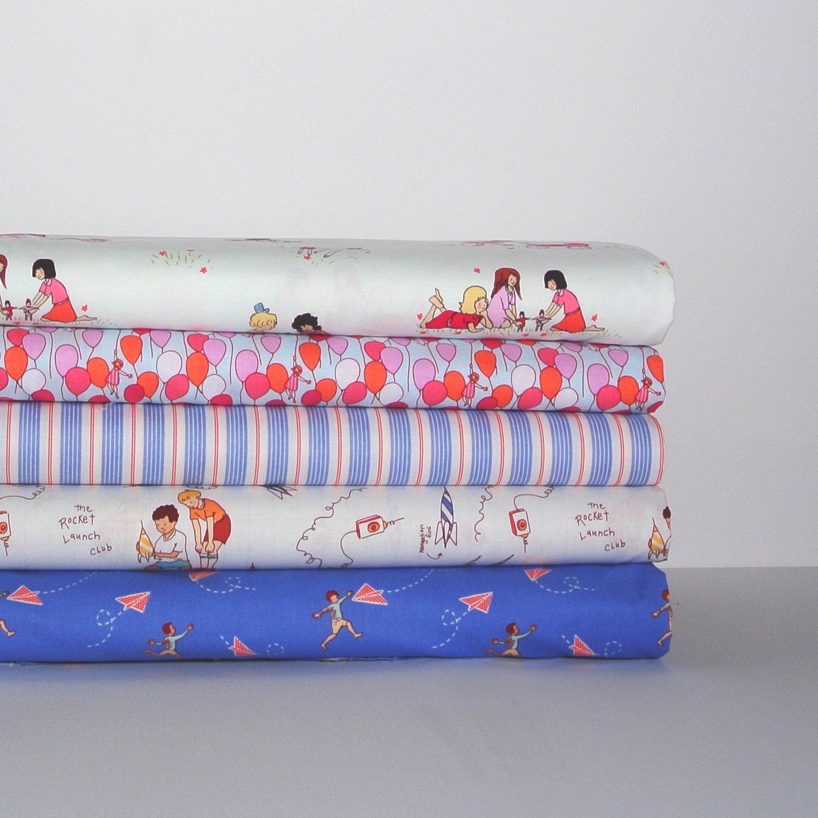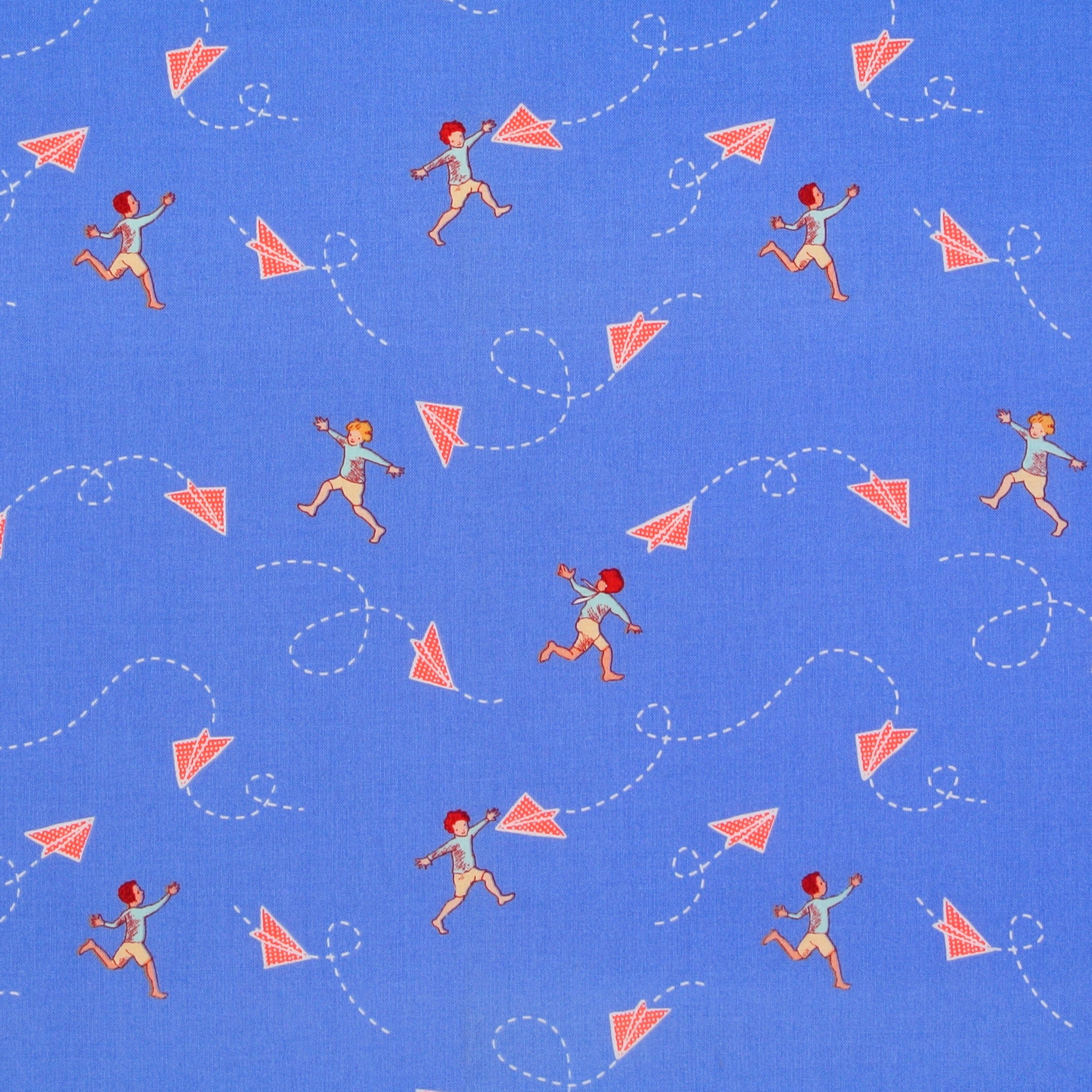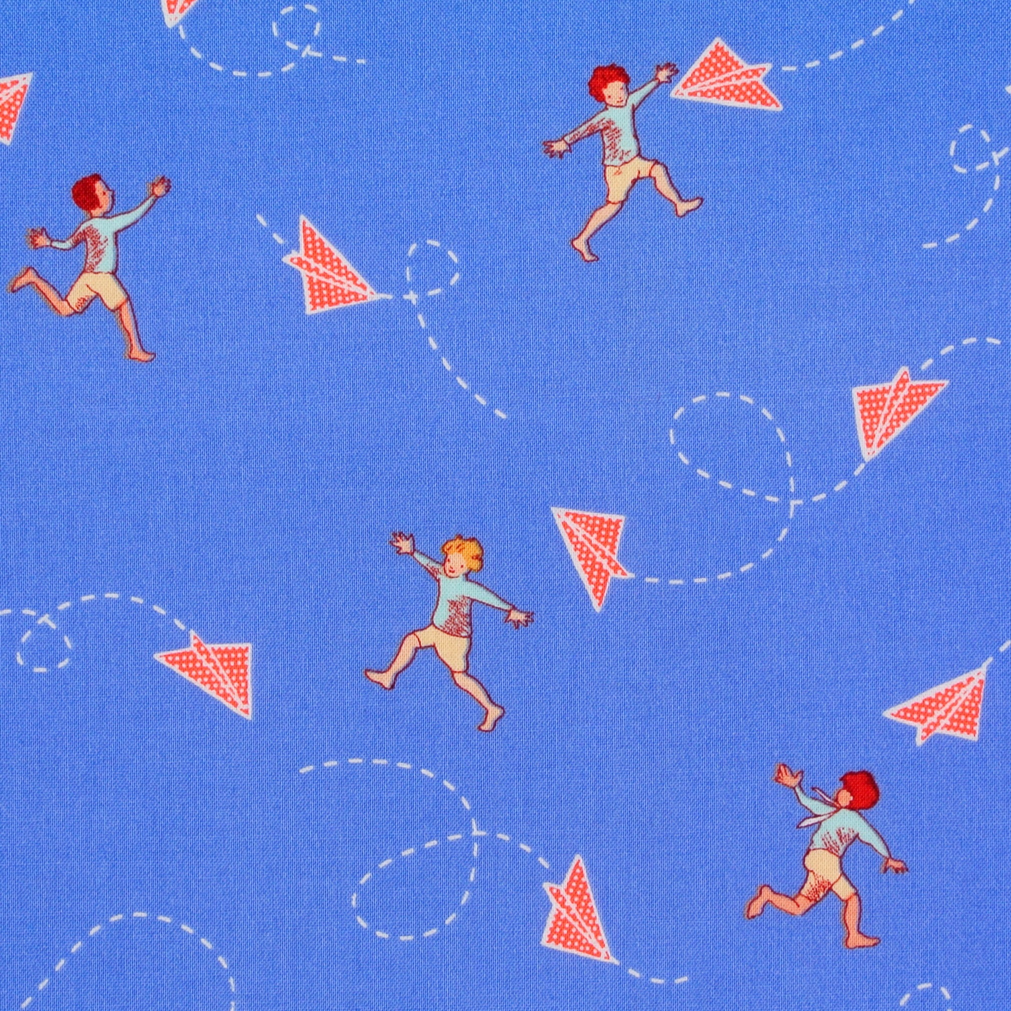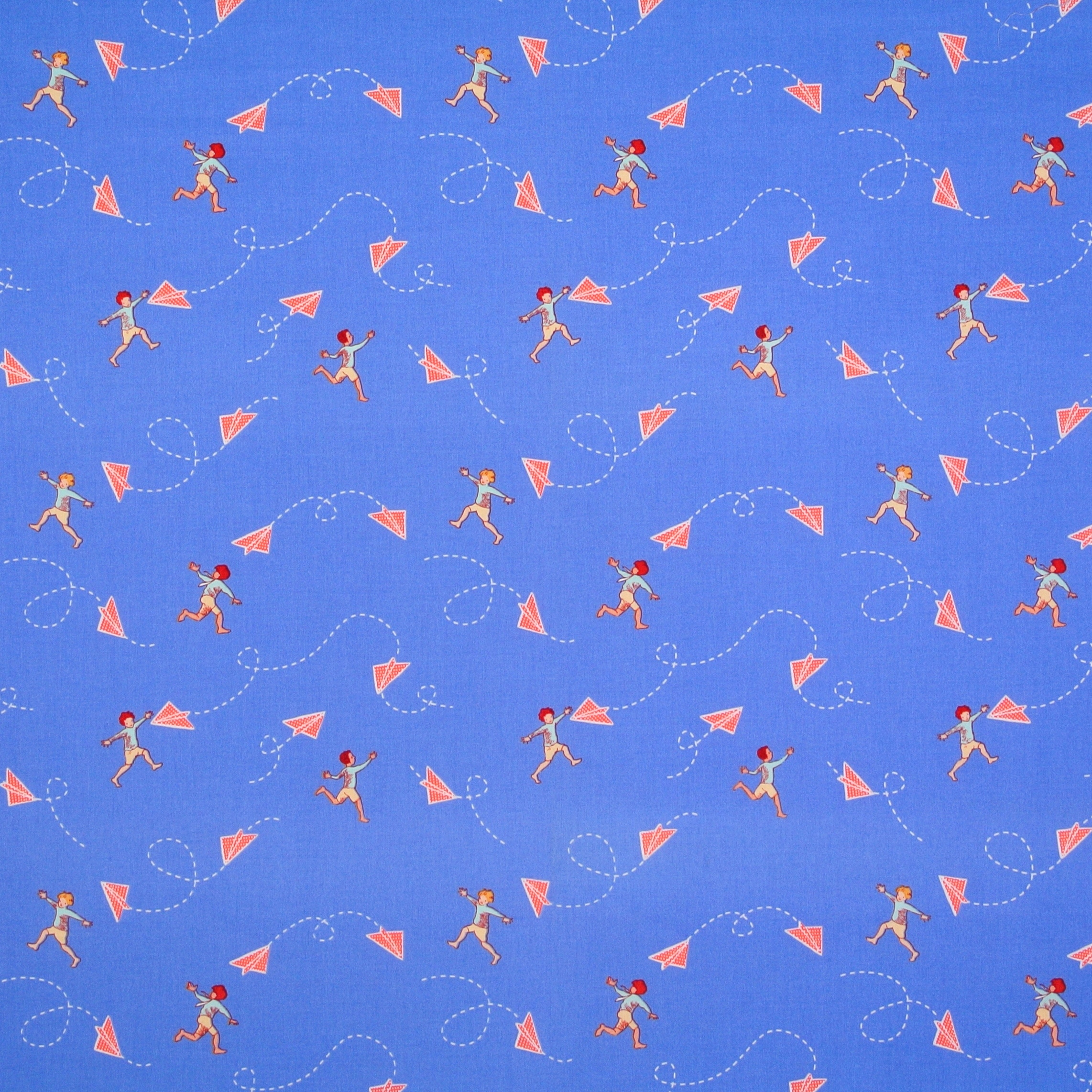 Patchworkstoff mit Papierfliegern und kleinen Jungen auf Blau - ein schöner Stoff für Patchwork, Kindersachen und Dekorationen fürs Kinderzimmer.