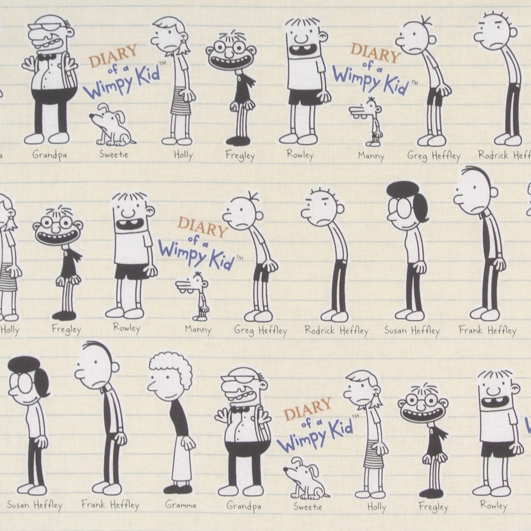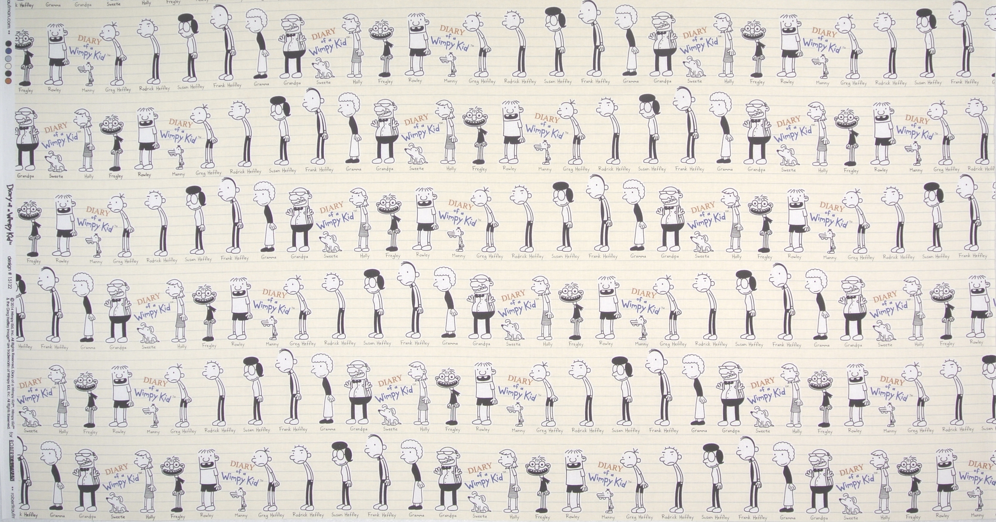 Patchworkstoff mit Motiven aus den Comicbüchern rund um Greg und seine Freunde aus der Serie "Diary of a Wimpy Kid" - ein ausgefallener Stoff für JUngen und Mädchen.
