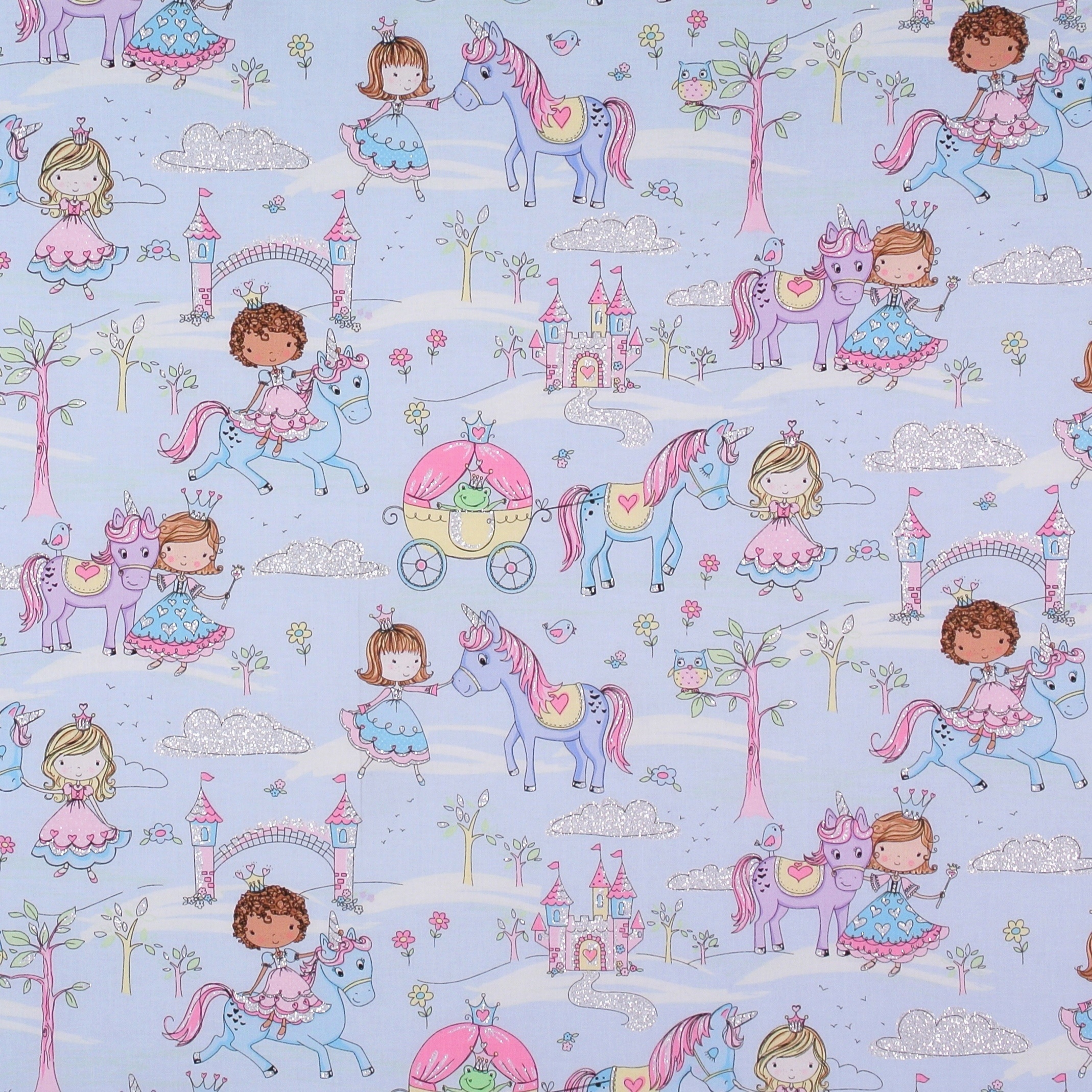 Zauberhaftes Design für kleine Mädchen: Patchworkstoff mit kleinen Prinzessinnen, Einhörnern und dem kleinen Froschkönig in der Kutsche auf Hellbau aus der Serie "Her Majesty". Er ist zart mit Glitter in Silber bedruckt.