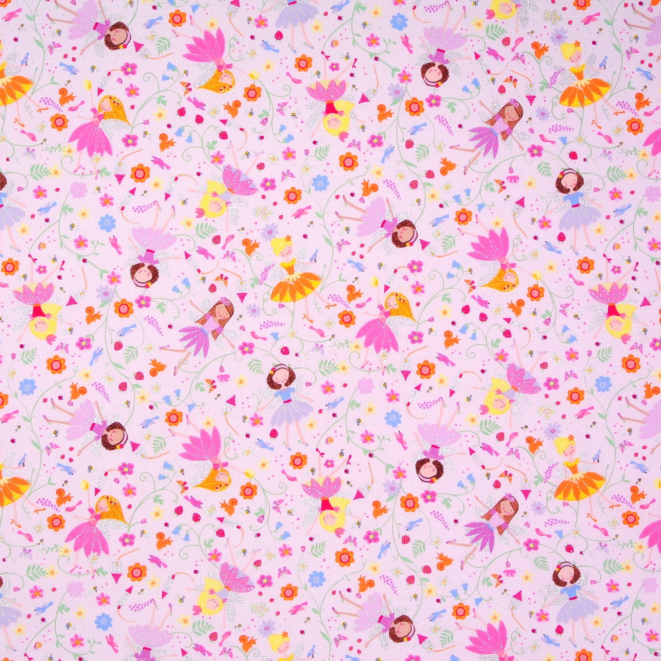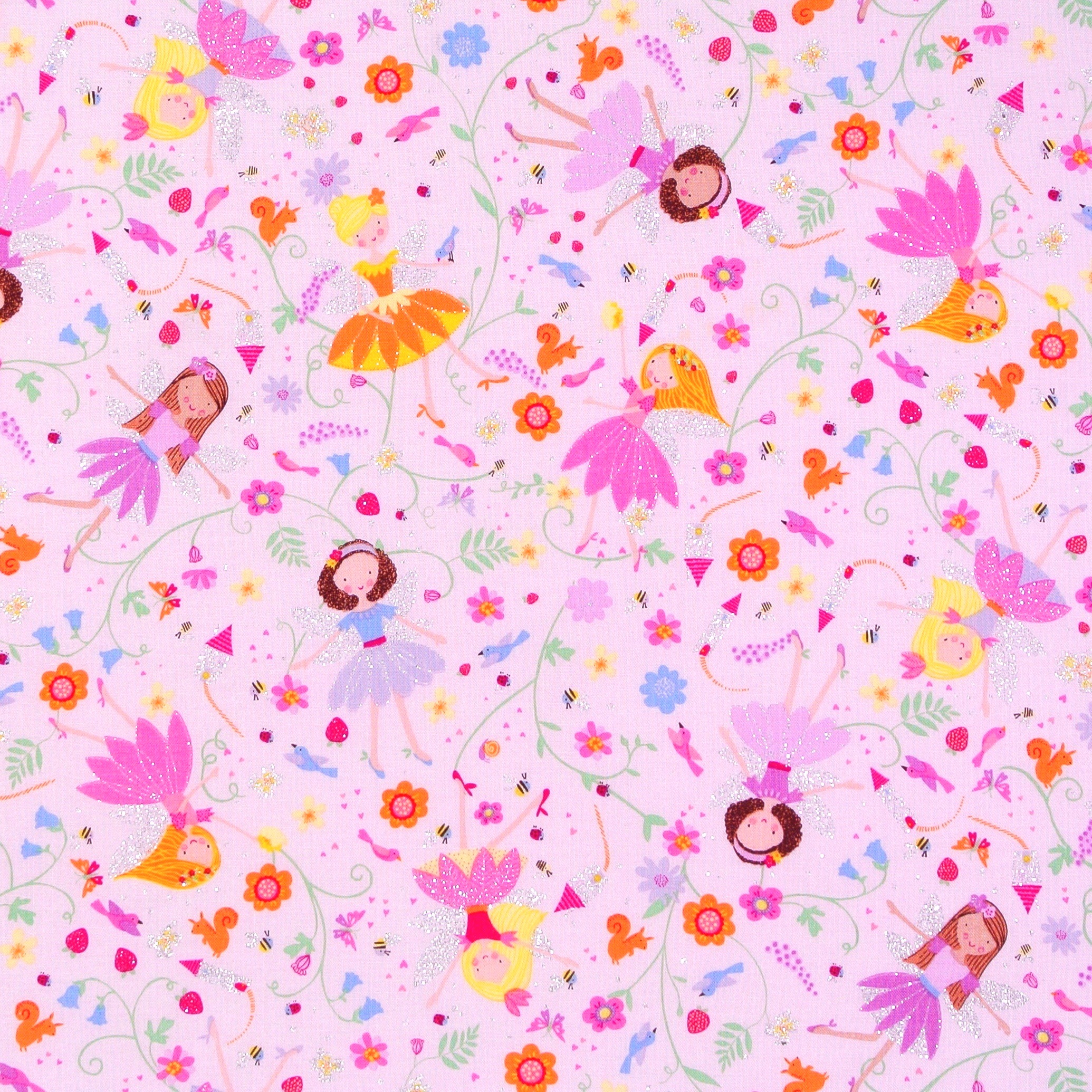 Patchworkstoff mit bezaubernden kleinen Elfen auf Rosa aus der Serie "Lavender Fairies" - ein wunderschöner Stoff für kleine Mädchen. Die Elfen sind zart mit Glitter bestäubt