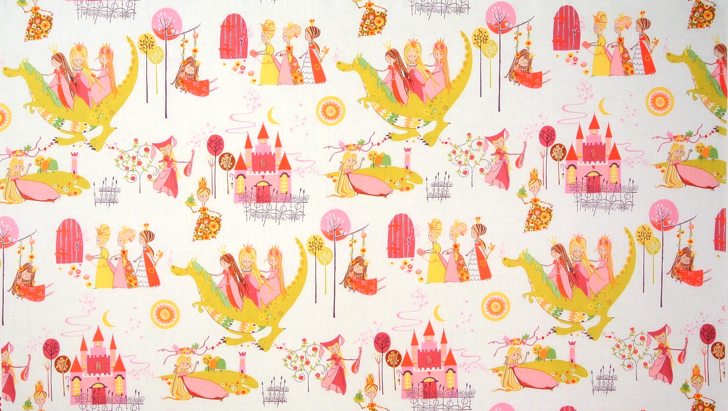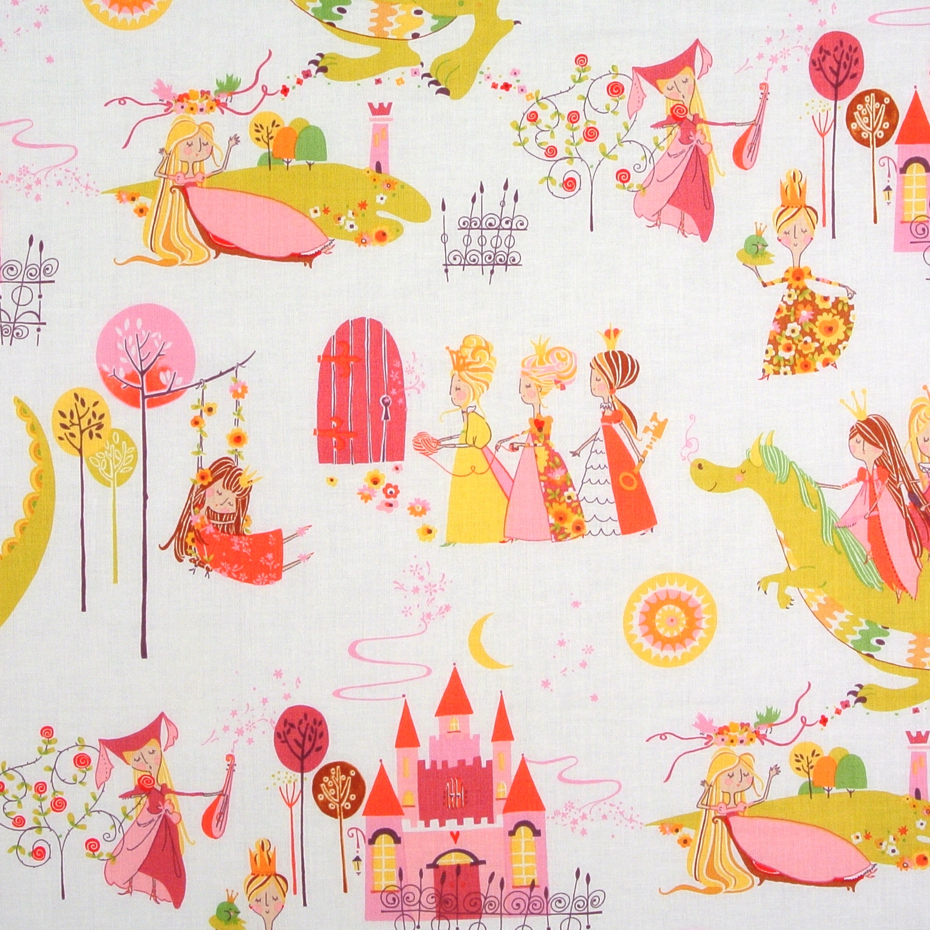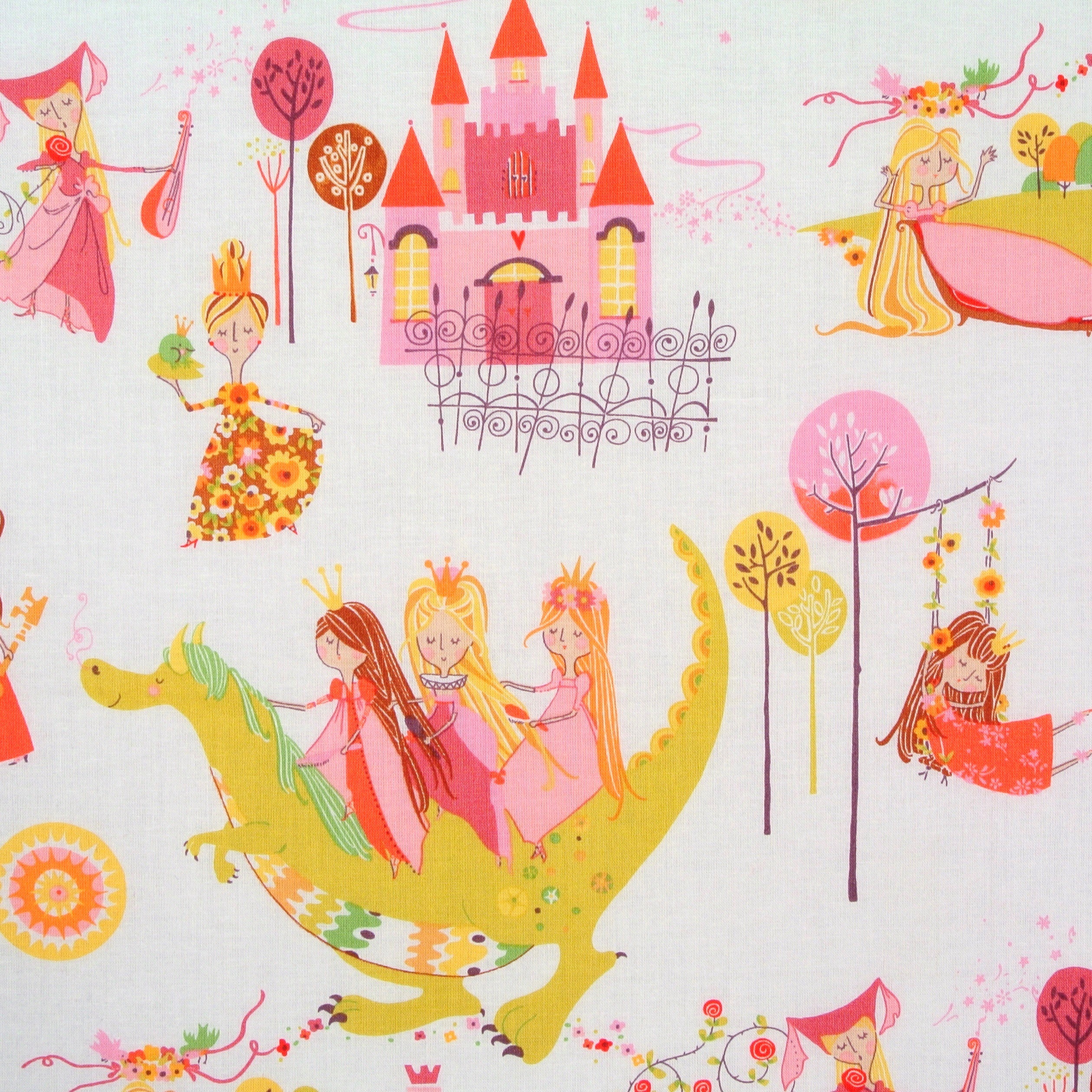 SALE Patchworkstoff mit zauberhaften kleinen Prinzessinnnen, freundlichen Drachen und romantischen Schlössern aus der Serie "Pocket full of Poesies" von Alexander Henry.