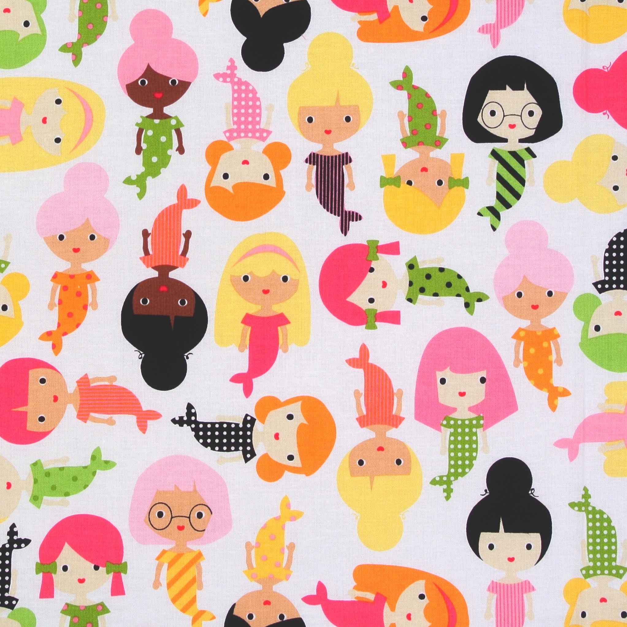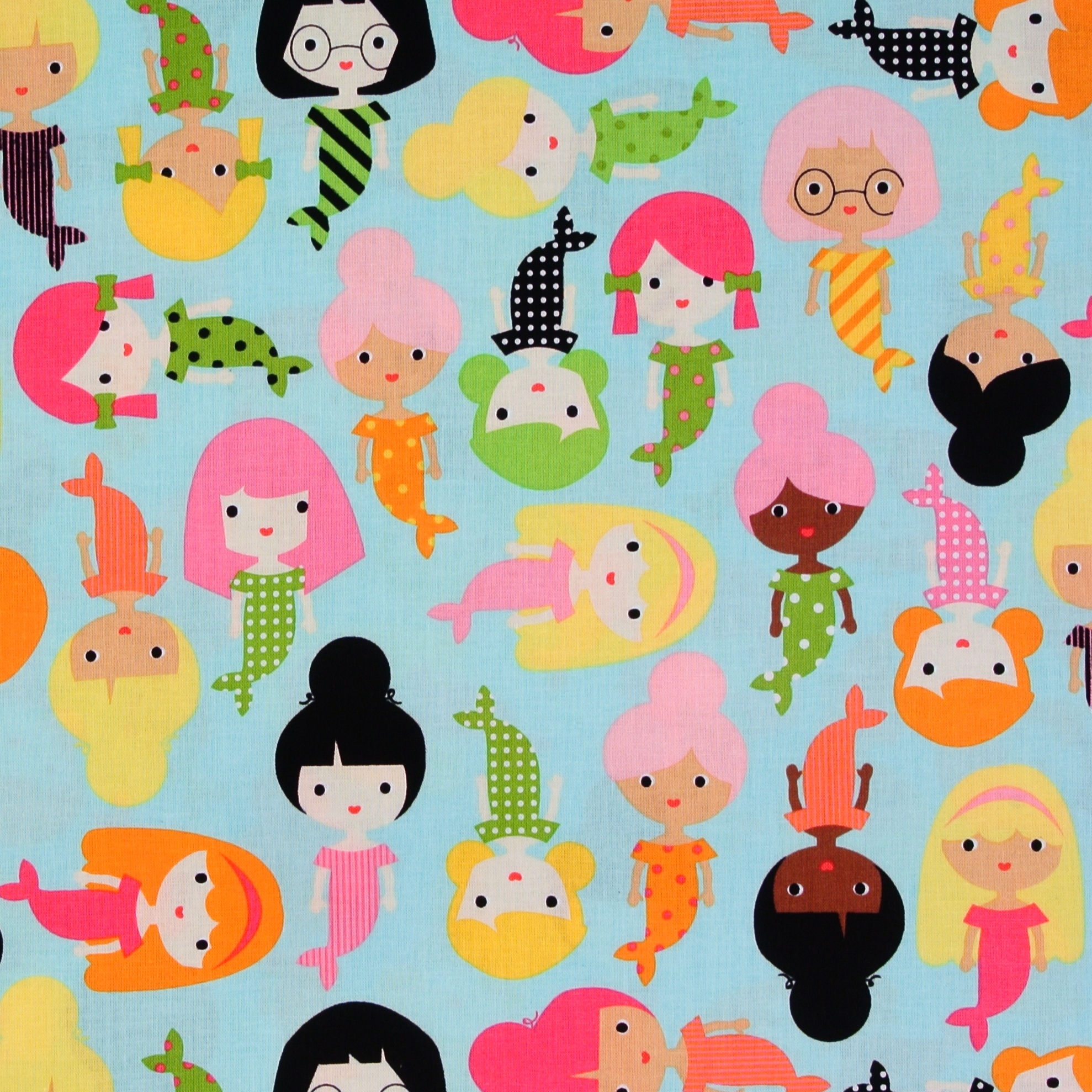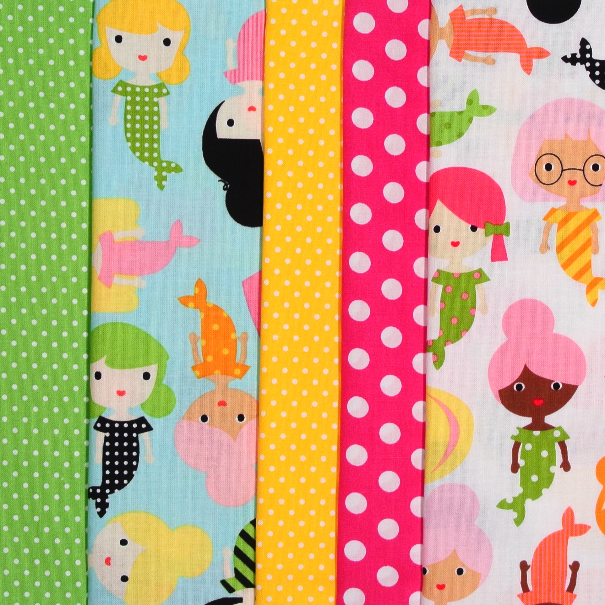 SALE Stoffpaket mit 2 Patchworkstoffen mit Meerjungfrauen aus der Serie "Girl Friends" von Robert Kaufman und 3 Baumwollstoffen mit Pünktchen.