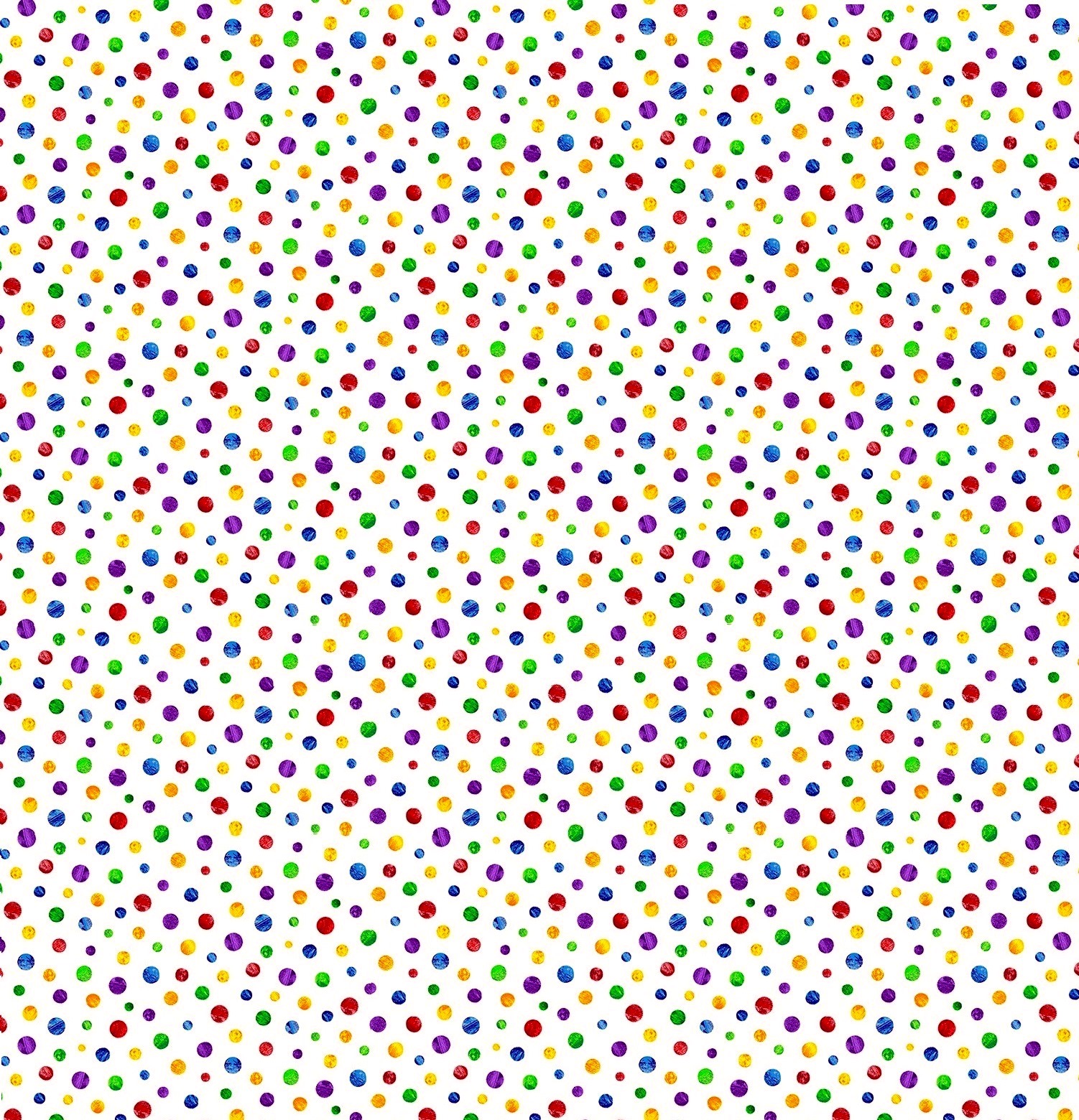 Patchworkstoff mit kleinen bunten Punkten auf Weiß - nach den Motiven aus dem Kinderbuchklassiker "Die kleine Raupe Nimmersatt" von Eric Carle. Wunderschön für Kinderkleidung, Täschchen, Kissen und Dekorationen fürs Kinderzimmer.