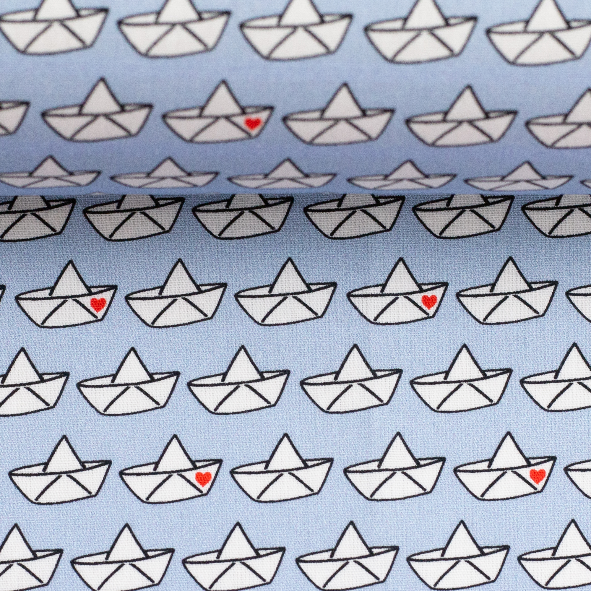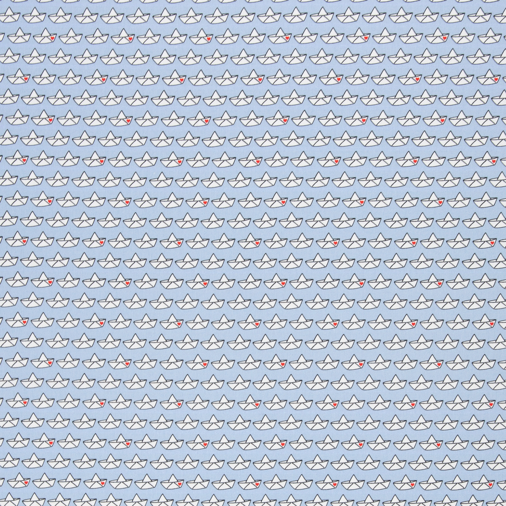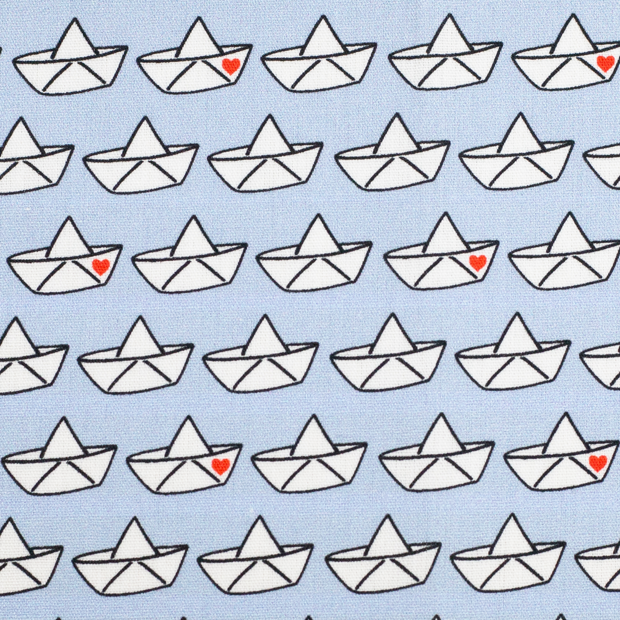 Der Klassiker von Cherry Picking ist wieder da: leichter bedruckter Baumwollstoff mit kleinen Papierbooten und Herzchen auf Hellblau aus der Serie "Love Boot".