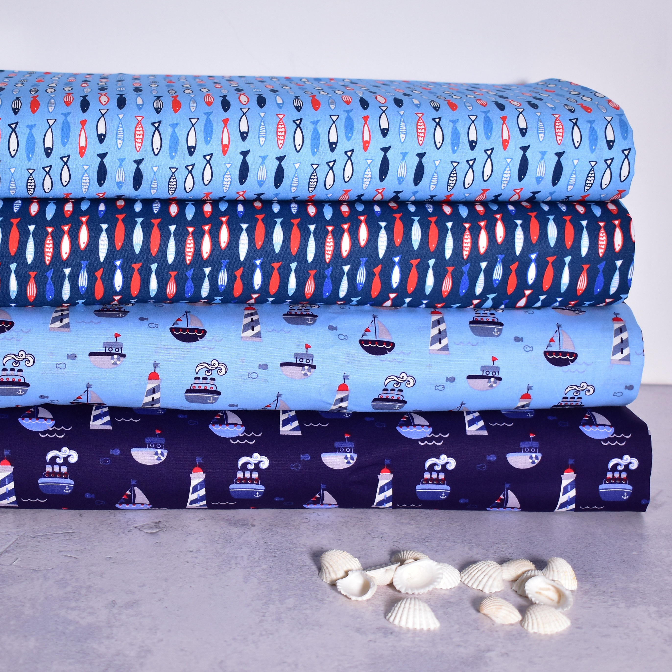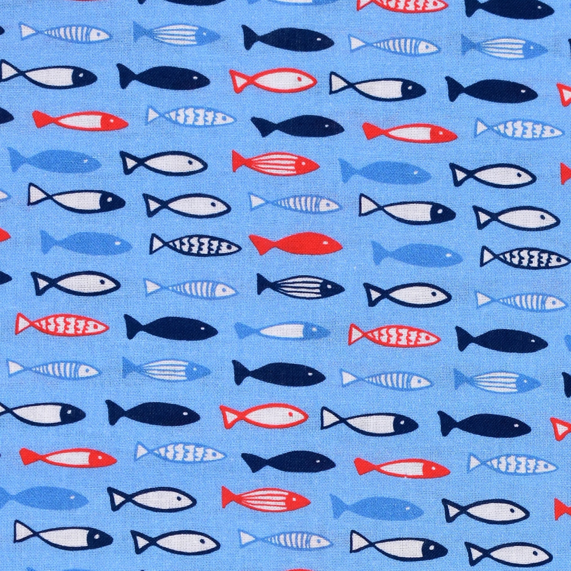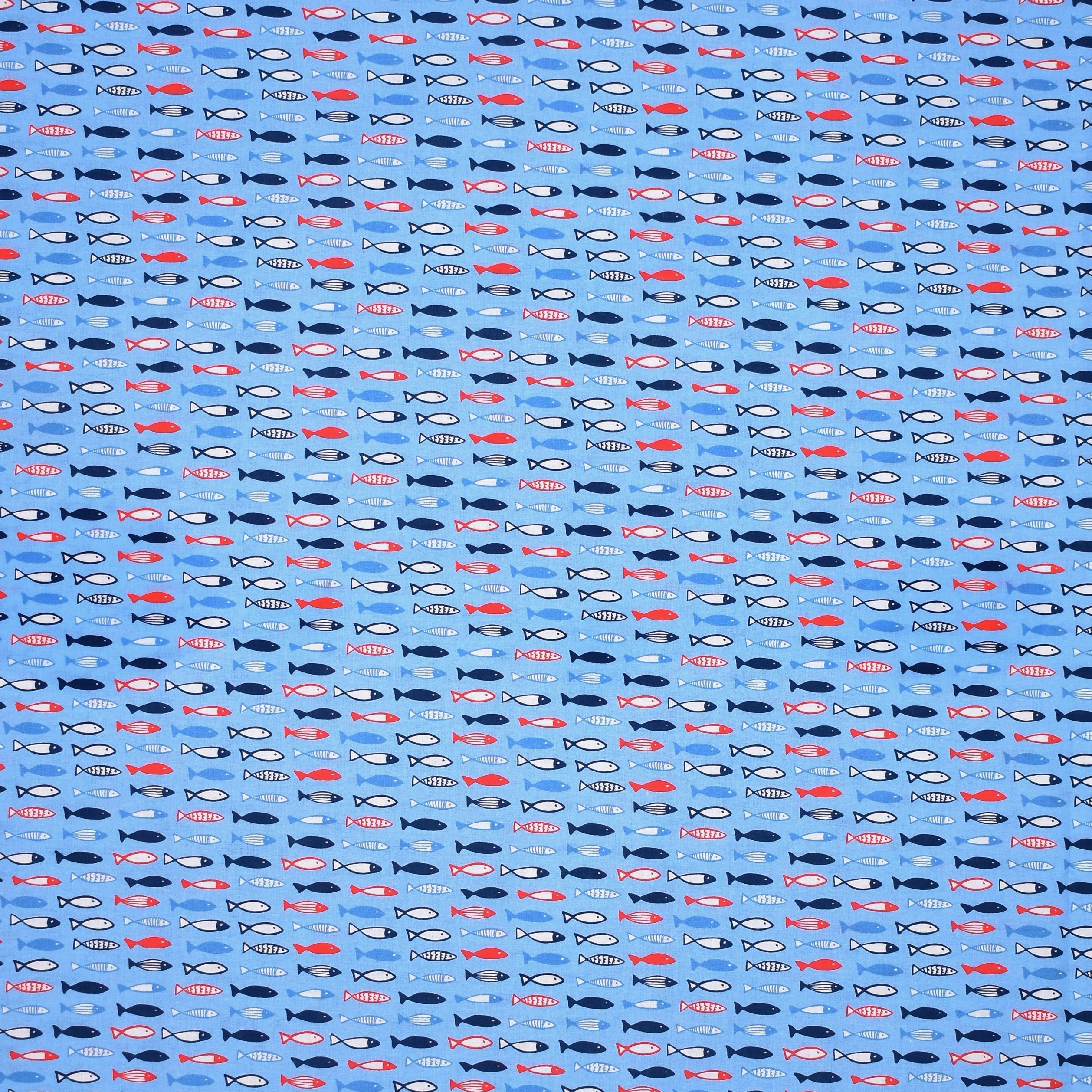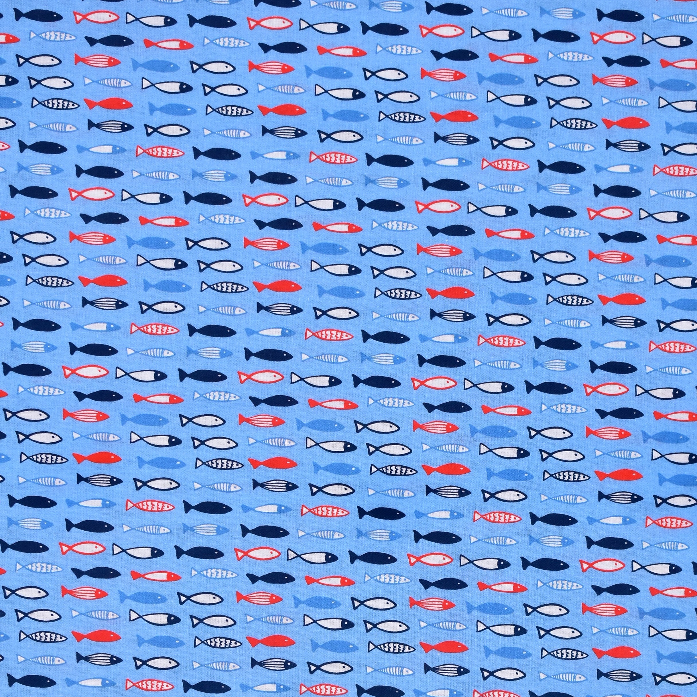 Maritime Motive machen Lust auf den Sommer, auf Sonne, Strand und Meer. Baumwollstoff mit kleinen Fischen auf Hellblau.