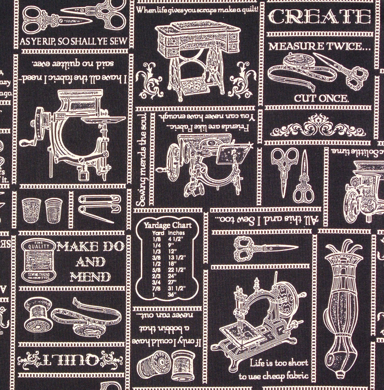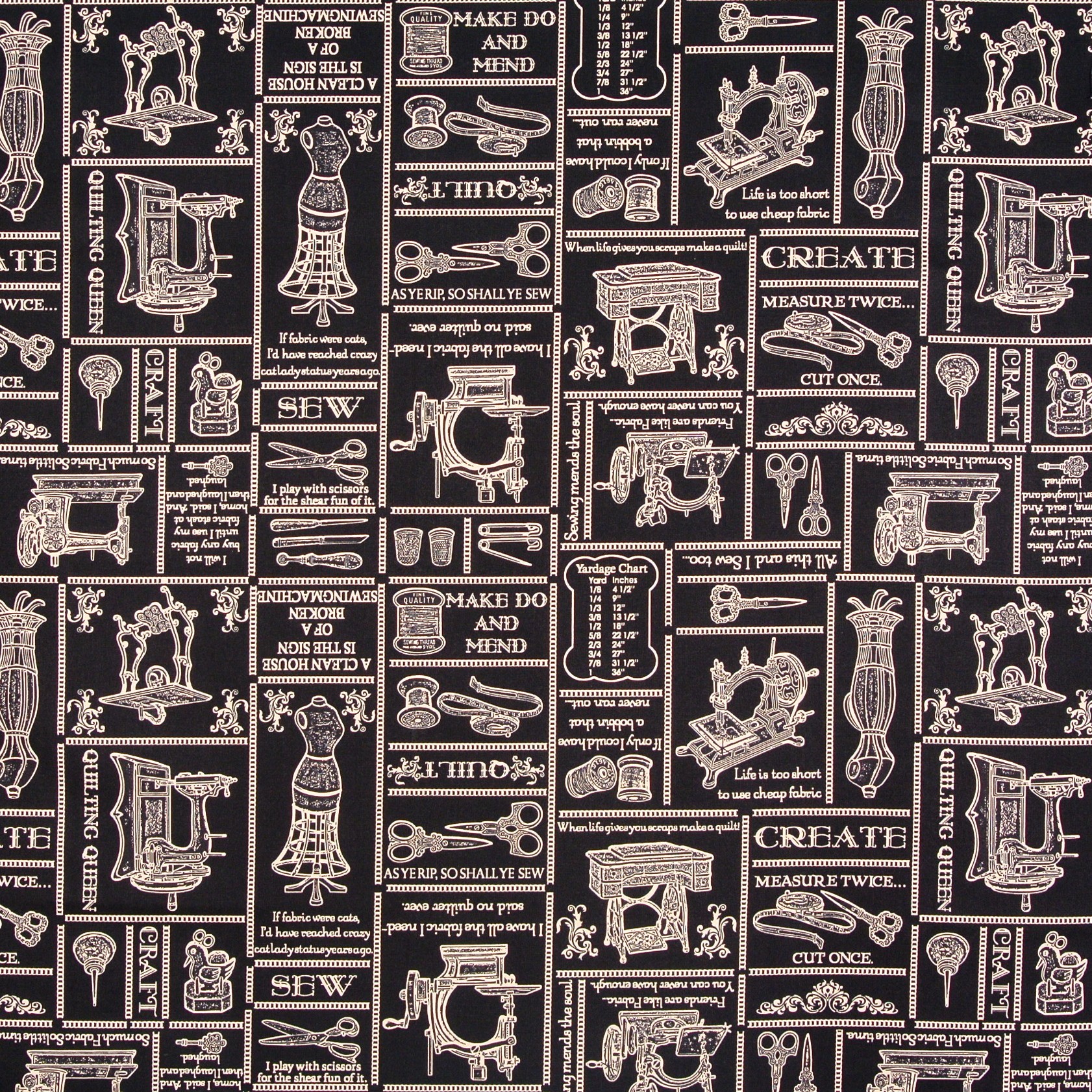 Sale Patchworkstoff im Vintage-Stil mit nostalgischen Nähutensilien und Sprüchen rund ums Nähen auf Schwarz aus der Serie "Thimble Pleasures".