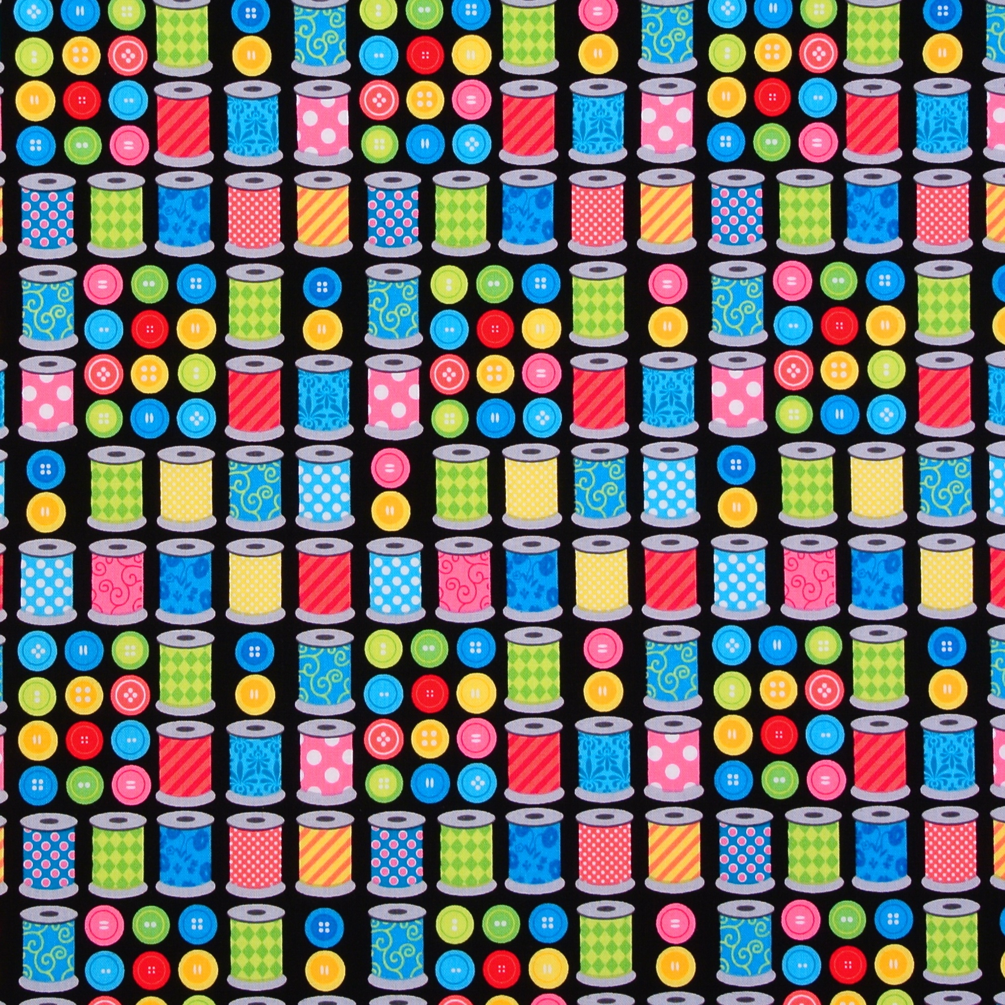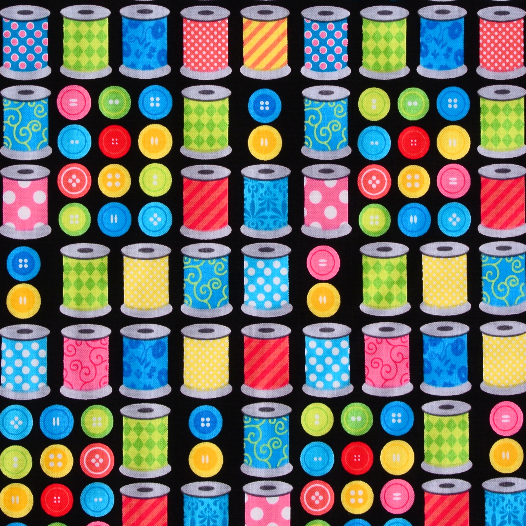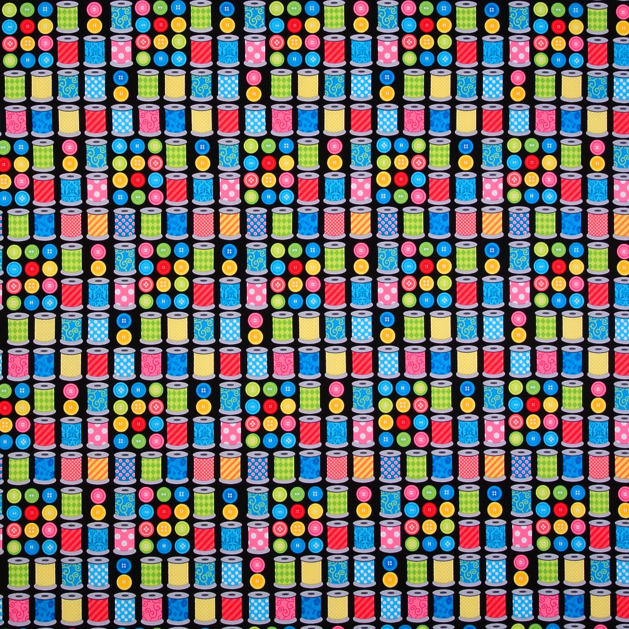 SALE Patchworkstoff  mit vielen bunten Garnspulen und Knöpfen. Die Garnspulen verlaufen quer und parallel zu den Schnittkanten.