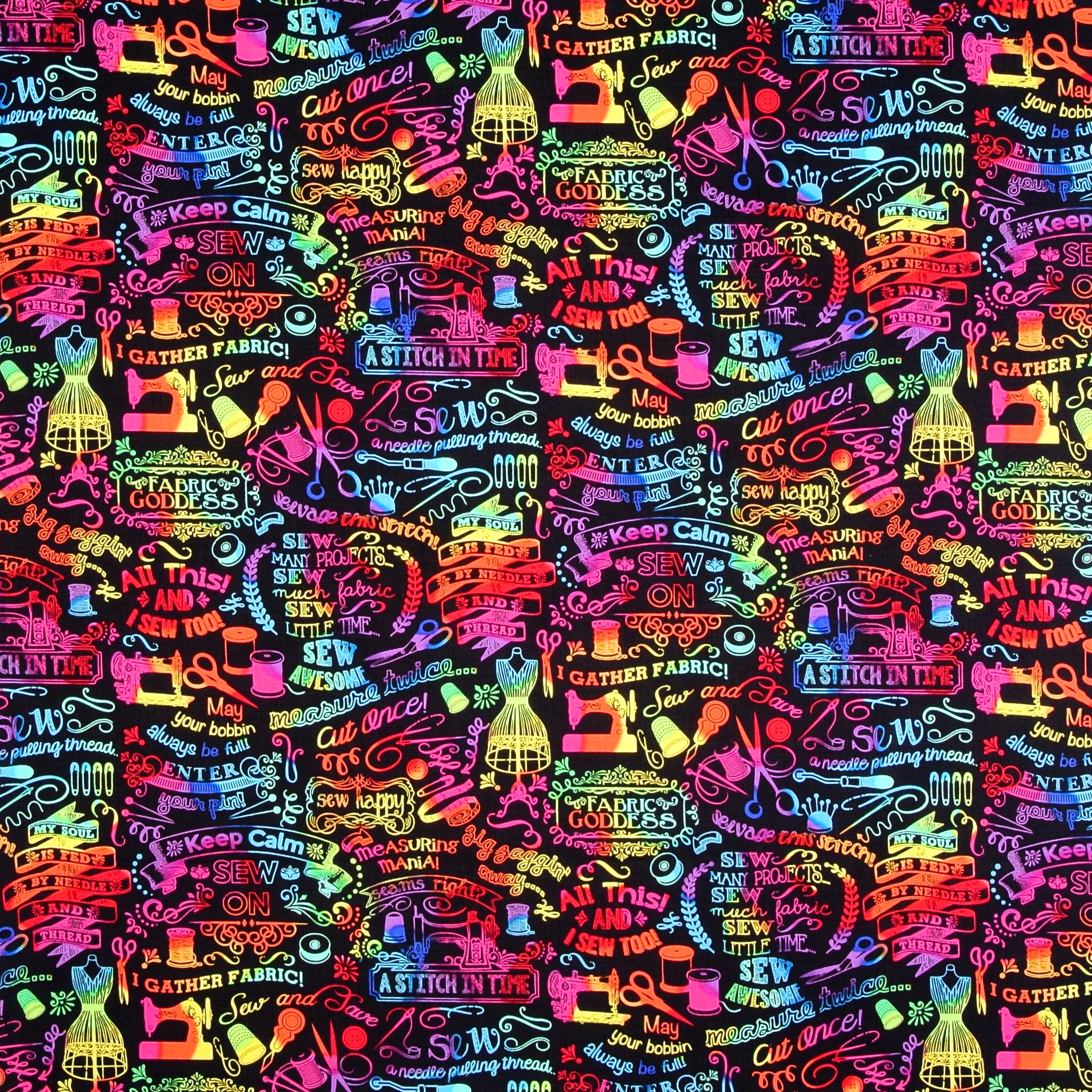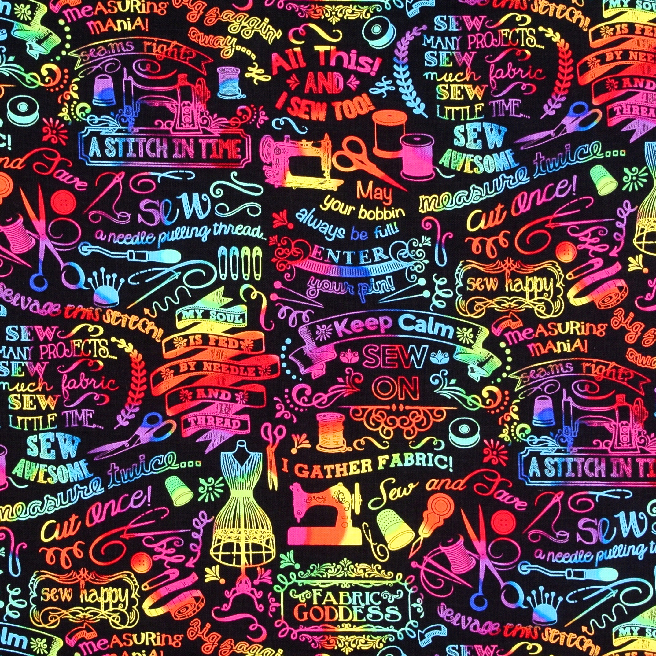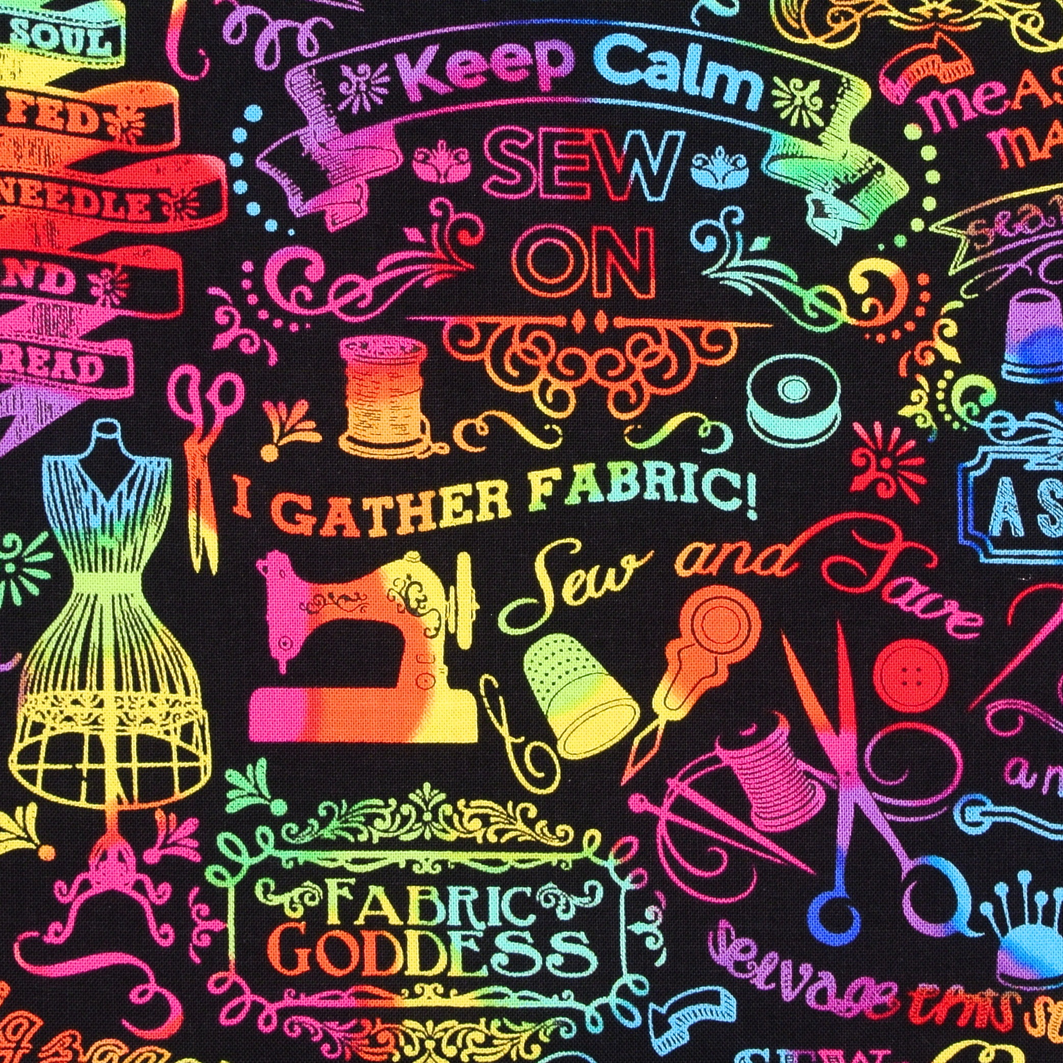 Wie ein Regenbogen: ausgefallener Patchworkstoff mit herrlich bunten Schriftzügen und Nähutensilien aus der Serie "Sewing Words".