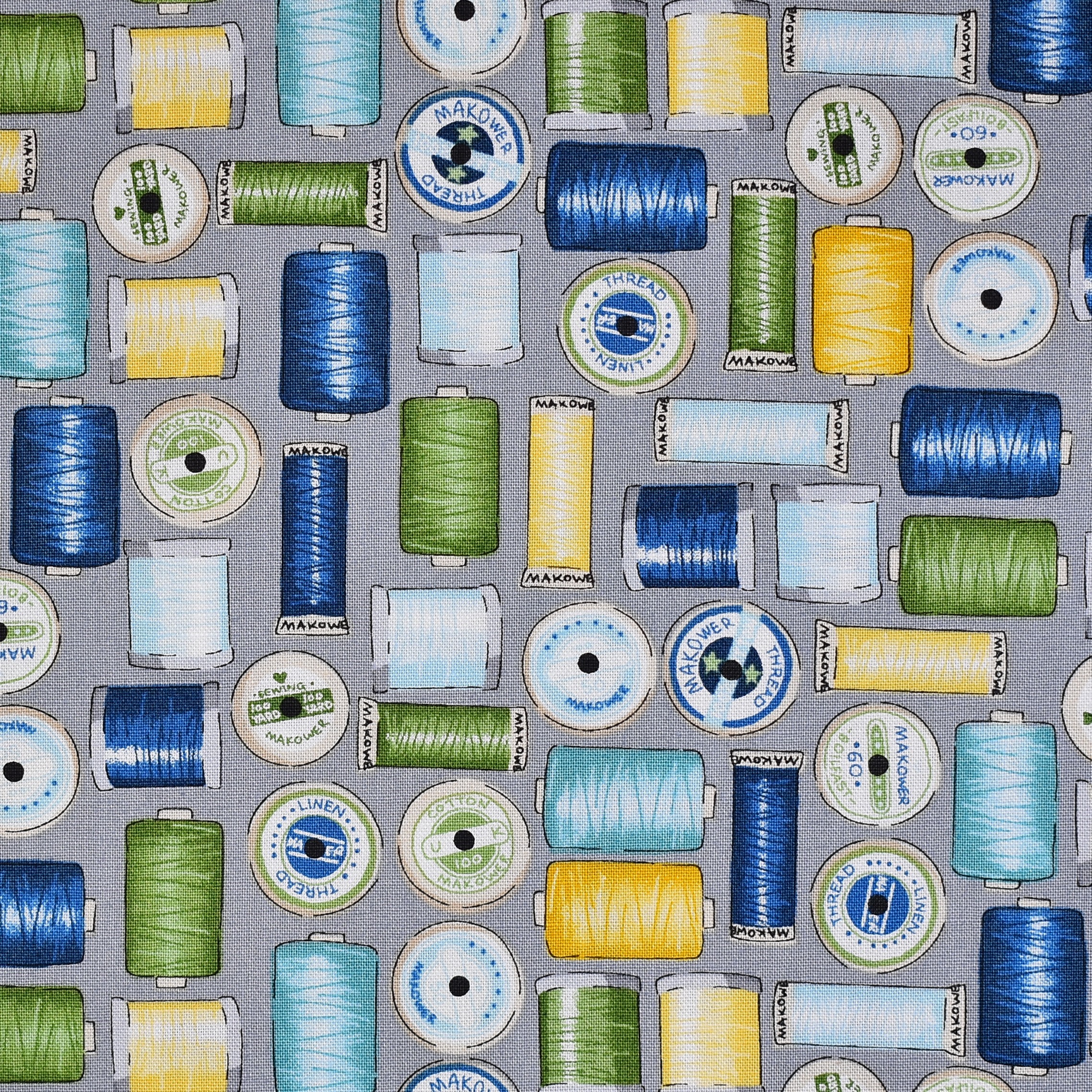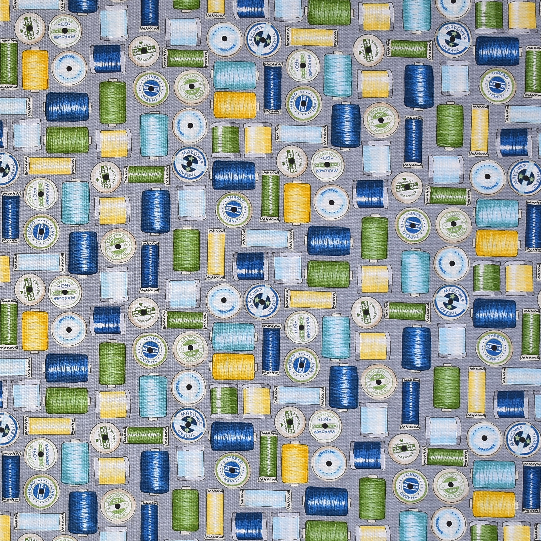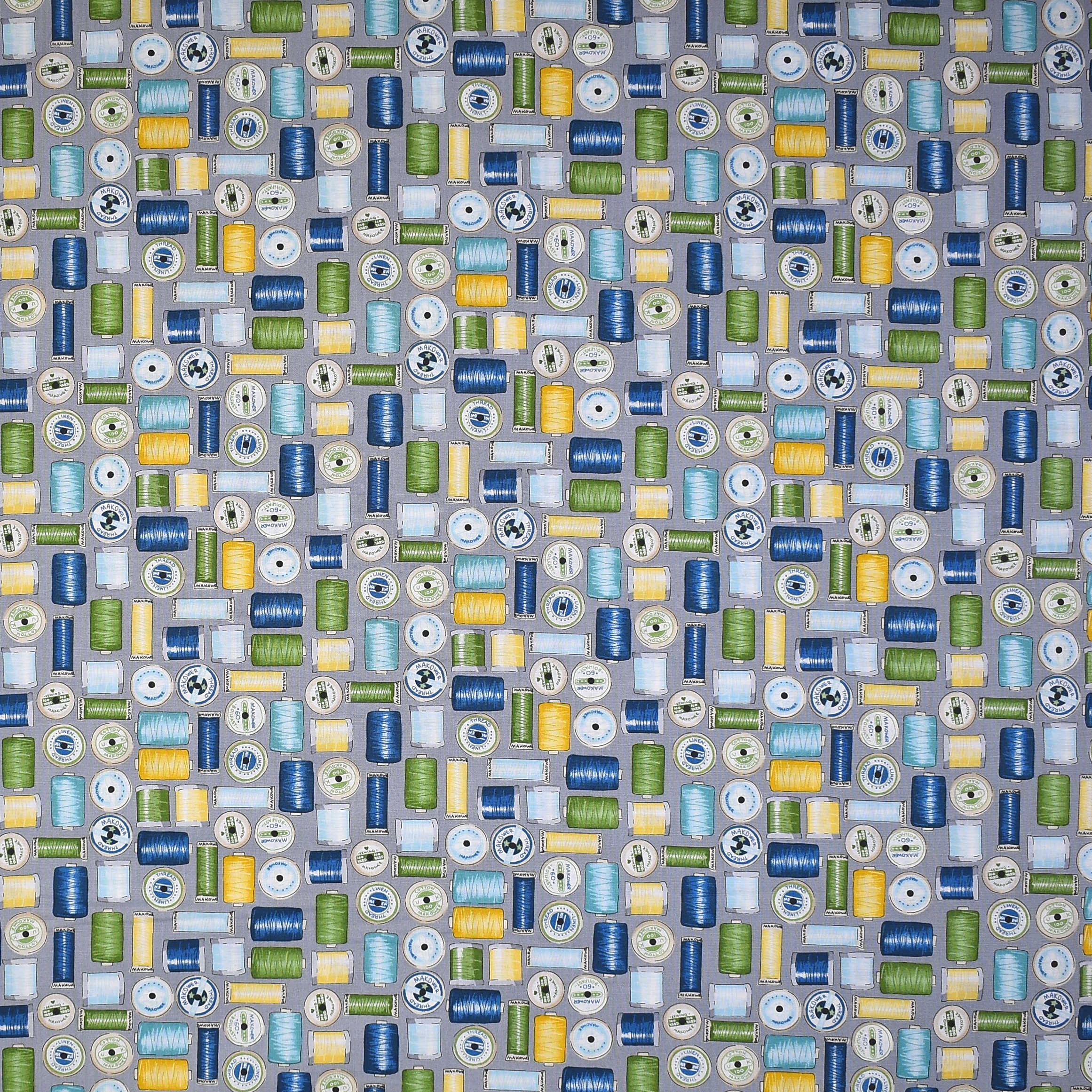 Patchworkstoff bedruckt mit vielen Garnrollen in Blau, Grün und Gelb auf Hellgrau der Serie "Sewing Room".