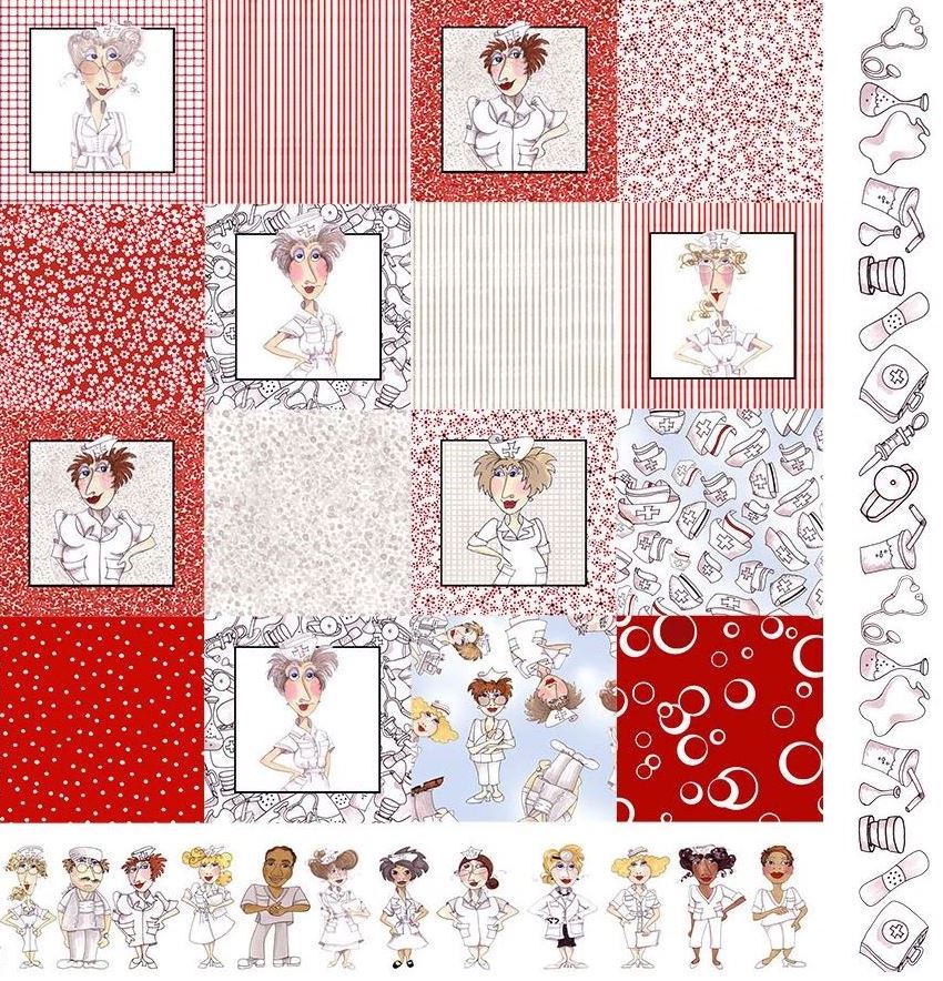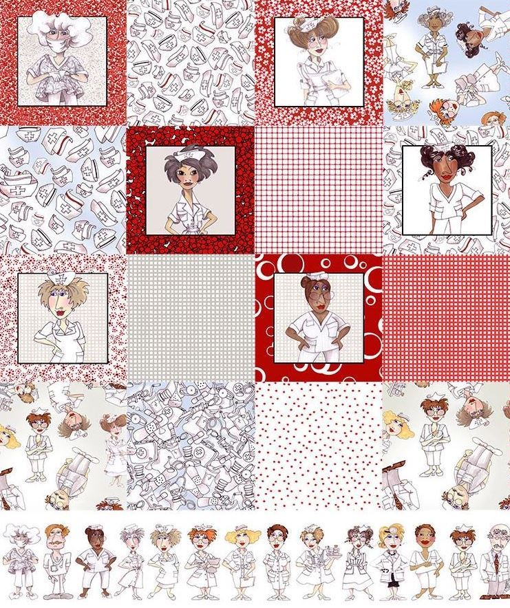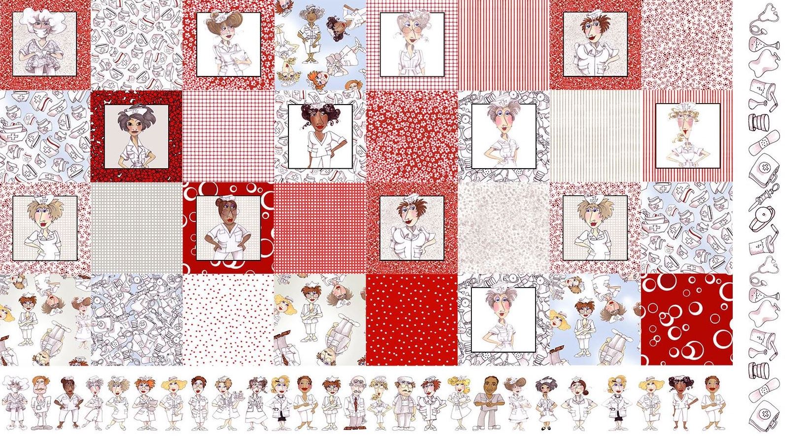Großes Patchworkpanel mit einem Medley aus selbstbewußten, patenten Krankenschwestern und einem Mustermix zum Kombinieren aus der Loralie-Serie "Nifty Nurses". Ein ausgefallener Patchworkstoff rund um das medizinische Personal im Krankenhaus.