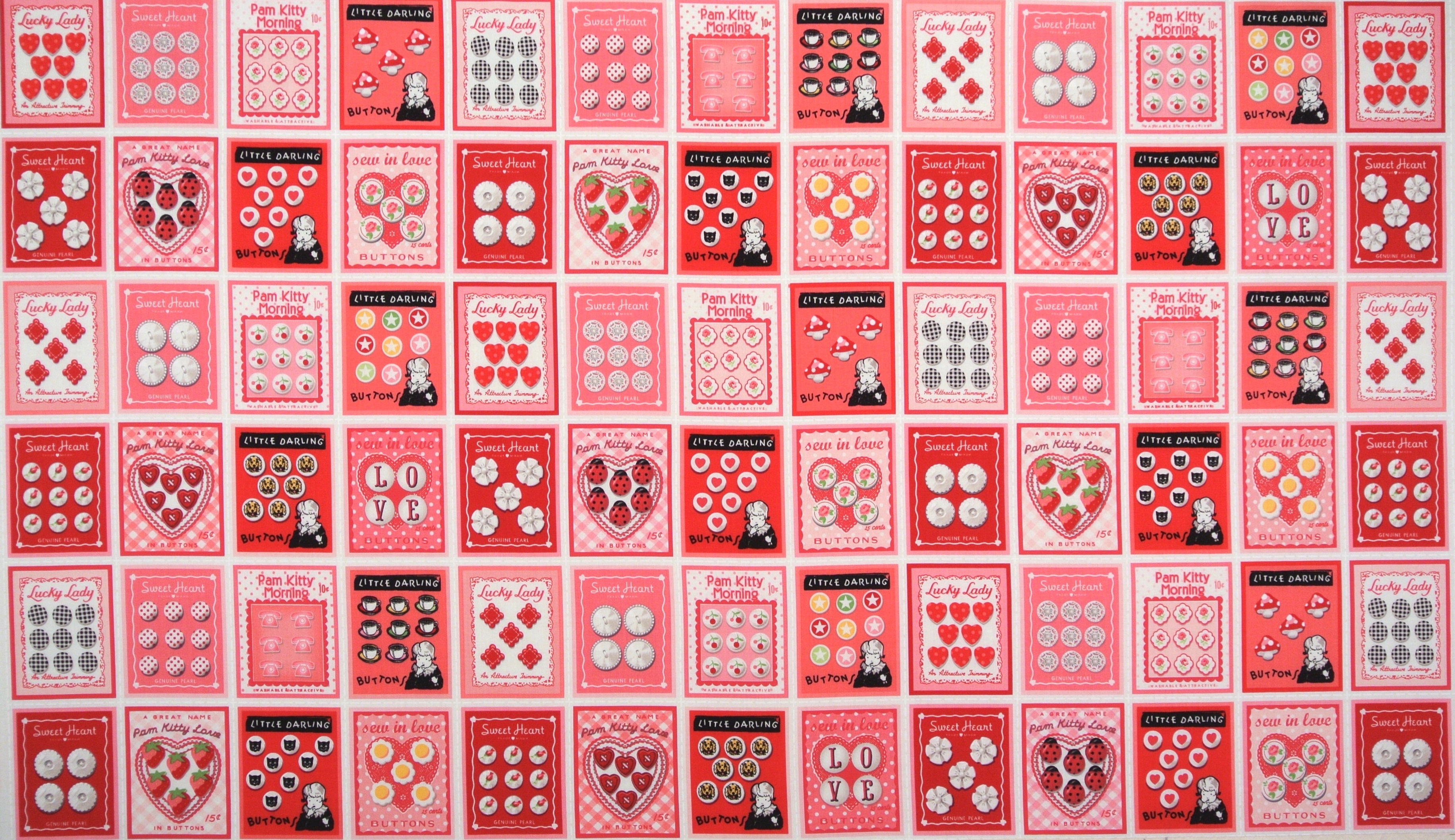 Patchworkpanel im Retrolook mit vielen kleinen Bildern mit Knopfkarten aus der Serie "Pam Kitty Buttons" von Holly Holderman für Lakehouse.