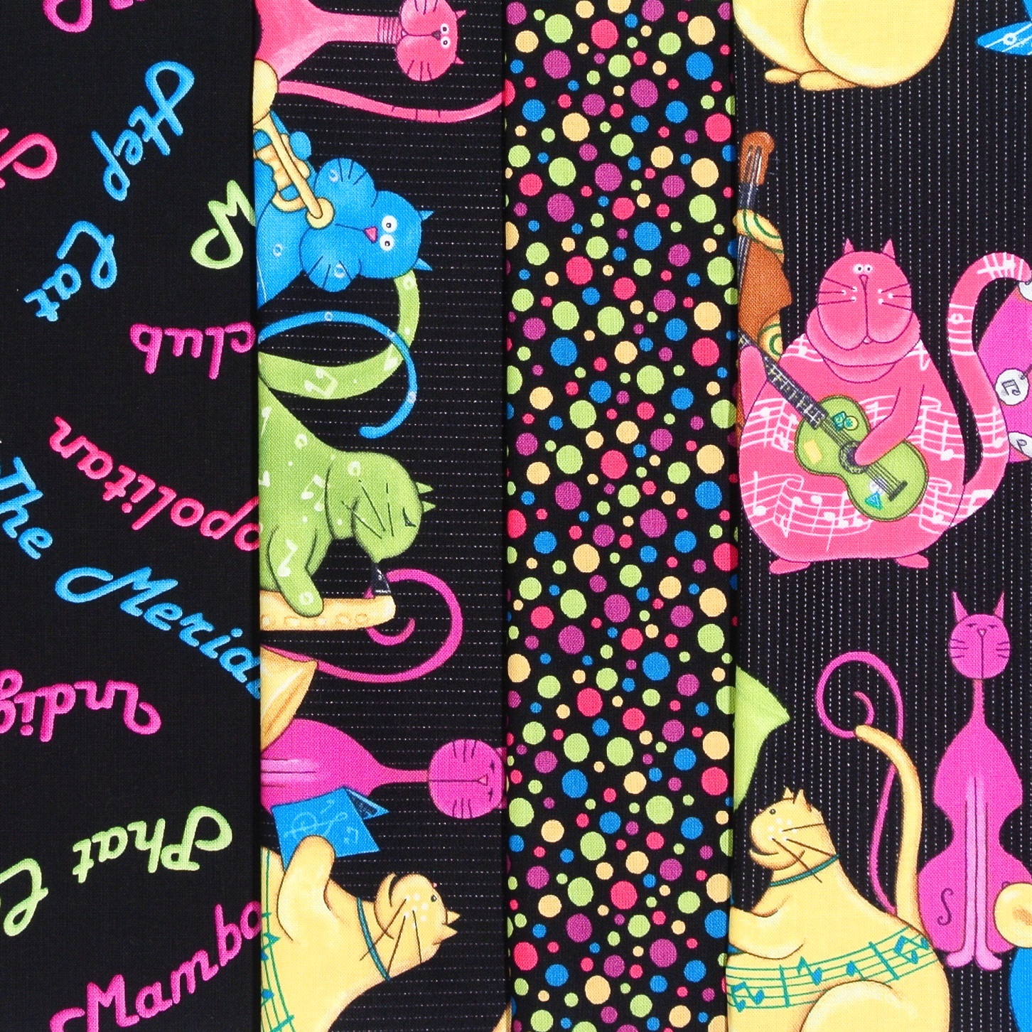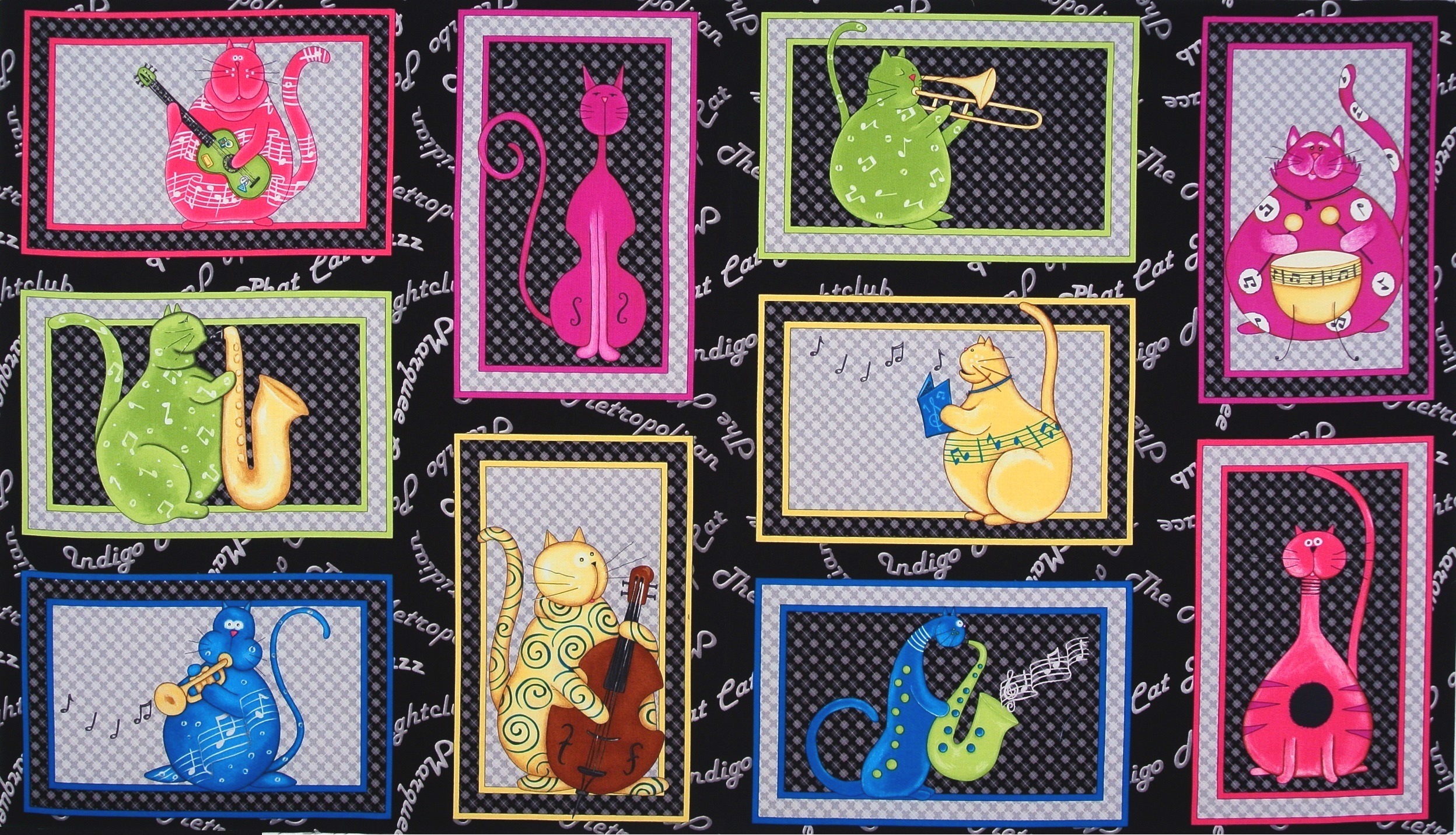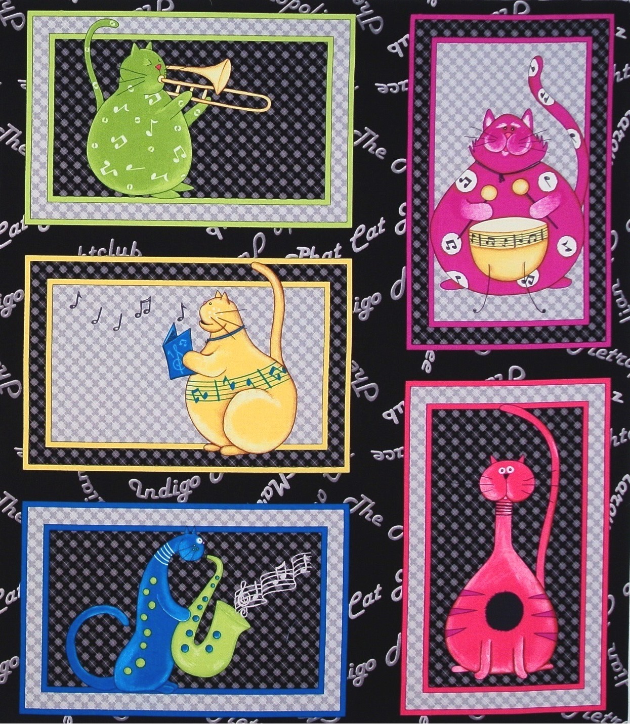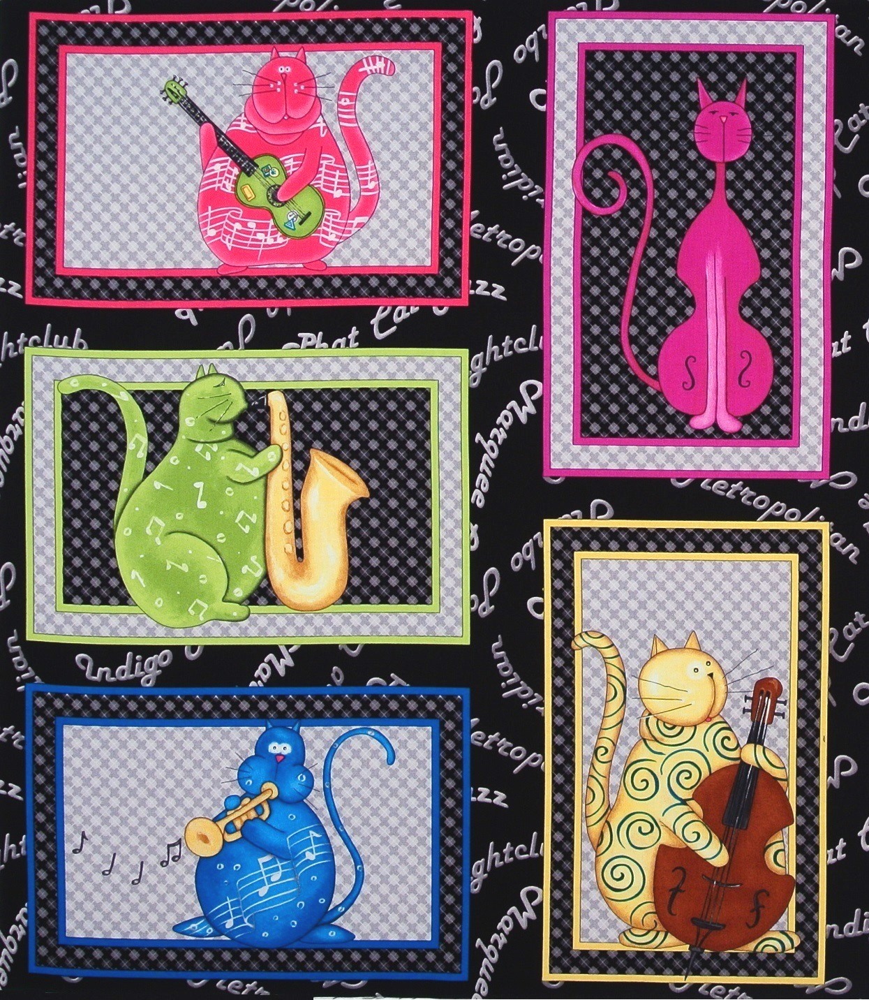 Grosses Patchworkpanel mit jazzspielenden, wohlgenährten Katzen aus der Serie "Phat Cat Jazz".