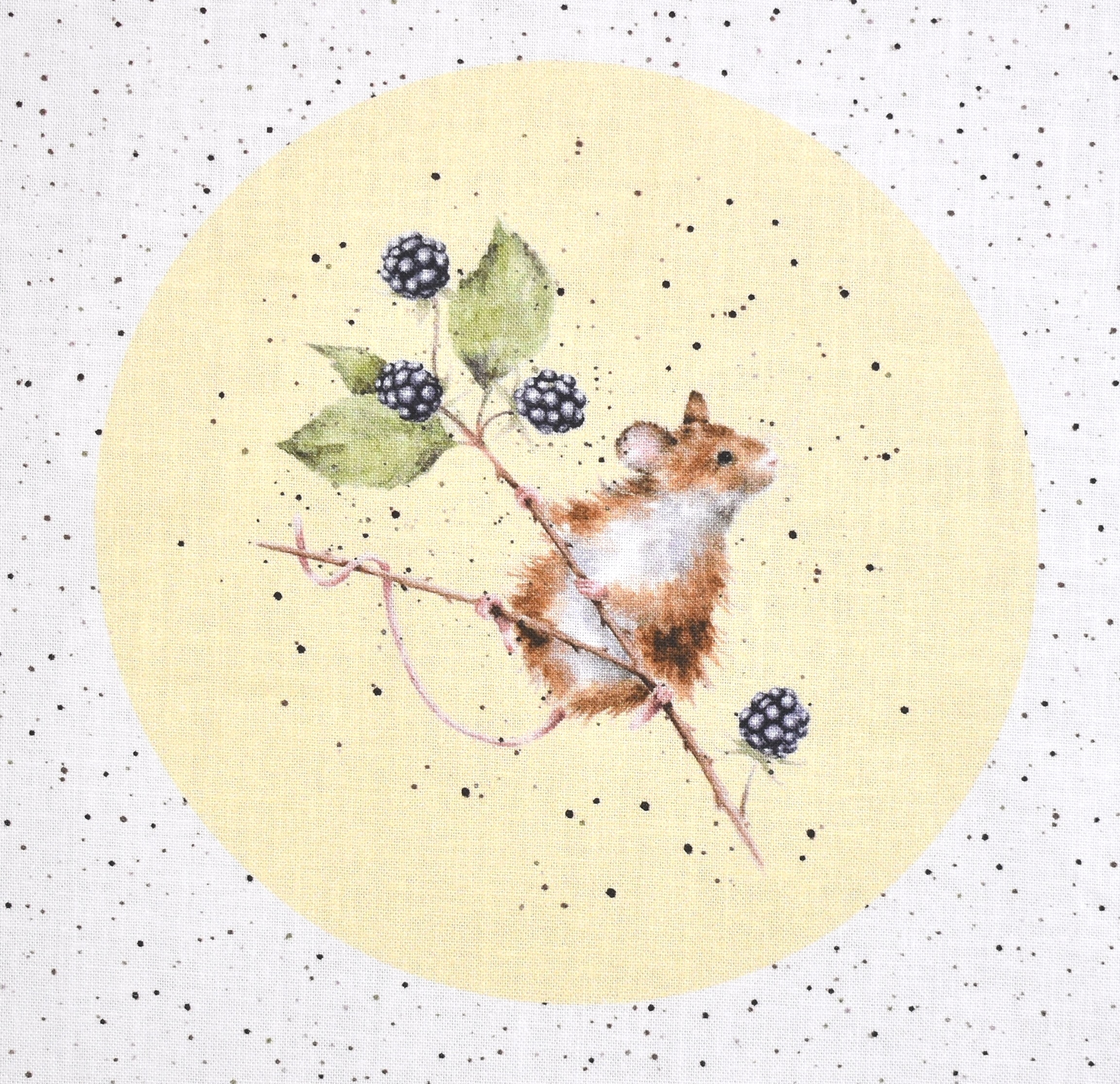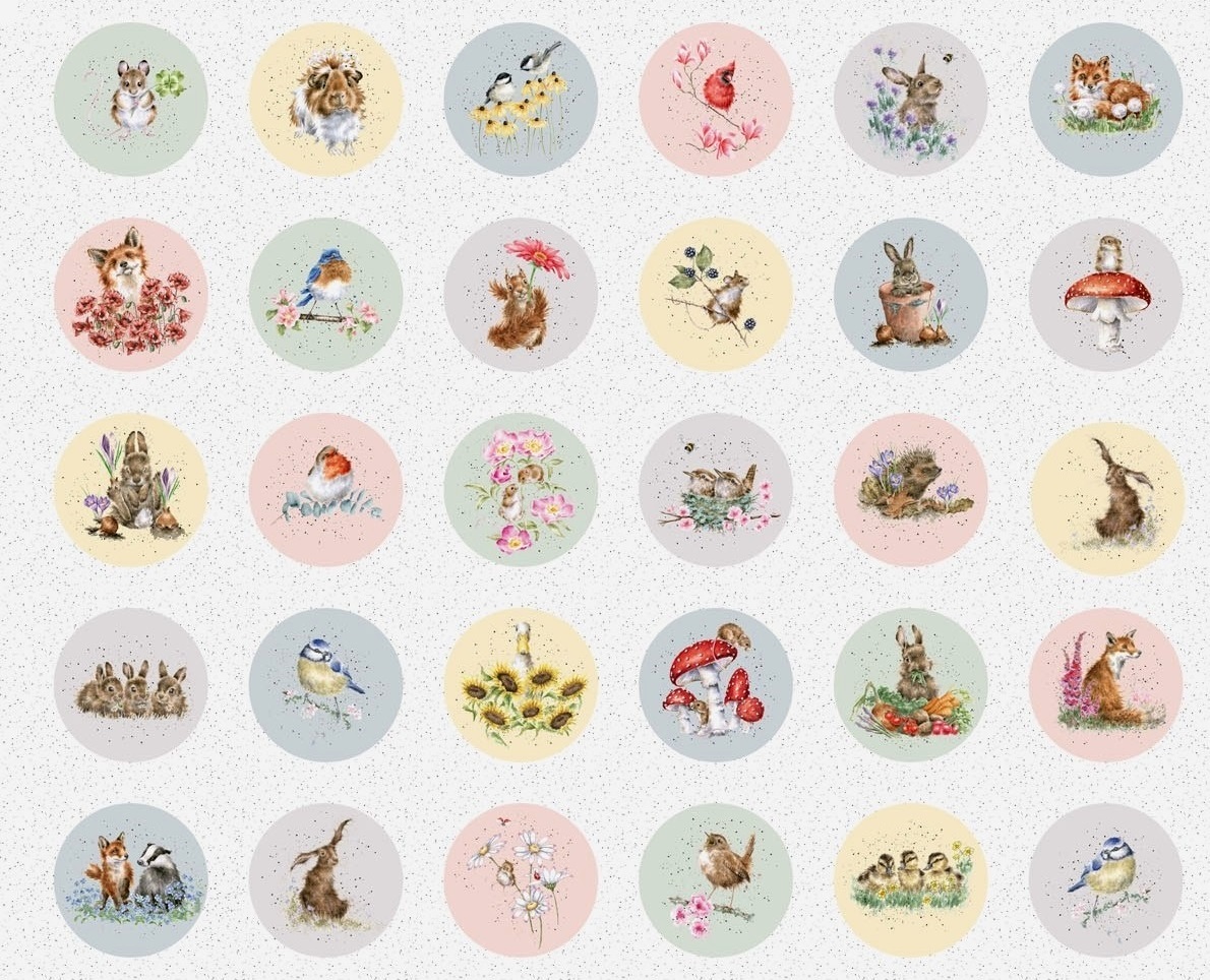 Bezauberndes großes Patchworkstoff-Panel (0,90 m) mit kleinen Tierkindern in runden Bildern aus der Reihe "Bramble Patch".